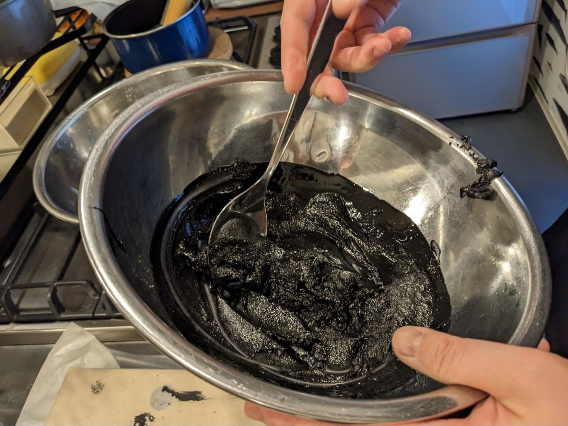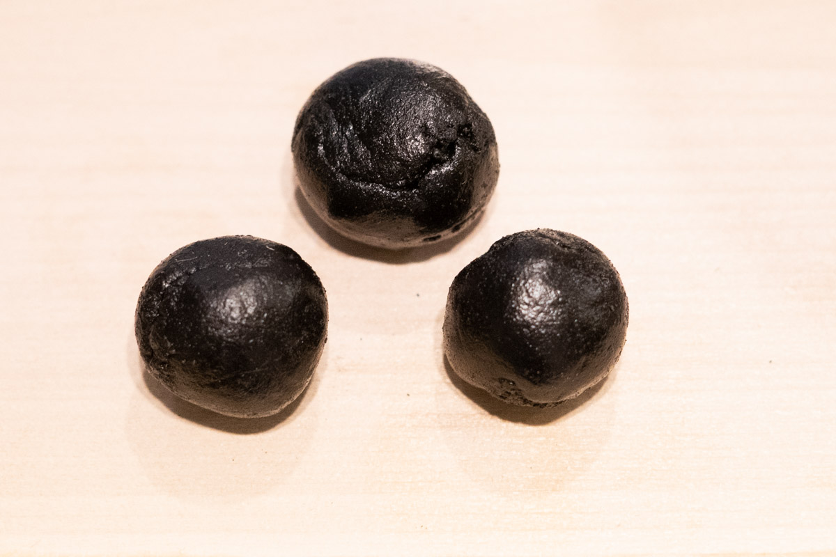 Daraufhin habe ich versucht, damit es dem Hyourougan etwas näher kommt, das Surimitsu mit schwarzer Lebensmittelfarbe zu färben. Da das kalte Surimitsu aber teuflisch hart ist, erwies sich dies als äußerst mühsam. Ich empfehle euch also, die Lebensmittelfarbe vor dem Erhitzen hinzuzufügen.