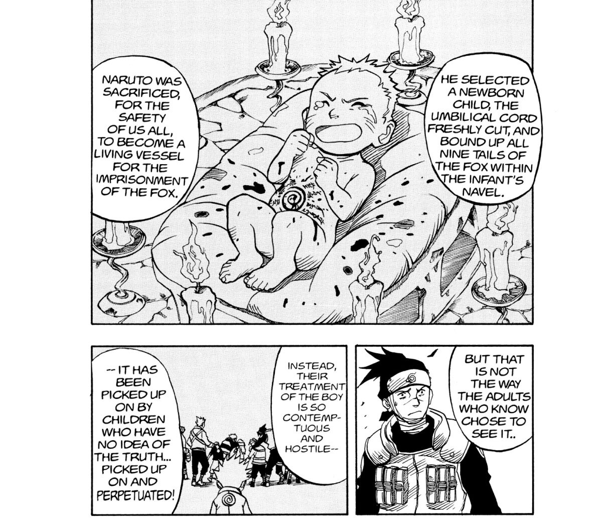 Zu diesem Zeitpunkt kann dies als ein Element angesehen werden, das Naruto mit amerikanischen Ninja-Filmen gemeinsam hat, aber ich glaube, dass sich diese Motivation in der Mitte der Geschichte verändert. In der zweiten Hälfte der Geschichte hat man das Gefühl, dass Narutos Motivation, Hokage zu werden, sich zu einem auf dem Wunsch zur Rettung seines Dorfes basierenden, altruistischen Motiv wandelt.