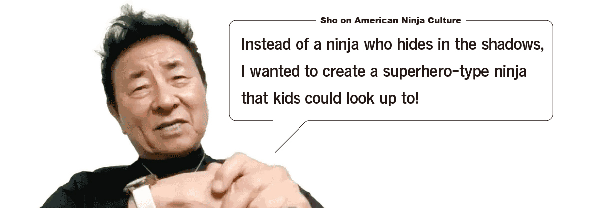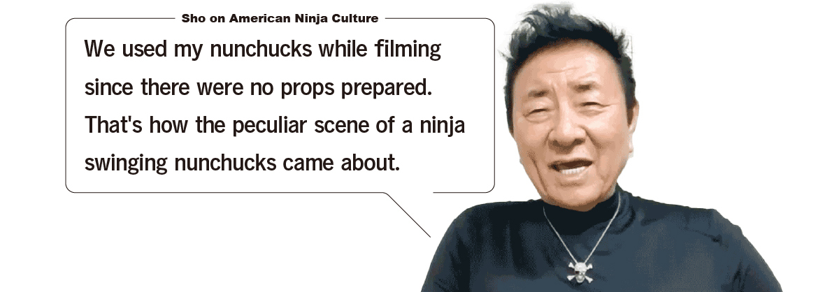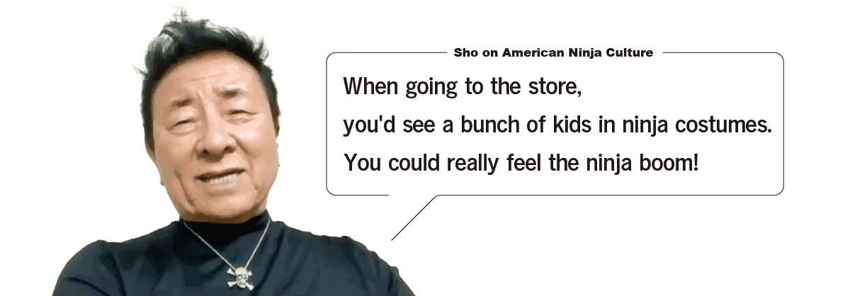 Sho: Ja, das ist richtig. Die von meiner Firma hergestellten Ninja-Kostüme verkauften sich als Halloween-Verkleidung wie warme Semmeln, und auch Spielzeug-Shuriken aus Gummi waren sehr in Mode. In Städten in den ganzen USA sprossen Ninja-Kampfschulen wie Pilze aus dem Boden, verschiedene Zeitschriften zum Thema Ninja wurden herausgegeben, und, was immer man davon halten mochte, das Phänomen "Ninja" durchsättigte die amerikanische Gesellschaft, bis schließlich allen das Wort "Ninja" ein Begriff war.