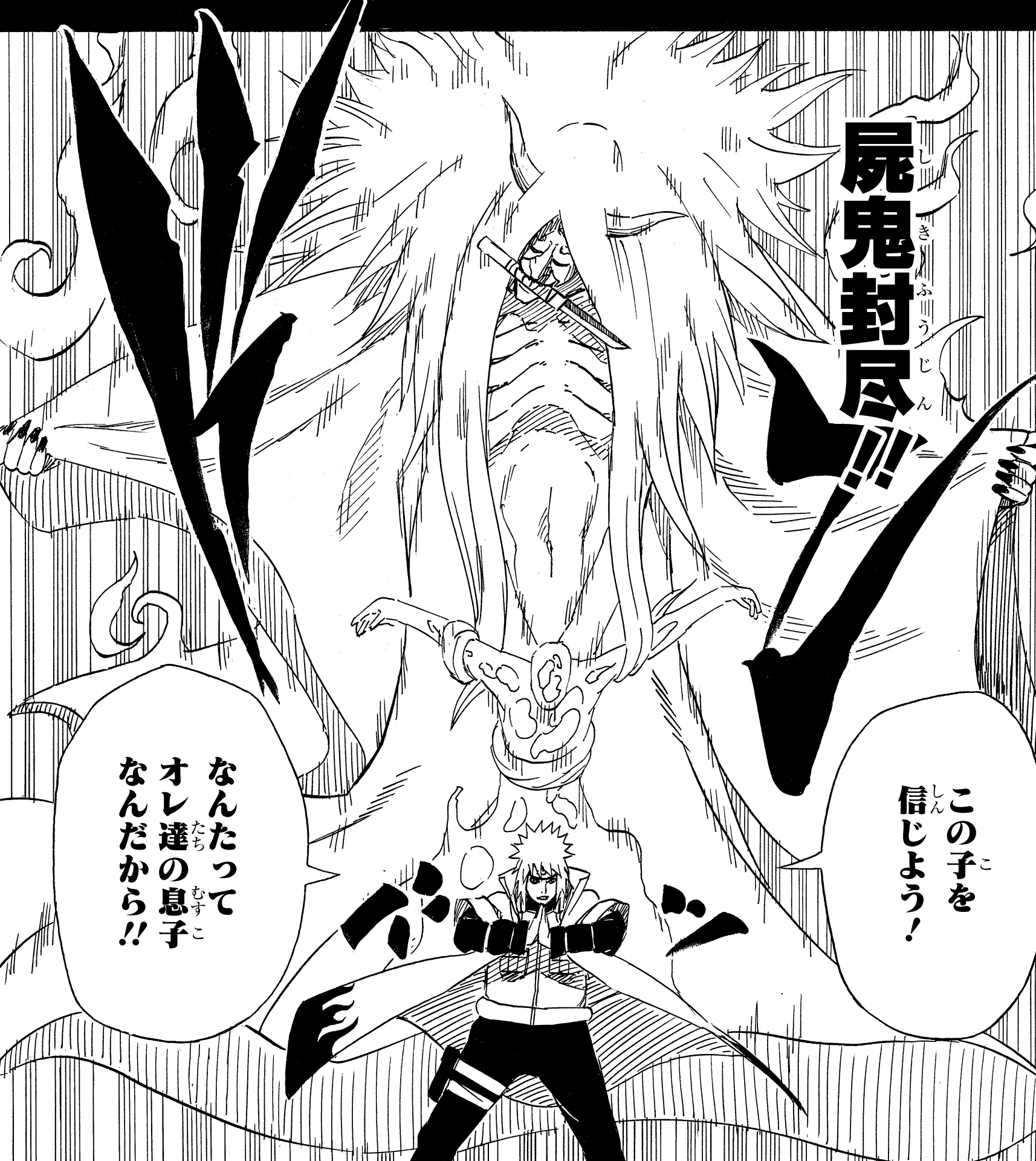Als der aus Kushina entkommene Neunschwänzige Konoha angriff, fasste Minato, Narutos Vater, einen Entschluss ...