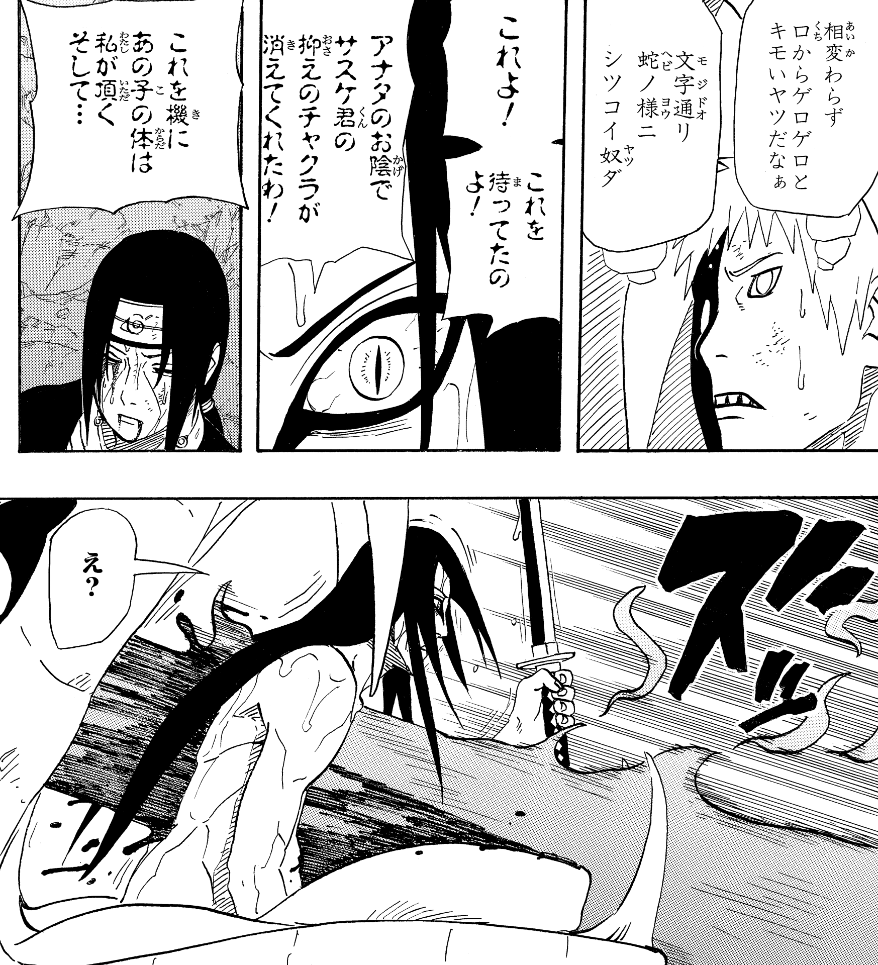 Sasuke hat den Moment abgewartet, in dem Orochimaru am schwächsten ist, um ihn überraschend anzugreifen.