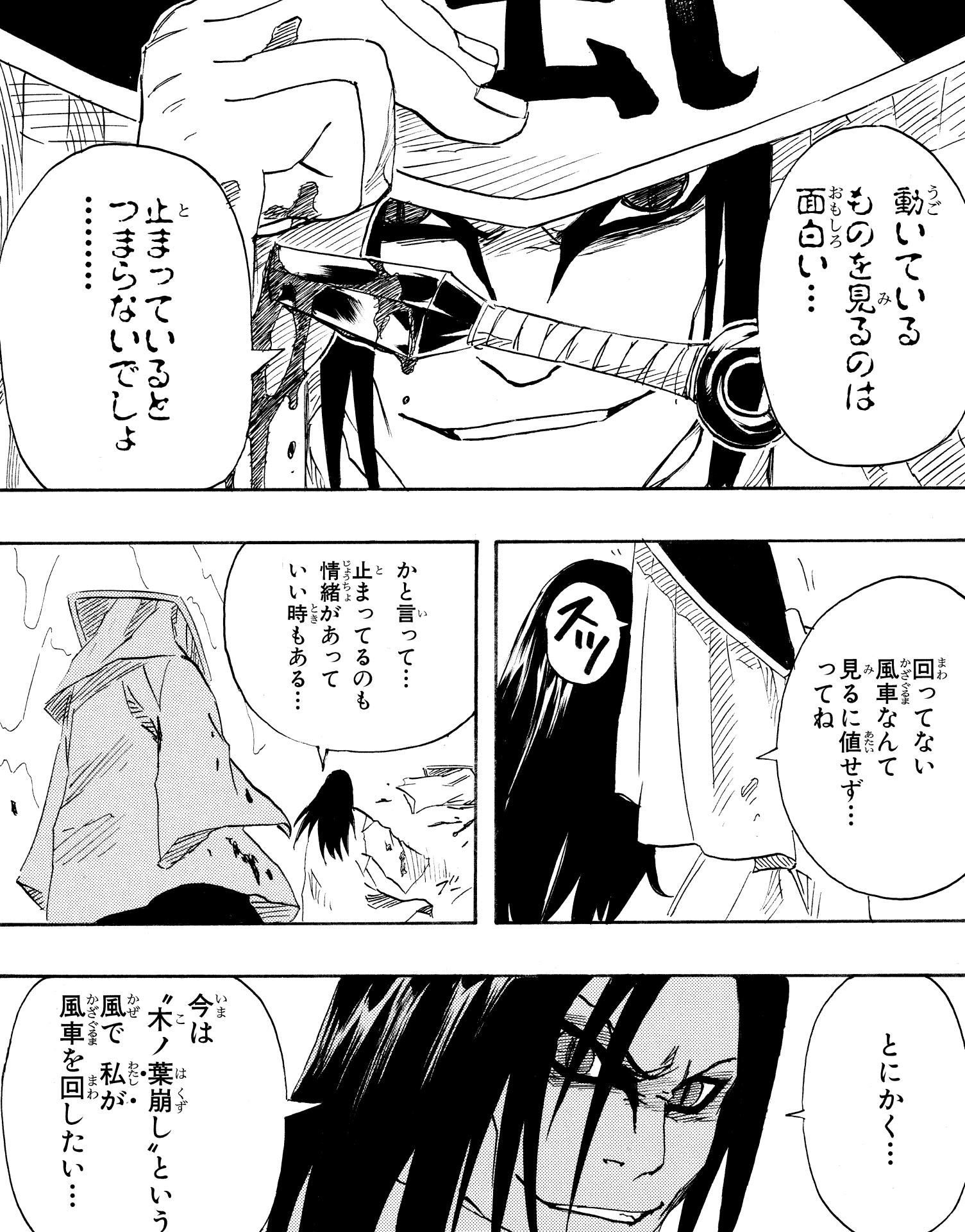 Da Orochimaru erkannt hat, dass Kabuto gescheitert ist, weil er diese Lebensweise nachgeahmt und verinnerlicht hatte, entschließt er sich über Sasuke, der einen anderen Weg als er selbst geht, zu wachen. Und auch über das von Sasuke verursachten "Wind" bewegte "Windrad".