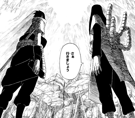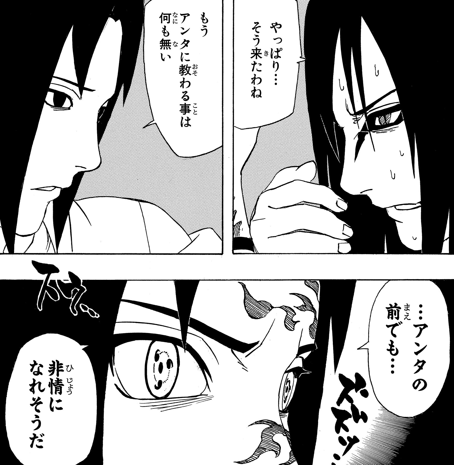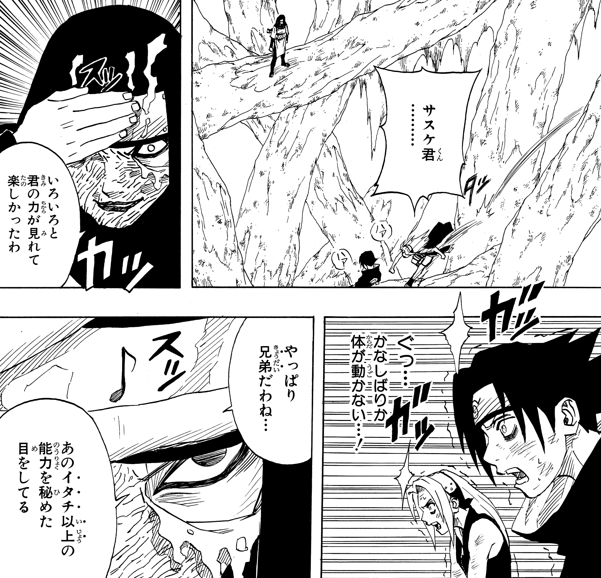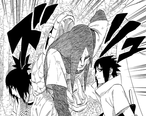 Er nutzt die Gelegenheit, in der Sasukes Chakra am Boden ist und die ihn kontrollierende Kraft geschwächt, um wieder aufzuerstehen.