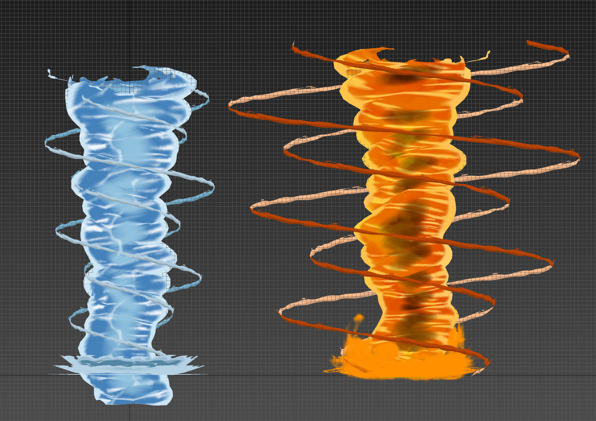 Wir haben auch ihr Aussehen an jedes Element angepasst. Auf ihrer Basisebene haben ein „Wassertornado“ und ein „Feuertornado“ eine ähnliche Form, aber der Wassertornado weist Wassermuster im Wind und vom Boden ausgehende Spritzeffekte auf, während der Feuertornado das gesamte Gebiet erleuchtet und dies auch tut Effekte wie Funken, Asche und Verkohlung. Unser Ziel war es, Tornados zu schaffen, die sich neben anderen Wasser- oder Feuerangriffen zu Hause fühlen.