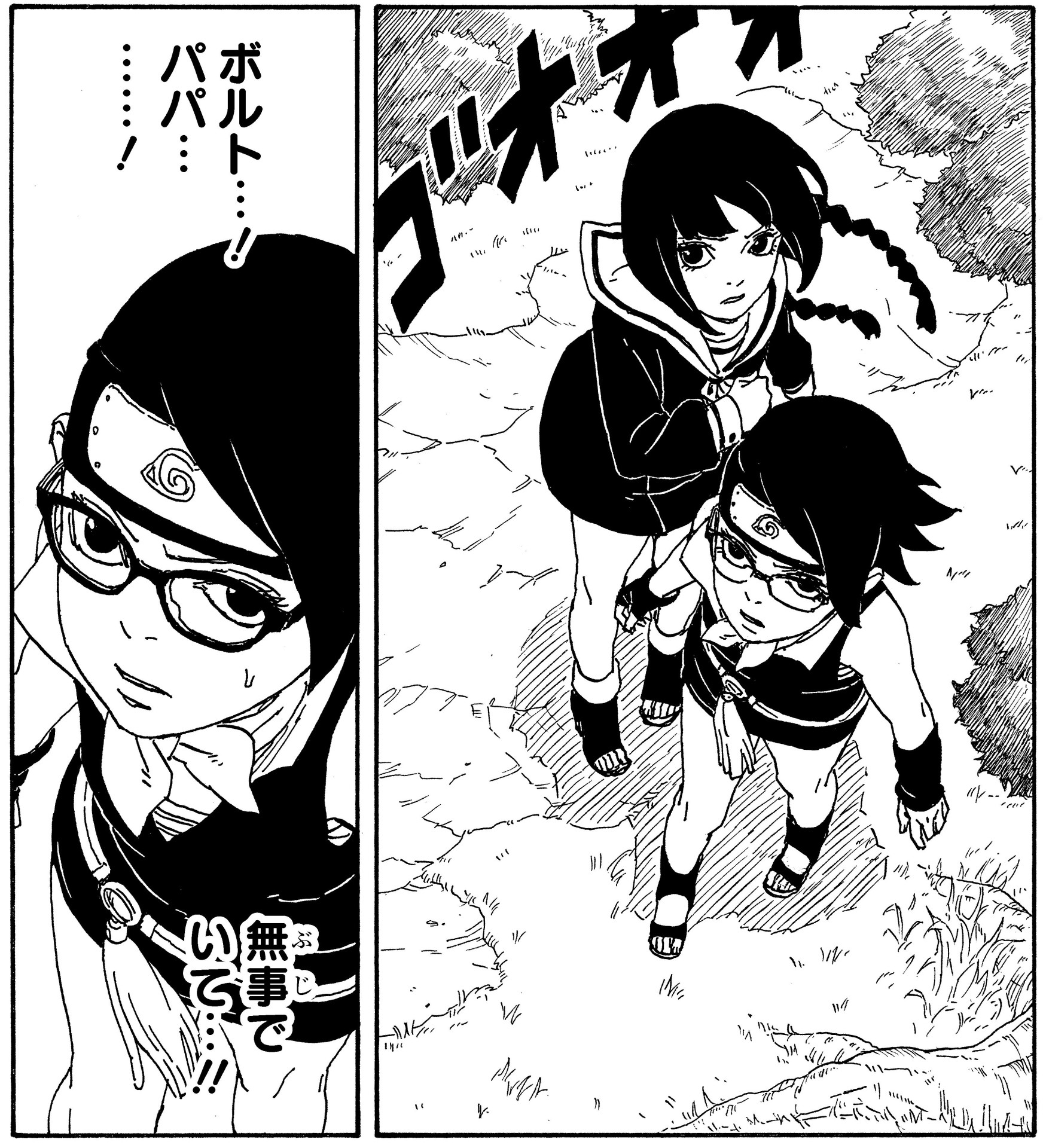 Daraufhin werden sie über Borutos Aufenthaltsort informiert, und die misstrauische Sarada eilt an seine Seite.