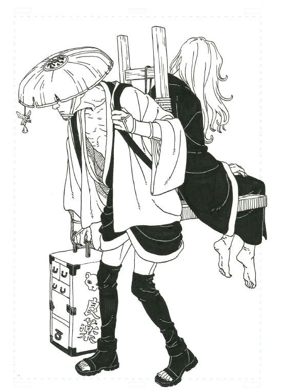 Diese Kunoichi ist eigentlich die alte Frau, die im Rucksackstuhl sitzt. Der Mann mit dem traditionellen Hut ist ein Ninja, der früher etwas gierig wurde und verschiedene Medikamente übermäßig verwendet hat.