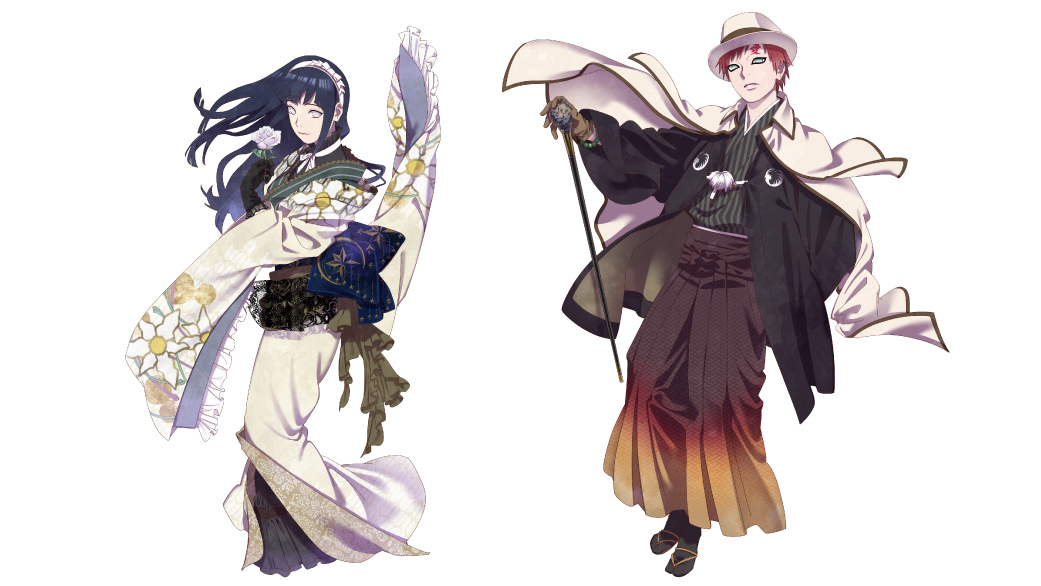Hinata appears holding a white rose in a matching white outfit that gives off an air of sophistication. Gaara sports a mix of western and Japanese attire, creating an appearance full of modern flair!