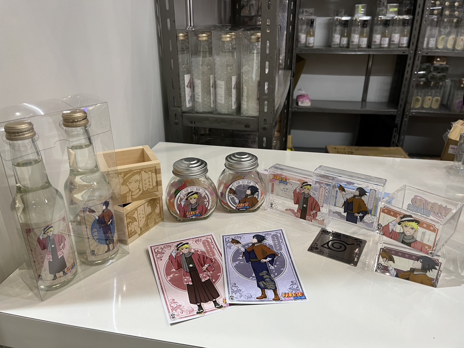 You could purchase mini-mintsu (small candies), kohakutō (traditional Japanese amber sugar candy shaped like jewels), and Kyoto's specialty yuzu cider with illustrations of NARUTO characters printed on the boxes and bottles!