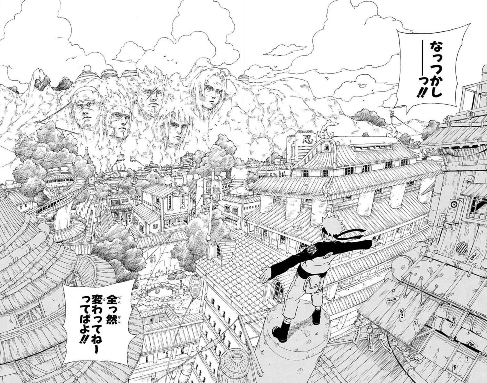 When you think of NARUTO, this is the kind of scenery that comes to mind. Kishimoto supposedly only did the sketch while the inking was done by an assistant, but honestly, I have to wonder if I'd even be able to draw a sketch like this for a weekly series.