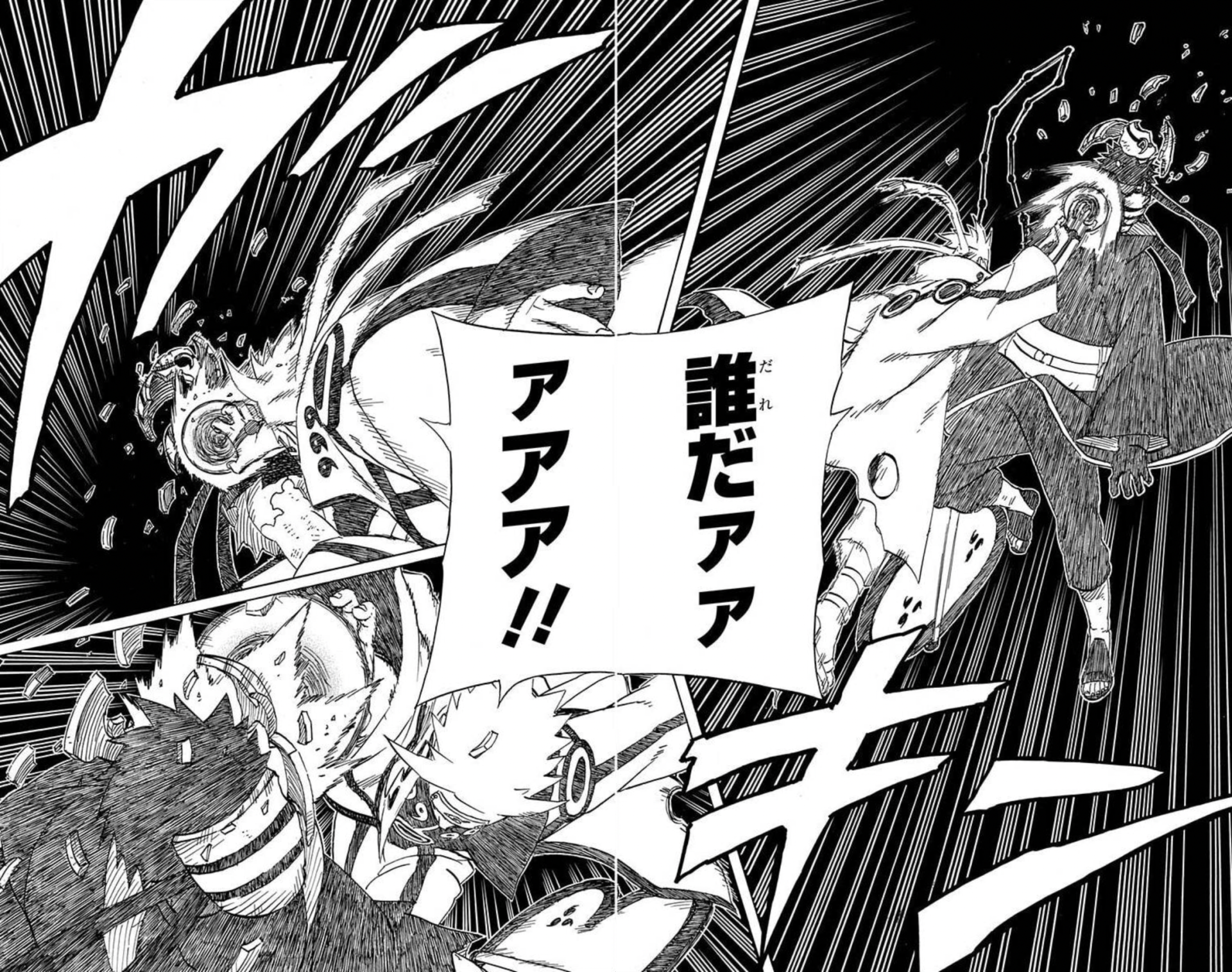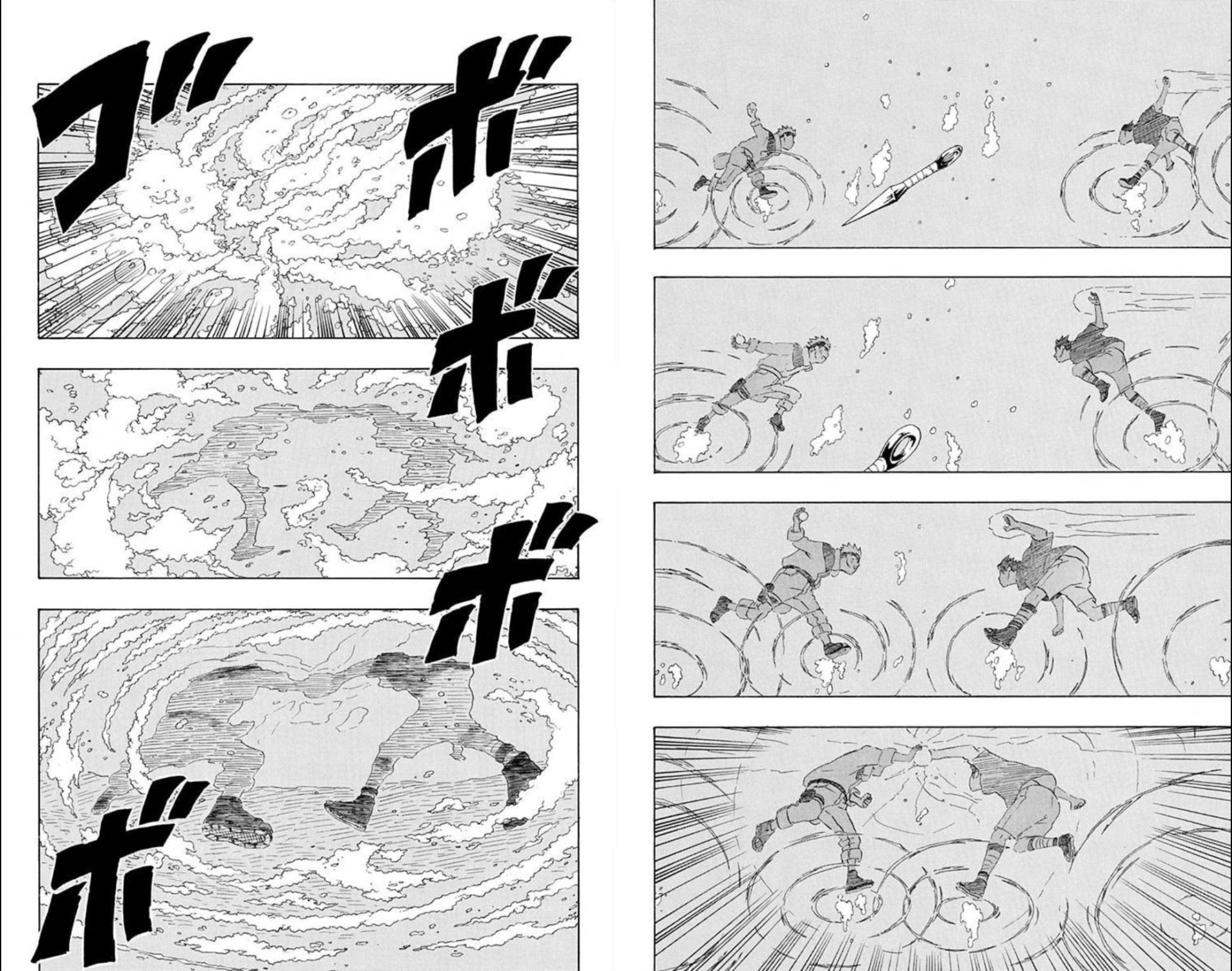 When this was released, I thought "How would one even draw this scene?" and when I met Kishimoto I actually asked him about it. He said that he had used an old copy machine that he owned with a function called "outlining" which, when you have a thick line, leaves only the arch shapes and whitens the inside.