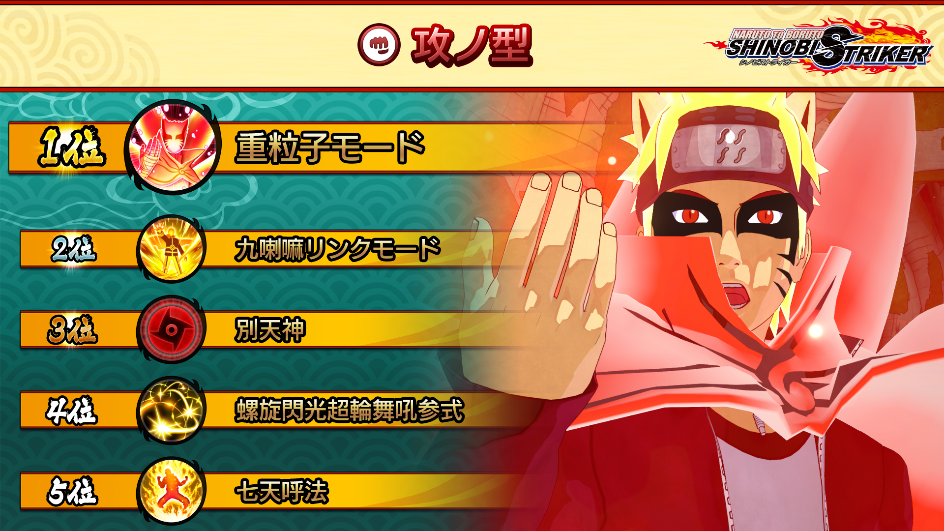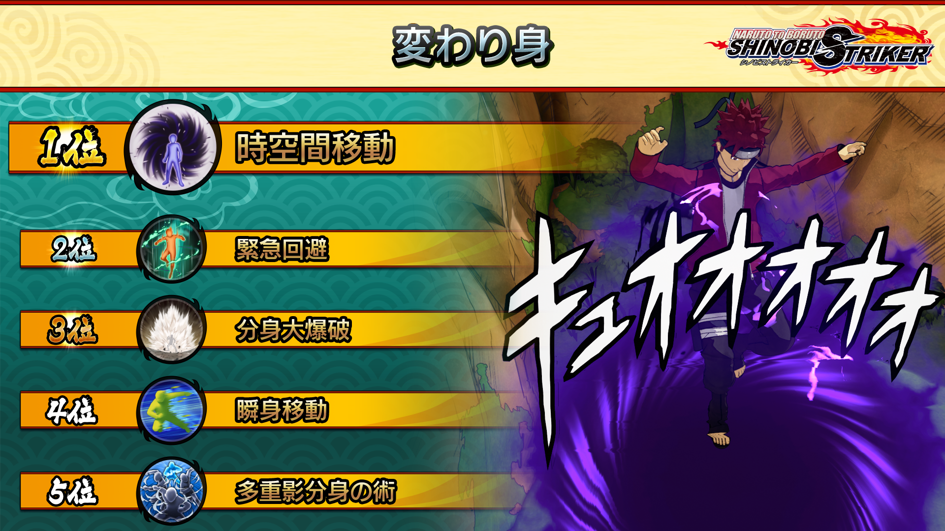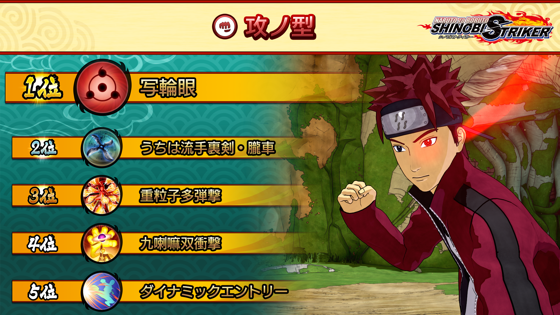 "Sharingan", a support Ninjutsu that excels at defense was ranked first. "Uchiha Shuriken Jutsu: Oboroguruma", which grants powerful buff effects, was ranked second, and "Baryon Bullet Barrage", a Ninjutsu that focuses purely on attacking, came in third.