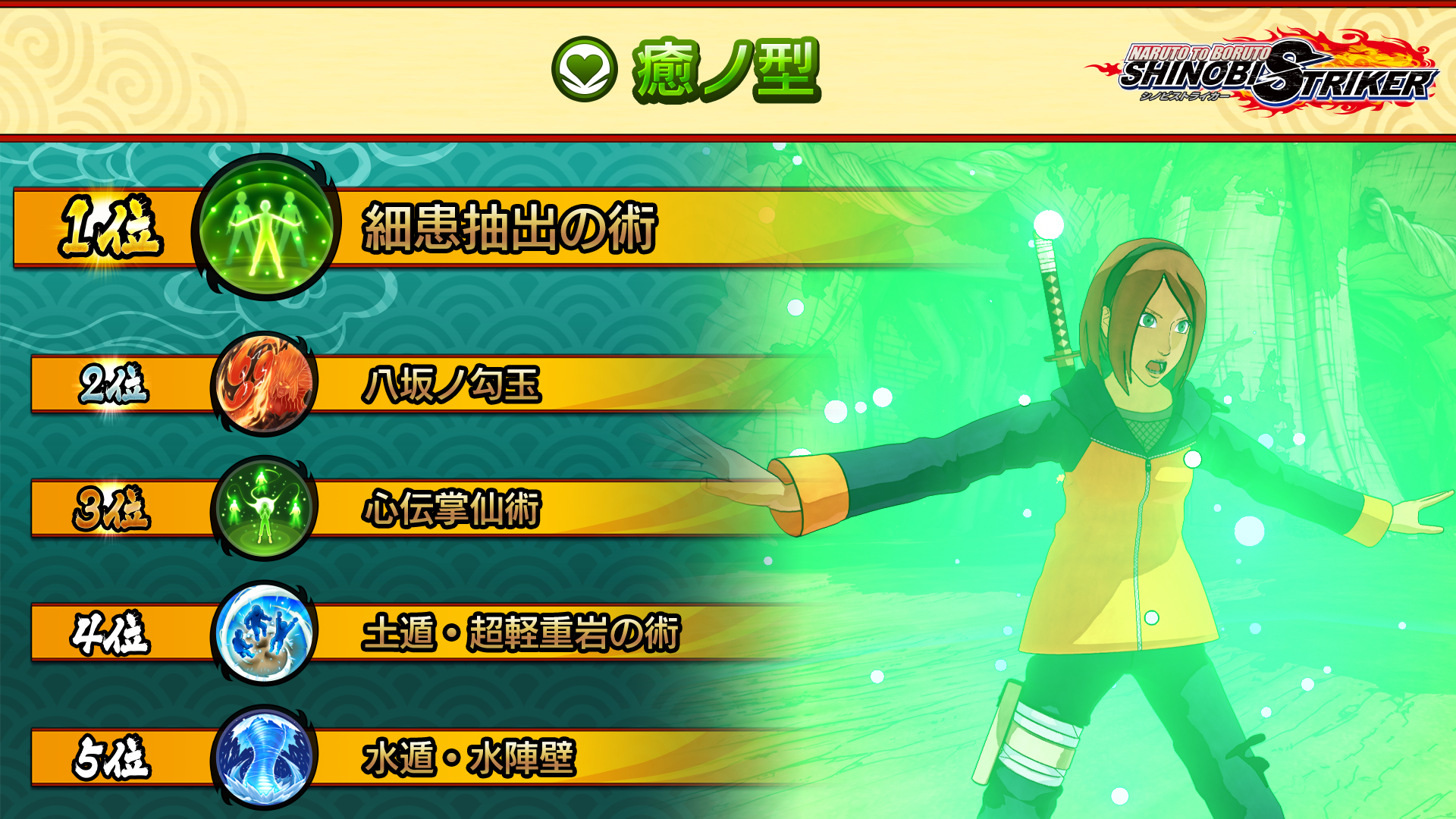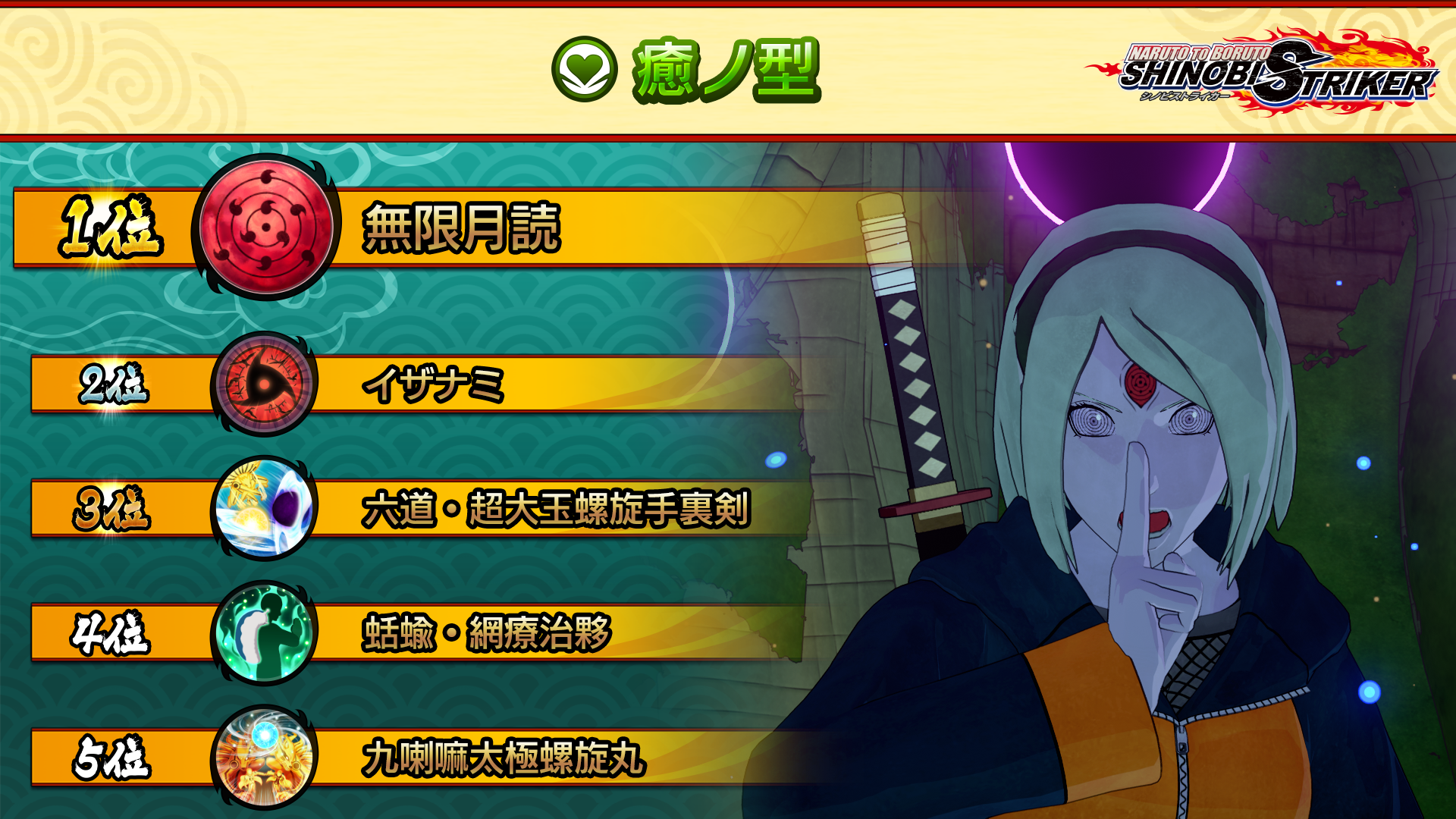 "Cellular Extraction Jutsu", a recovery Ninjutsu that's been known for its power since the beginning of the Ninja World League, topped the heal type rankings! As for the Secret Technique ranking, powerful Genjutsu dominated, with "Infinite Tsukuyomi" taking first and "Izanami" in second.