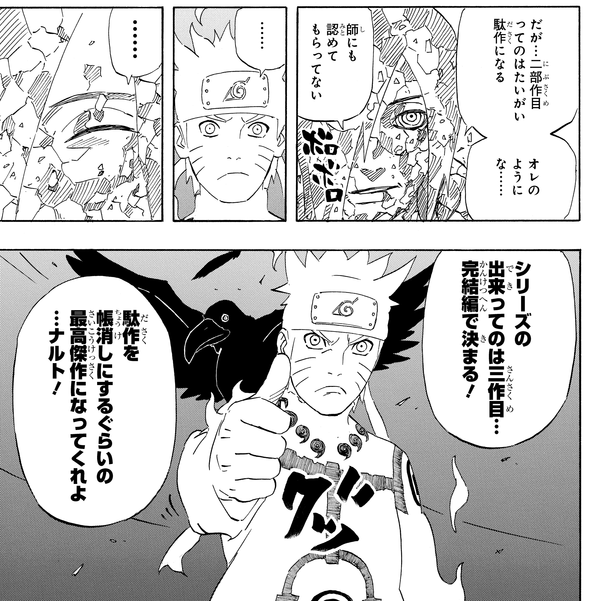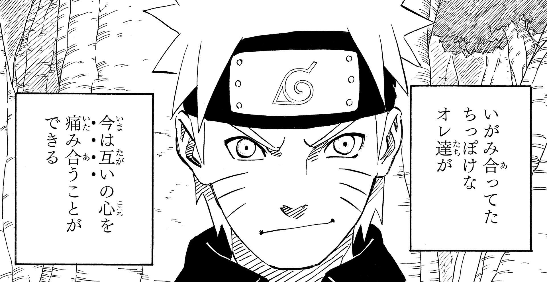 A "Unison Sign" is formed between Naruto and Sasuke, and their long history of conflict comes to a close along with the Fourth Great Ninja War.
