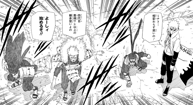 As if in response to their fierce charge, strong reinforcements join the fray: Sasuke and the reanimated previous Hokage!