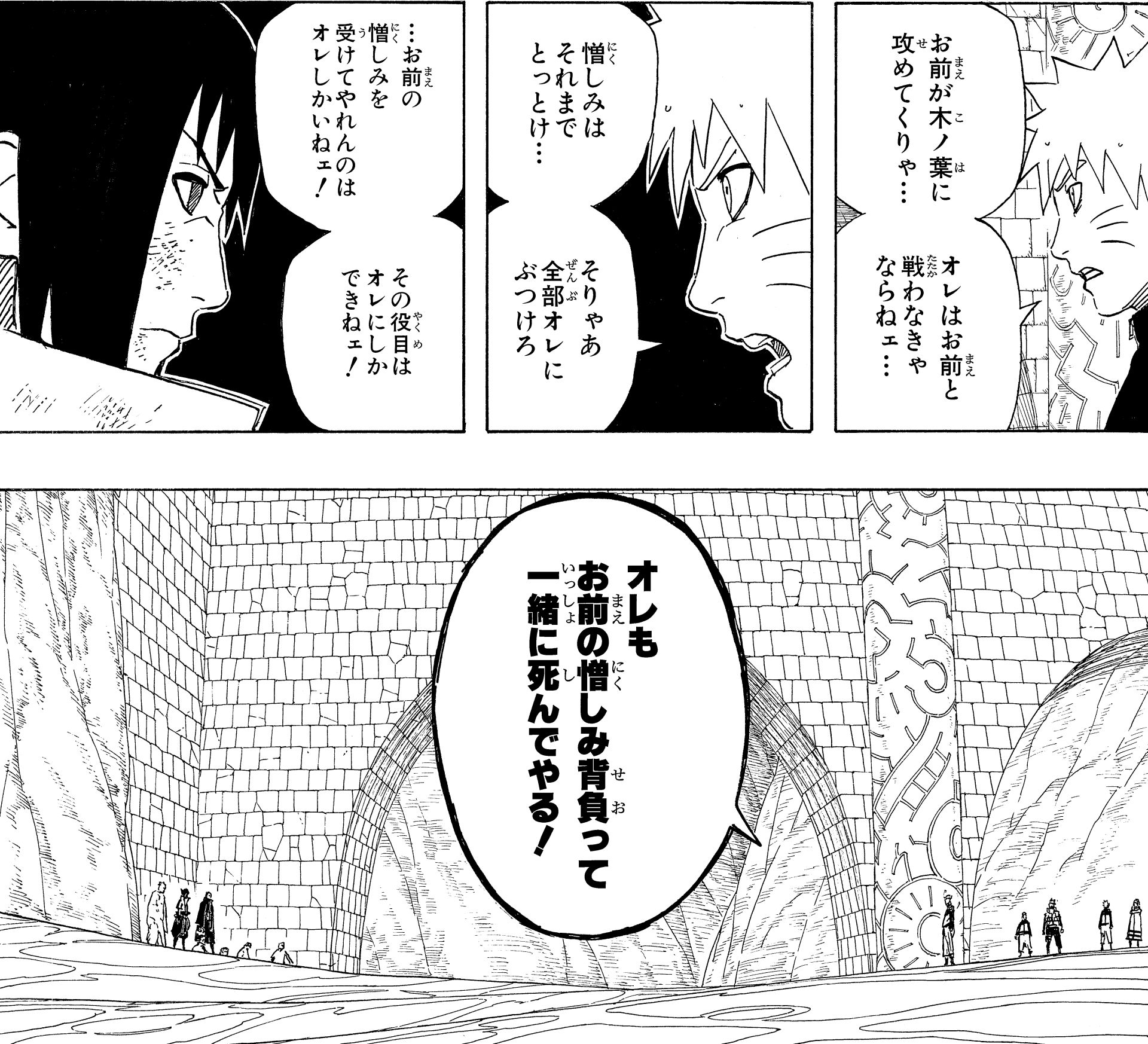 Accepting this outcome as inevitable, Naruto expresses his determination to put his life on the line the next time they fight, and bear the burden of Sasuke's hate.