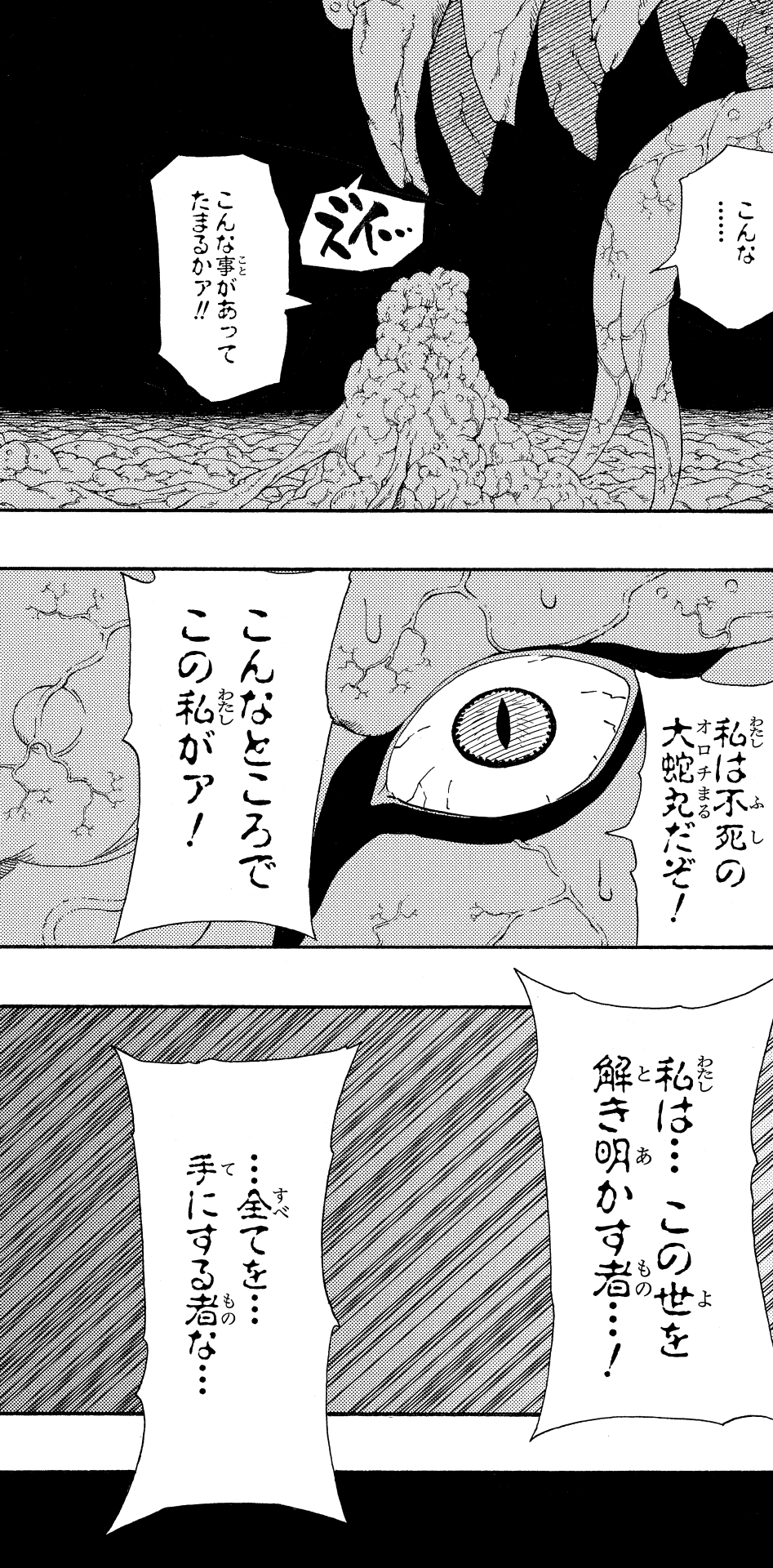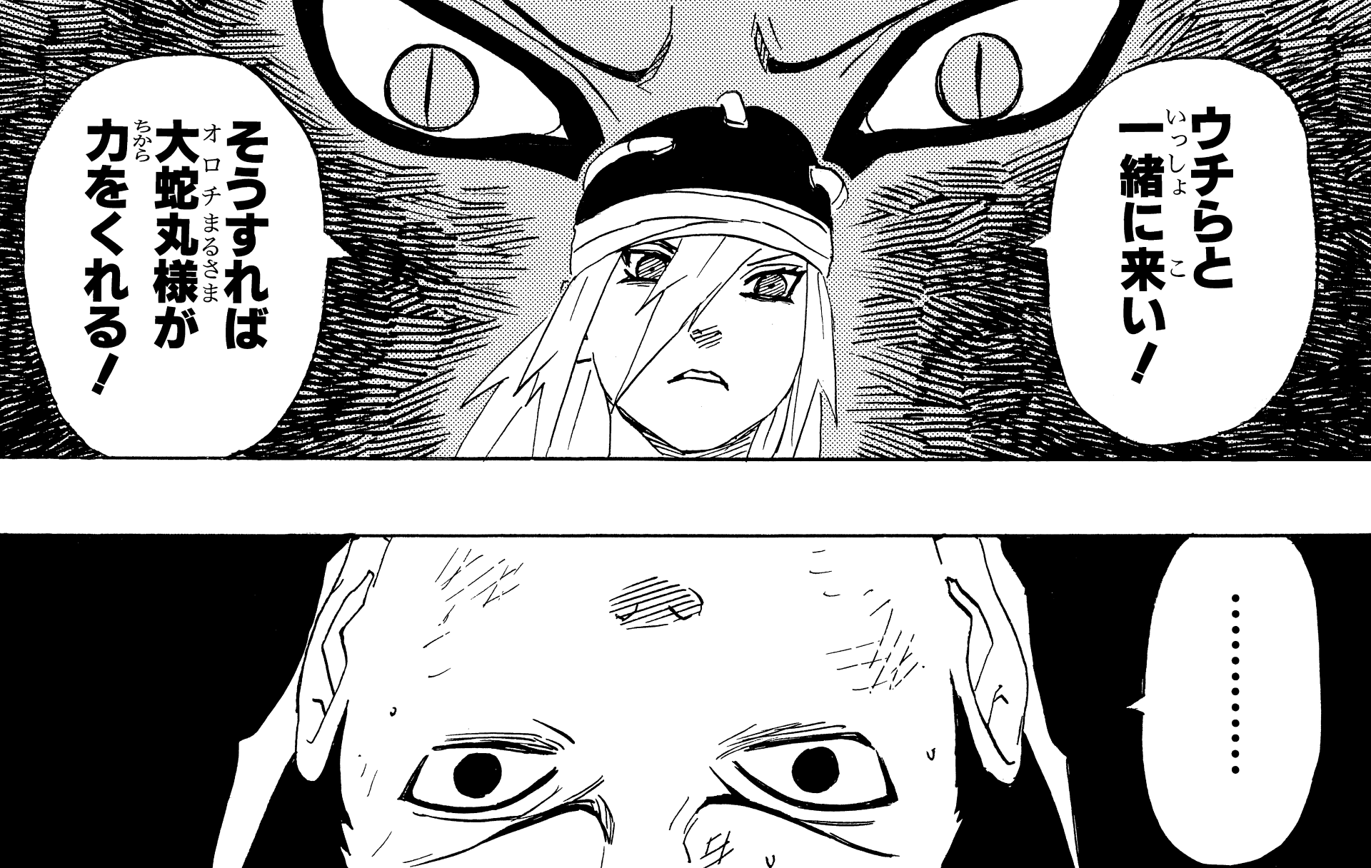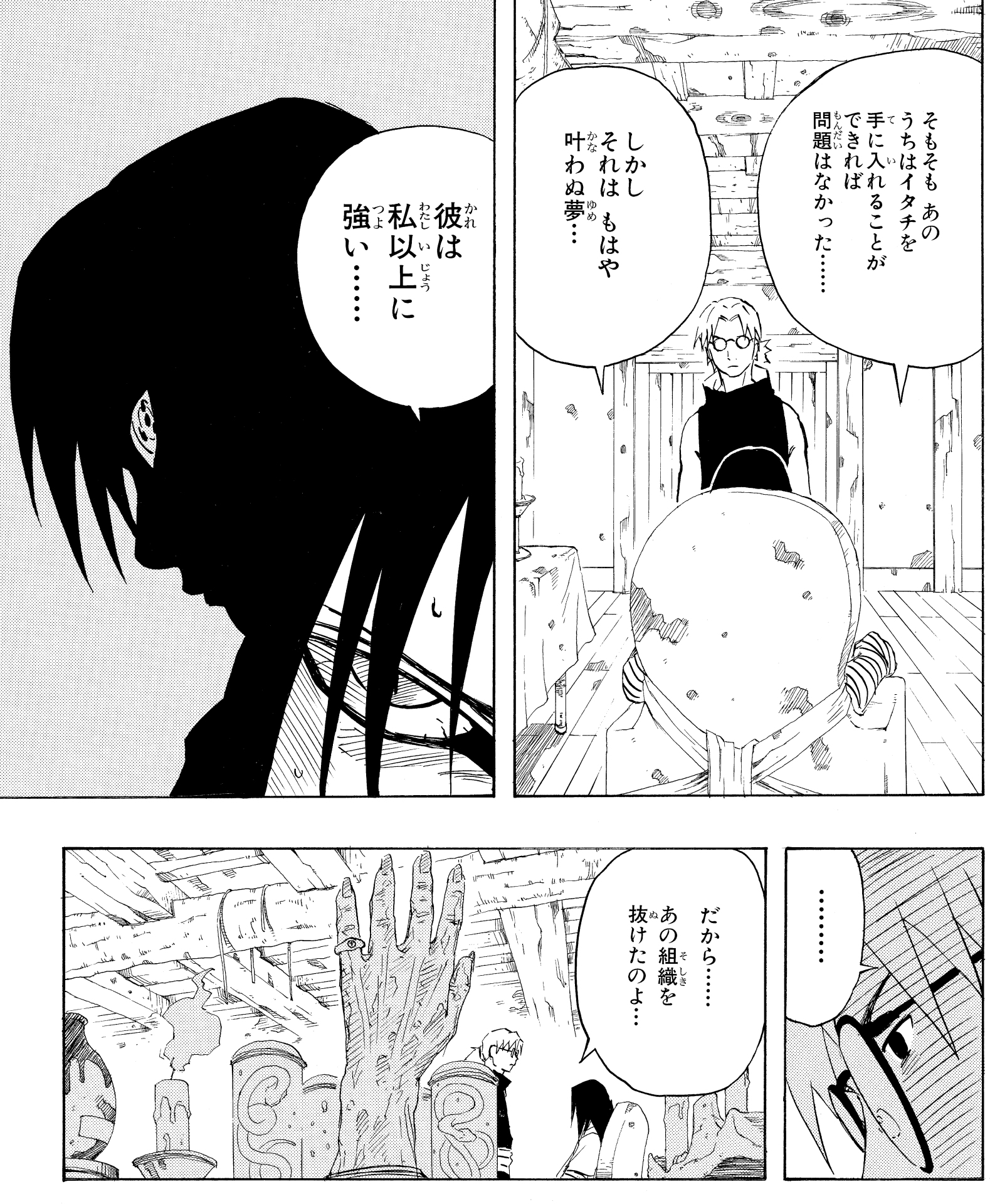 Seeing the failure of Kabuto, who emulated his own method of accumulating everything possible, Orochimaru becomes curious about the very different path his younger disciple is choosing.