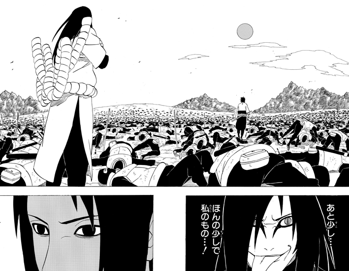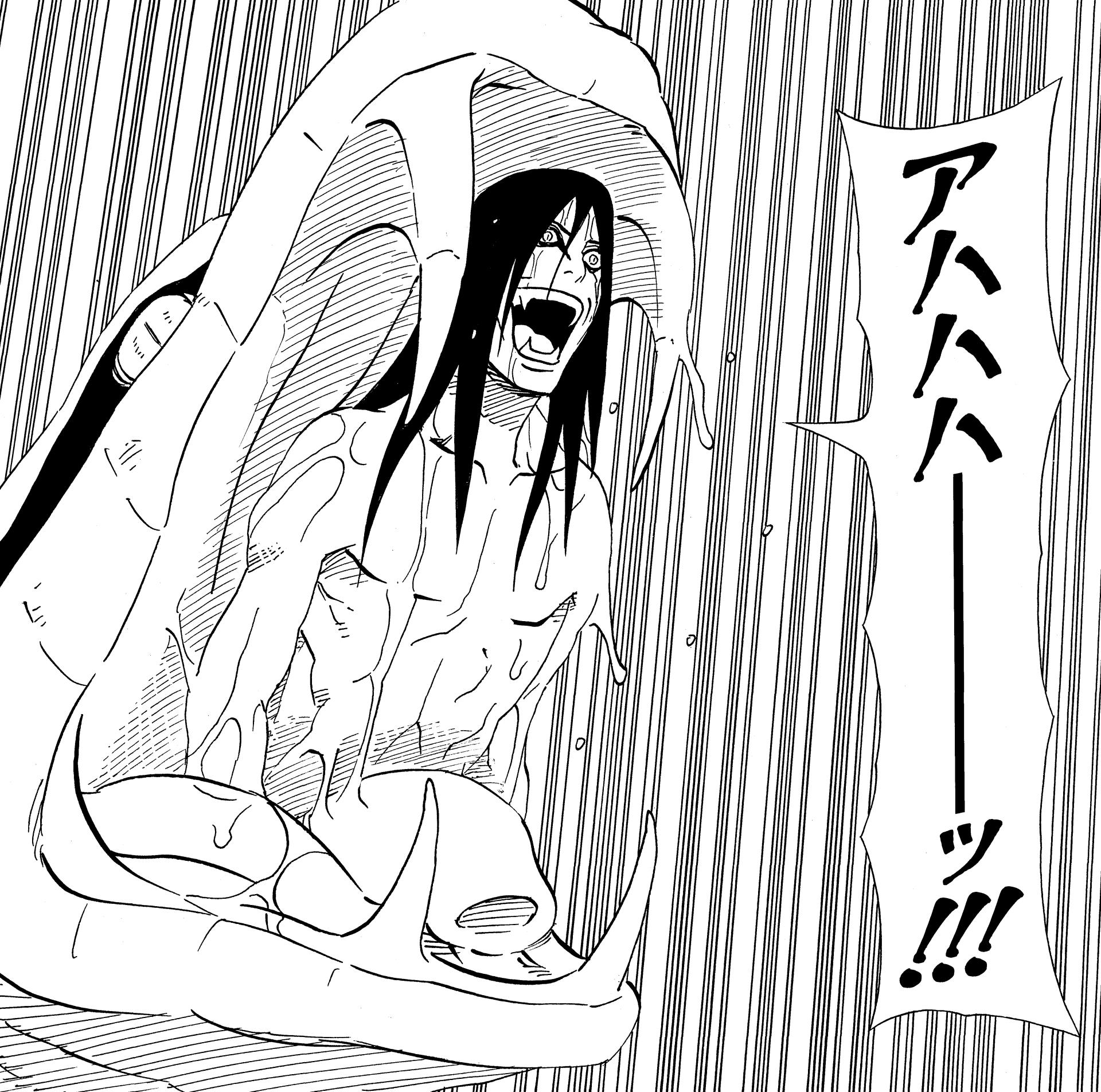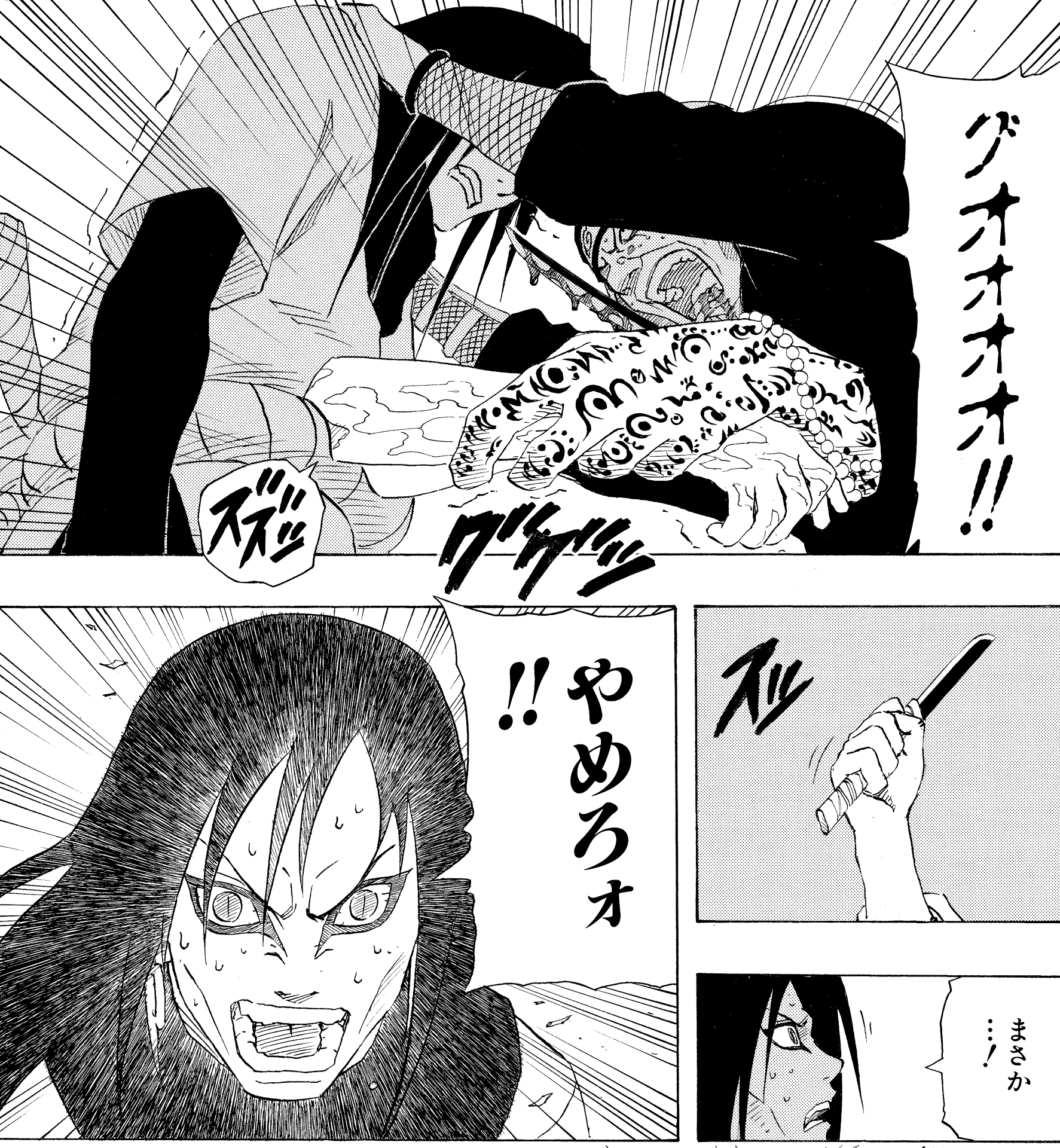 Despite being overpowered by the younger ninja, Orochimaru begins forcibly executing the ritual to transfer his consciousness into Sasuke.