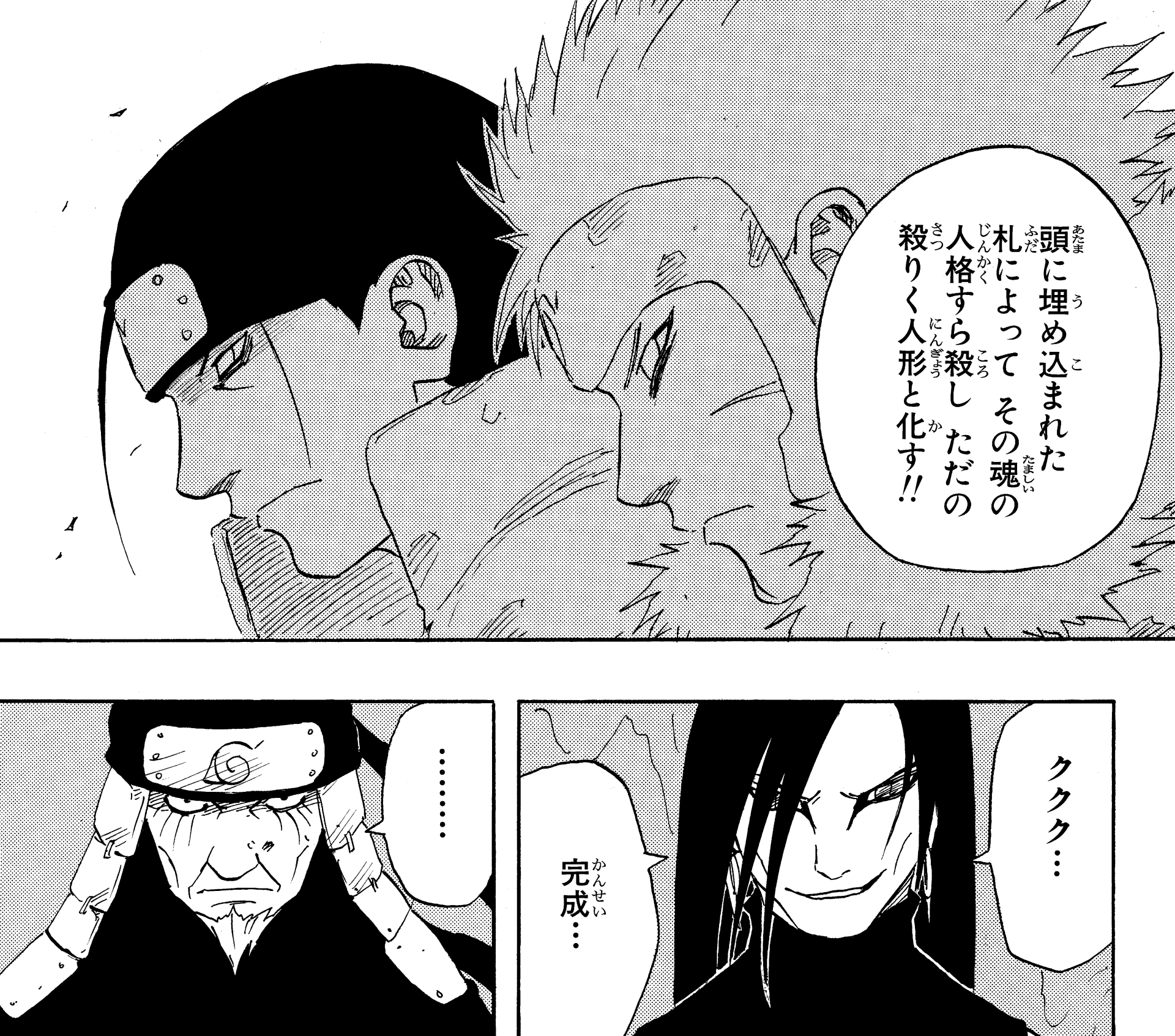 He gets in close to ambush the Hokage, Hiruzen, by taking the form of the Kazekage whom he had murdered earlier. Orochimaru engages his former teacher in a duel inside a sealed area to prevent outside interference.