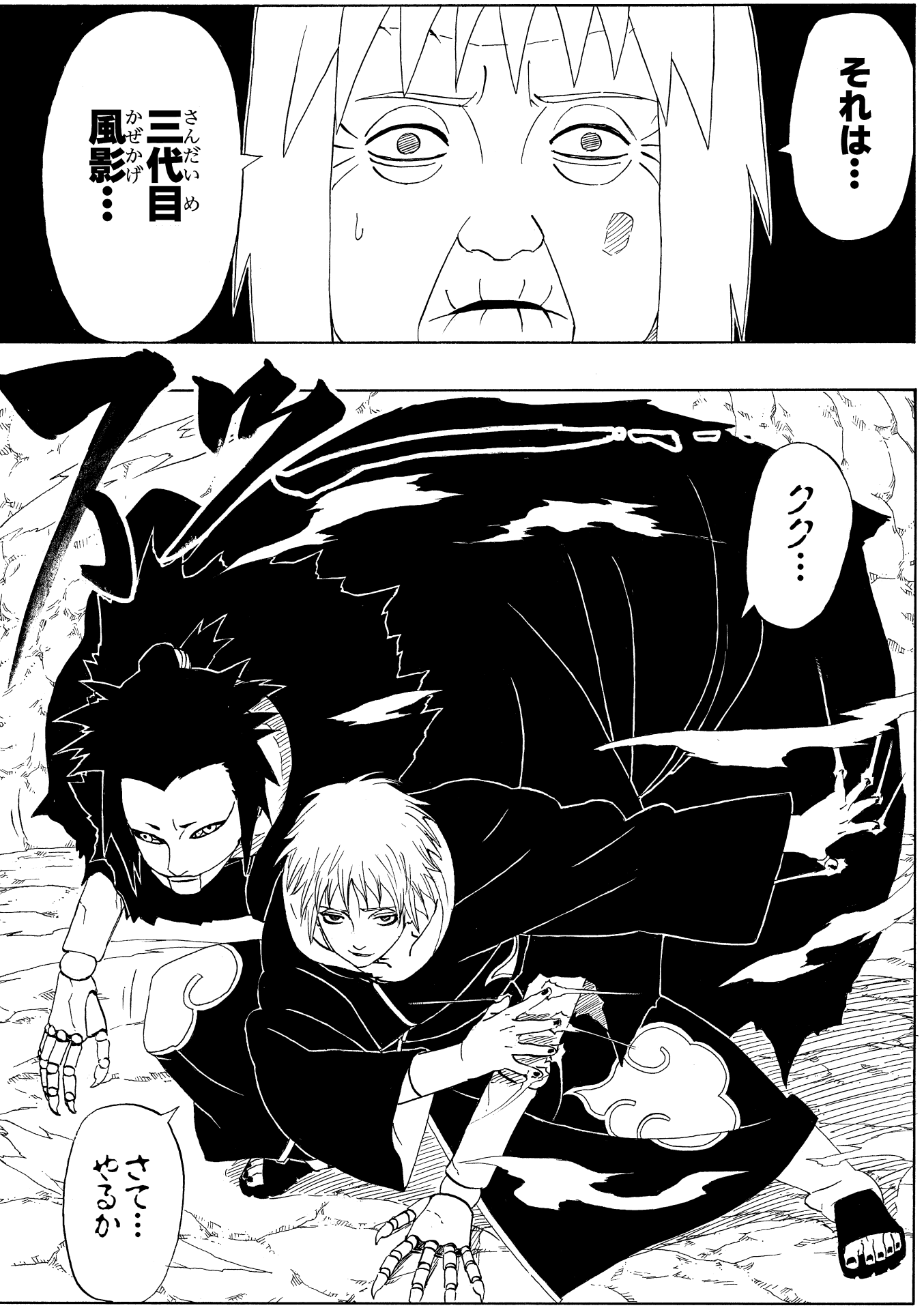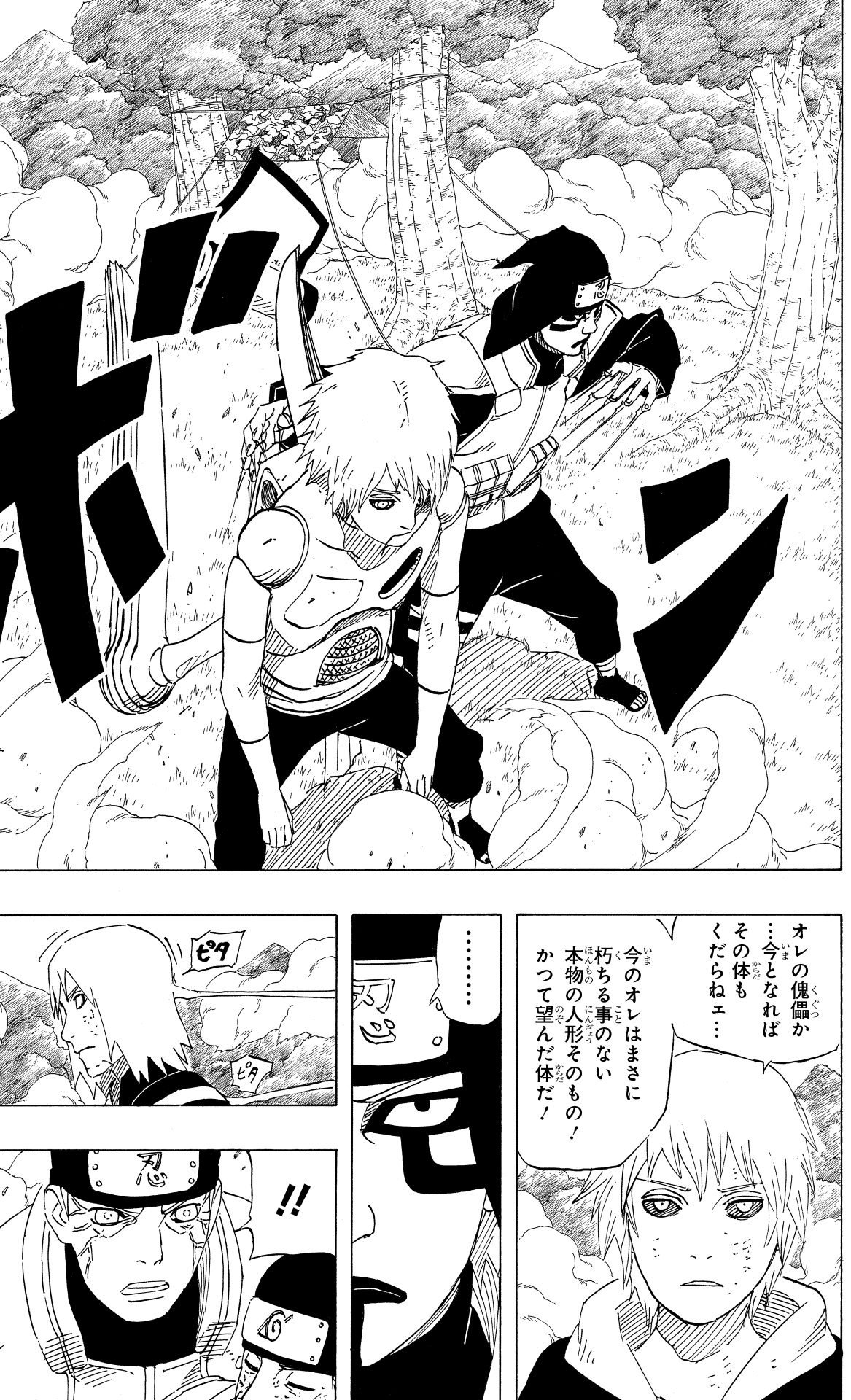 Kankuro uses Sasori's previous puppet body to fight him, but Sasori remains unbothered, declaring that he no longer needs that body as he has finally succeeded in becoming a true, eternal puppet himself.
