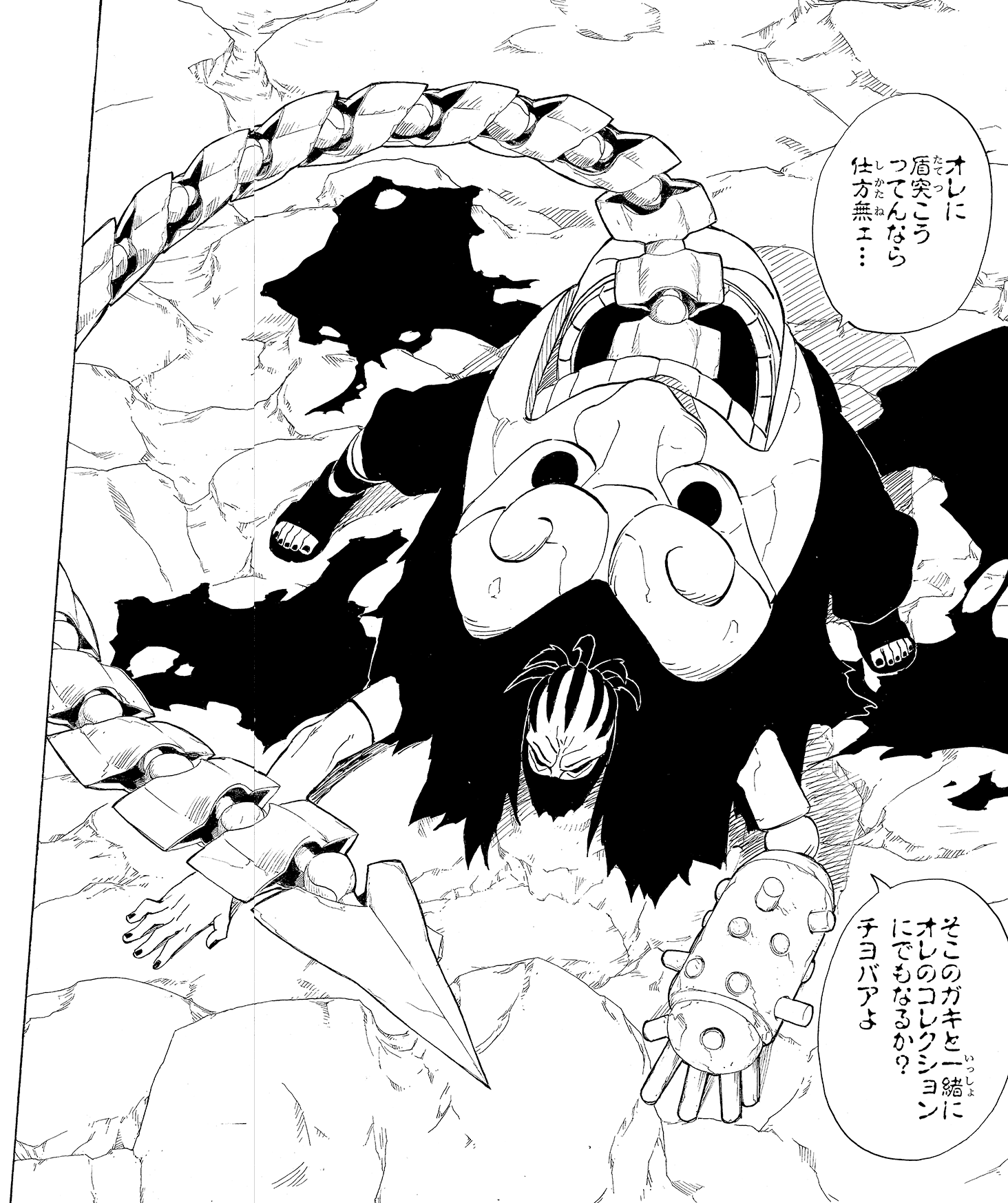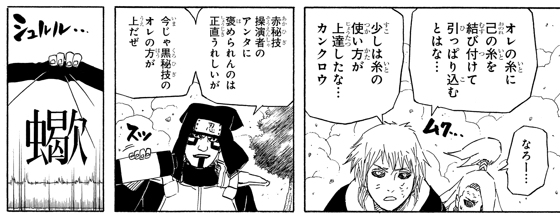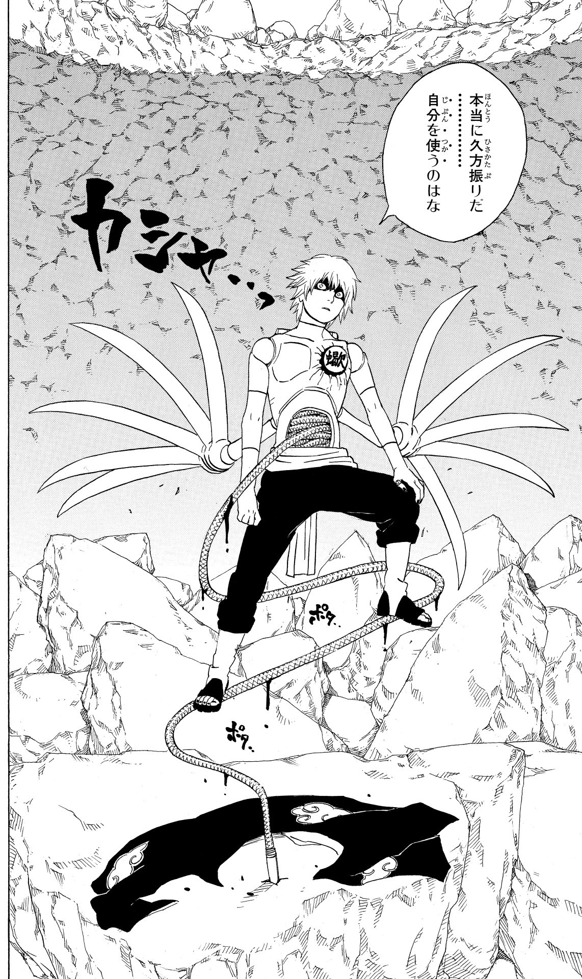 His opponent attacks with the Crow, Ant, and Salamander puppets, but Sasori easily sees through their moves, utterly defeating Kankuro.