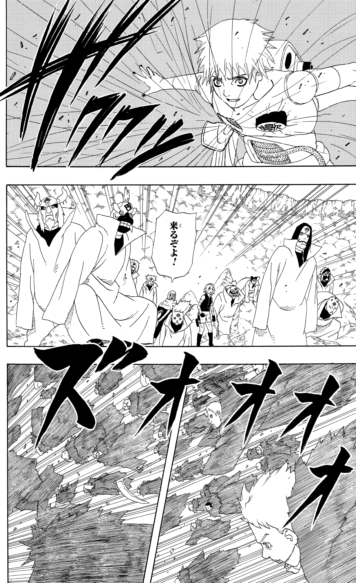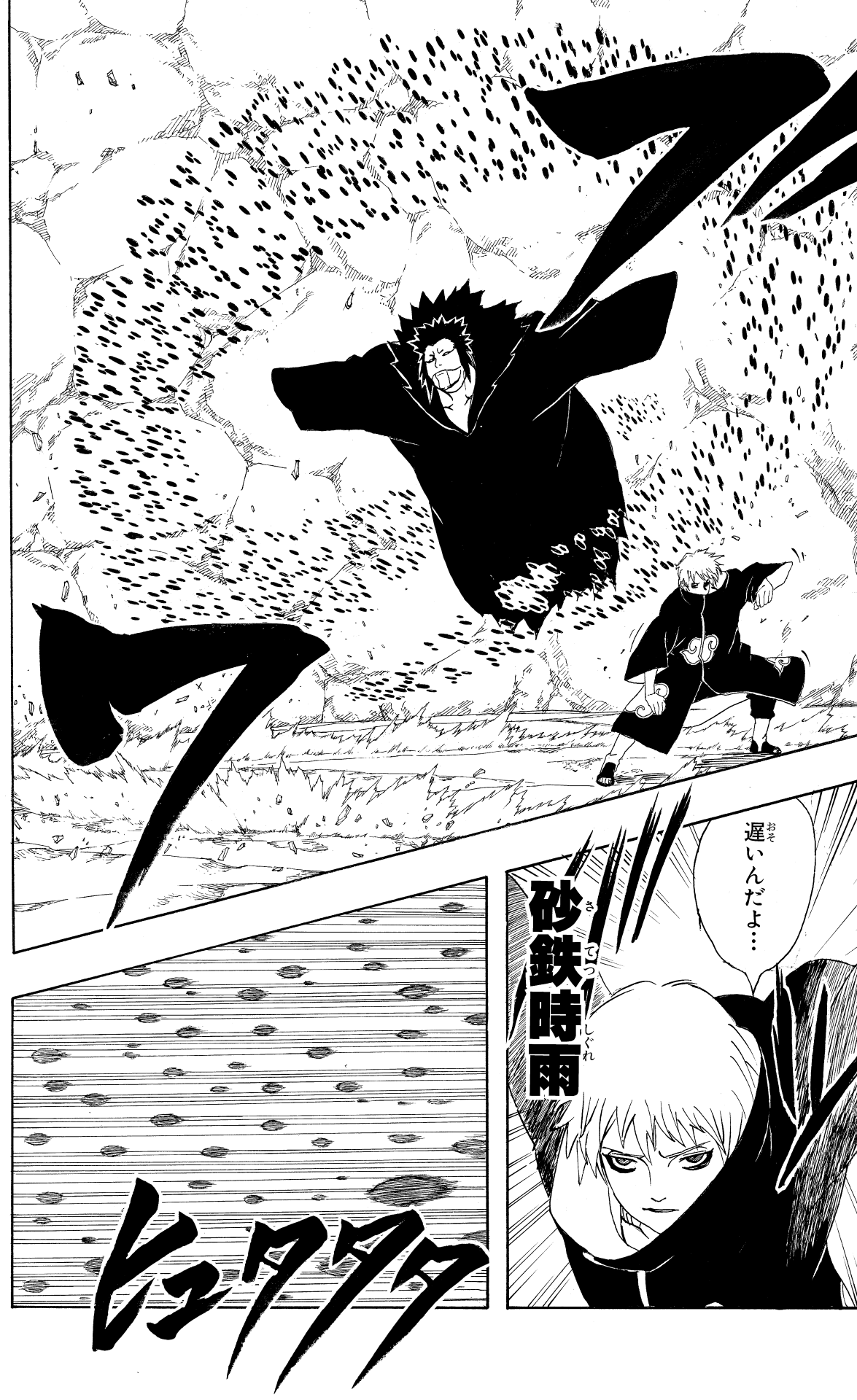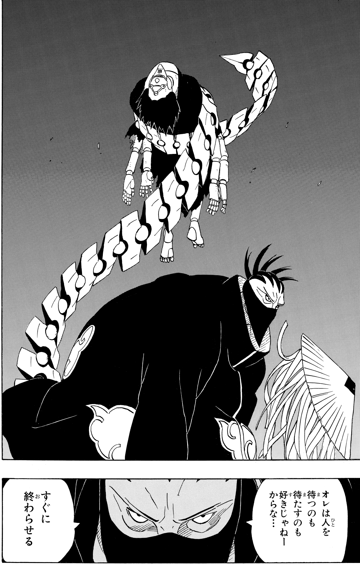 His opponent attacks with the Crow, Ant, and Salamander puppets, but Sasori easily sees through their moves, utterly defeating Kankuro.