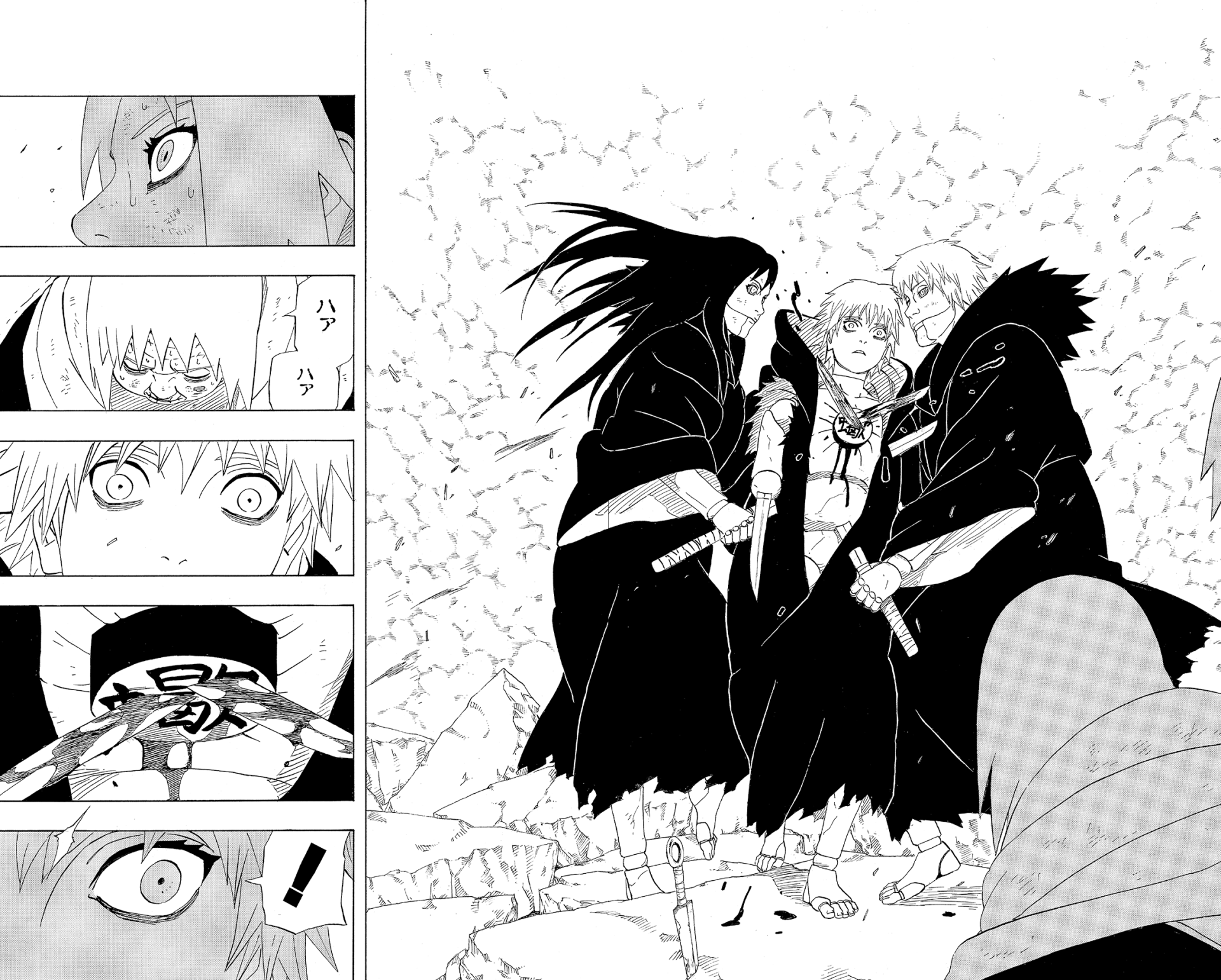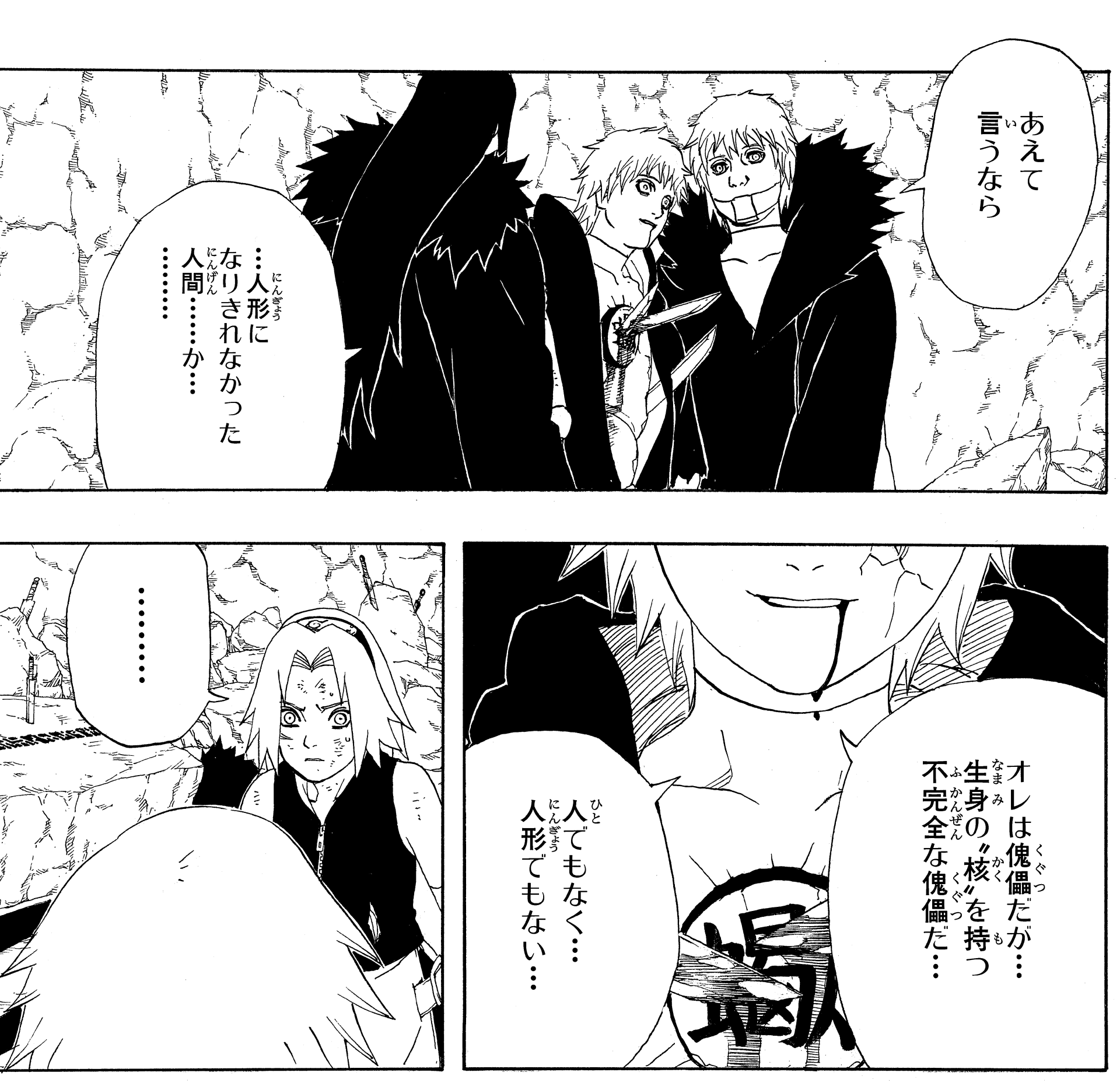 In the midst of the battle for the fate of the Jinchuriki, Granny Chiyo and Sakura seize victory by piercing through that vital point with swords held by Sasori's own Mother and Father puppets.