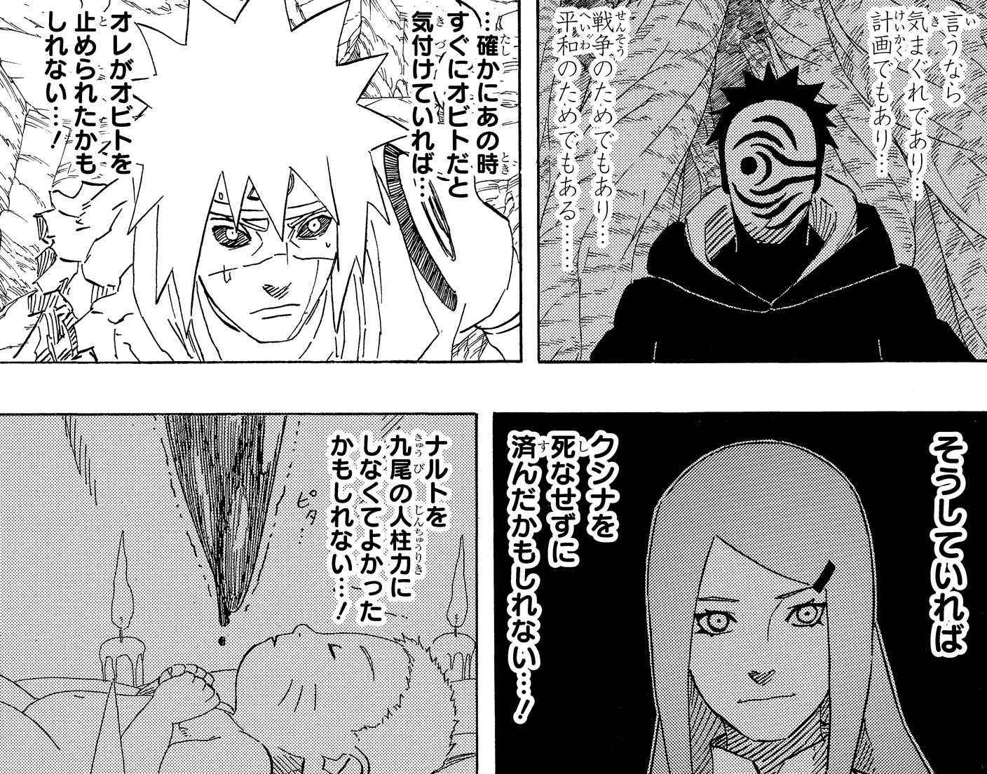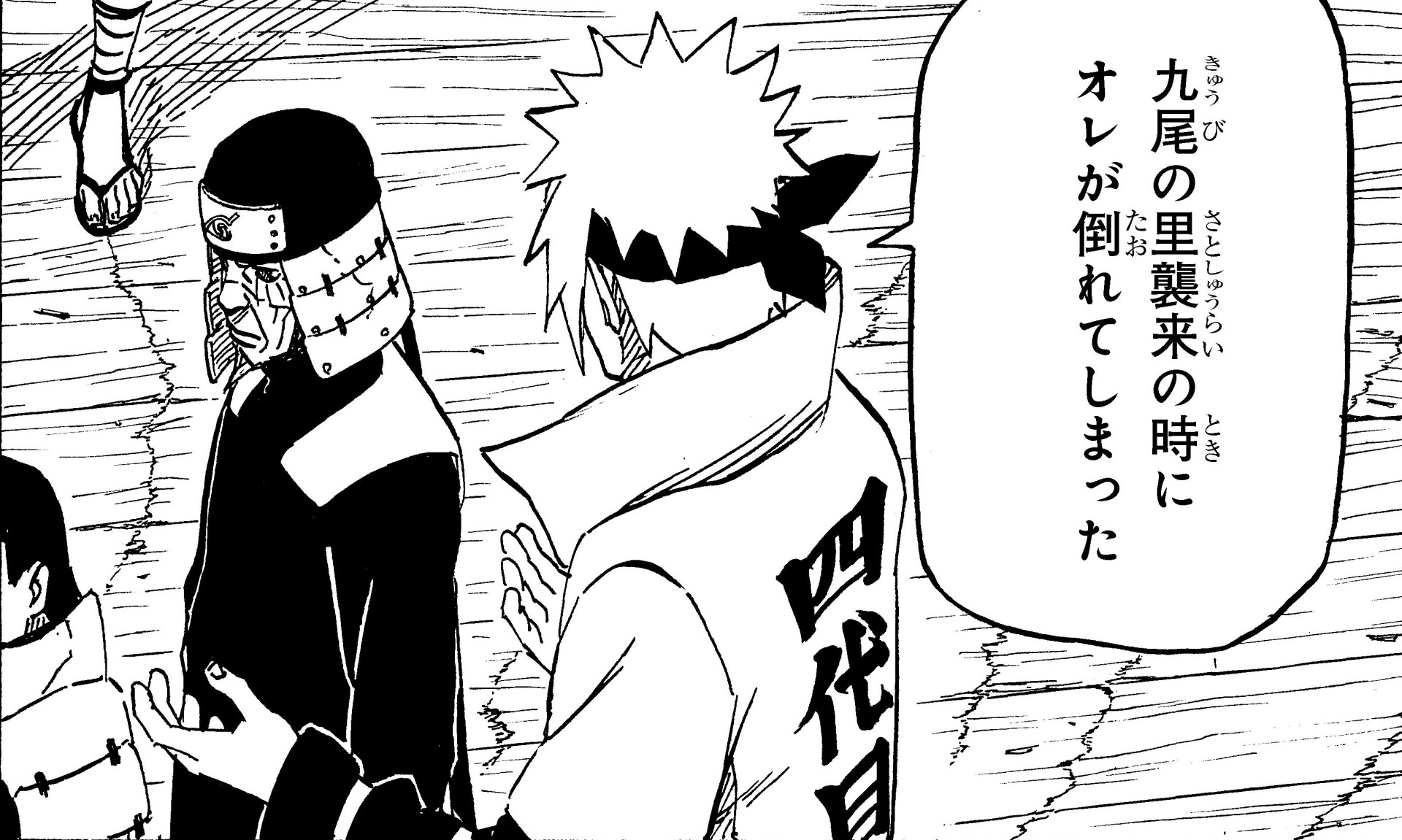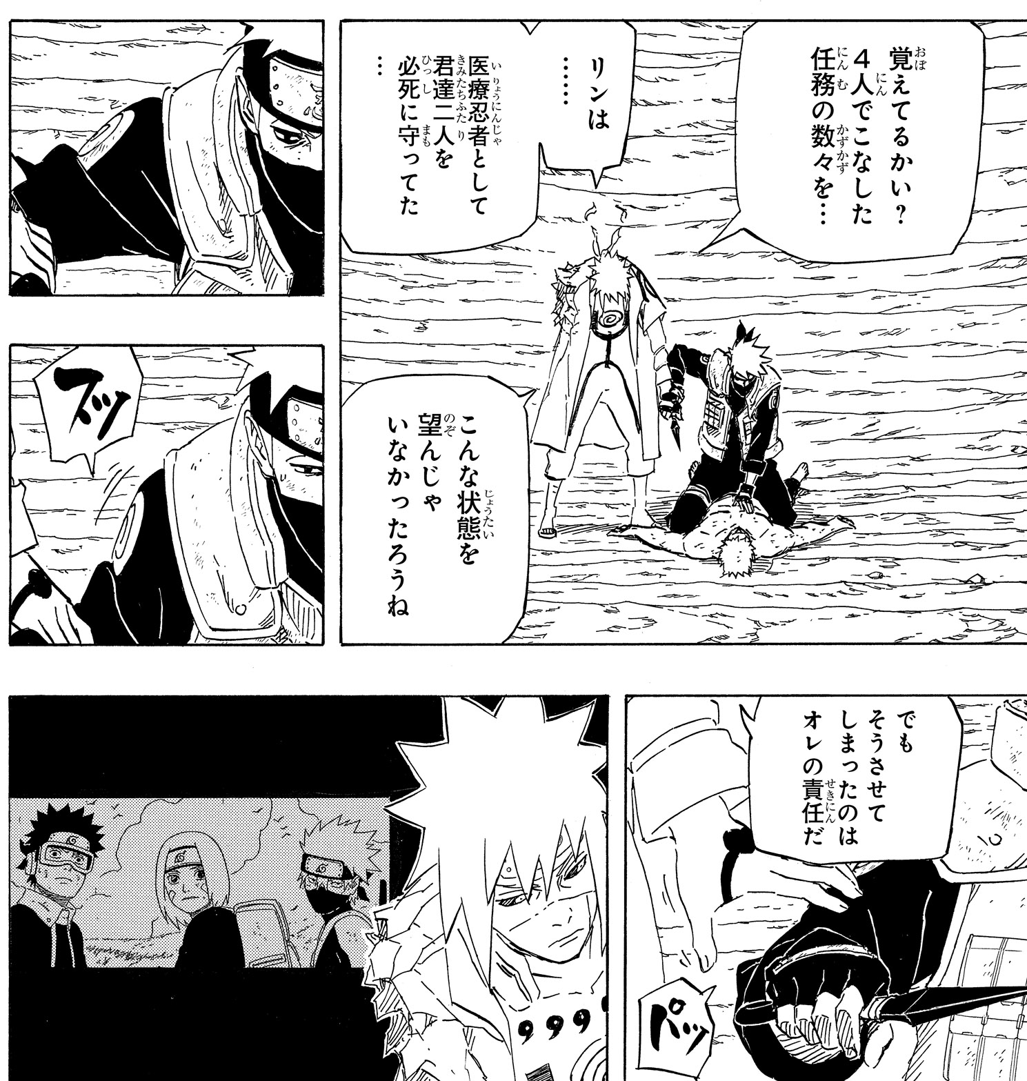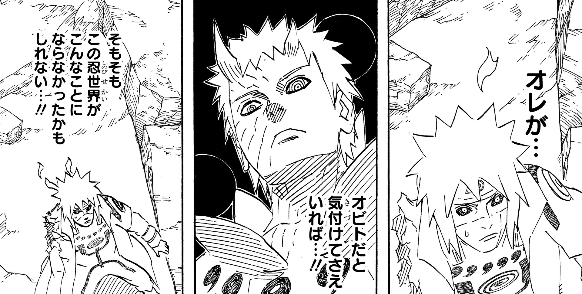 Minato questions his former student in the midst of the battle, and is struck with guilt over his failure to stop Obito all those years ago.