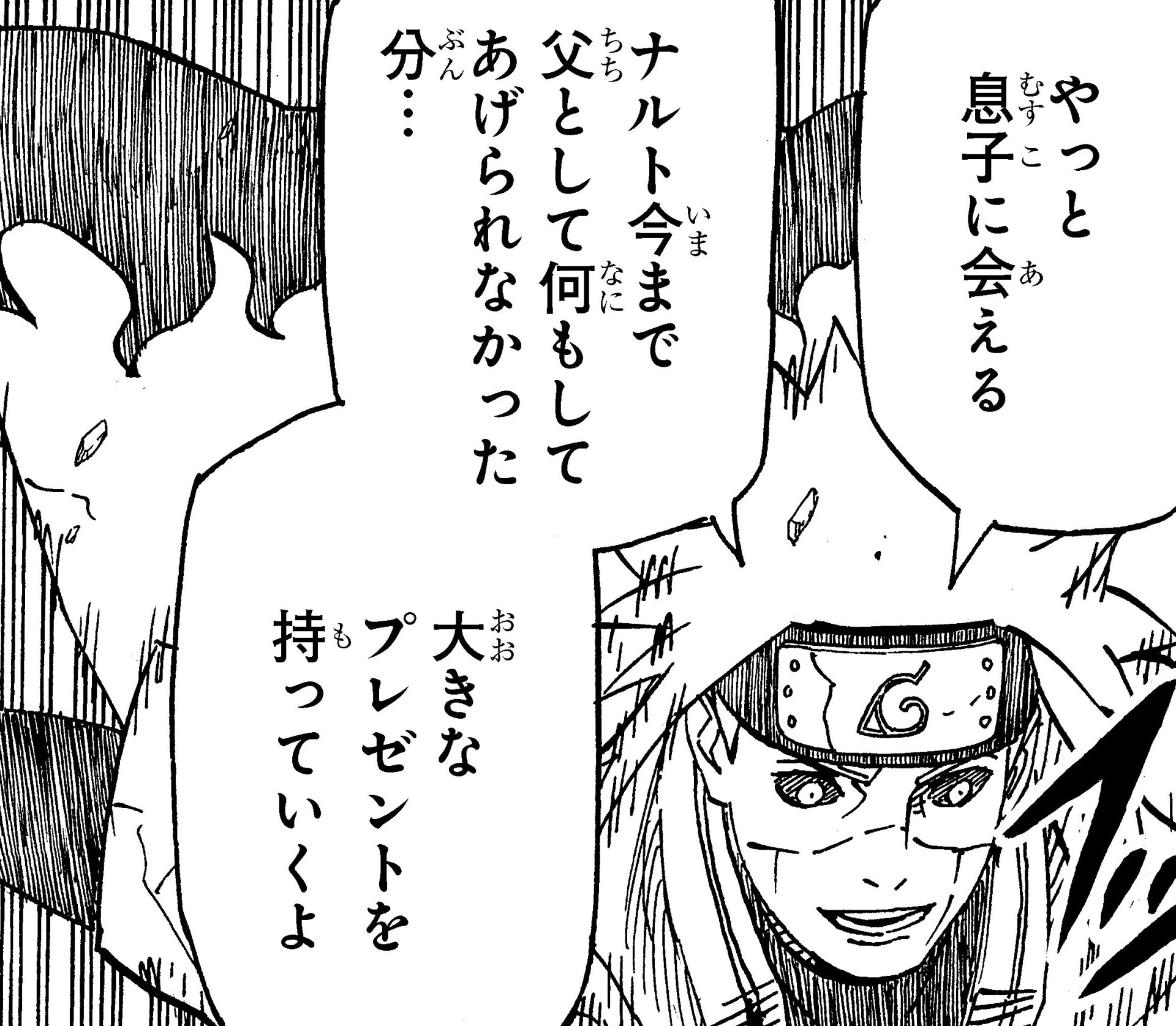 Minato is able to wish his son a happy birthday after witnessing his growth into an outstanding young man. Finally, while listening carefully to his son's dreams so he can recount them all to Kushina, he returns to the afterlife with a smile on his face...