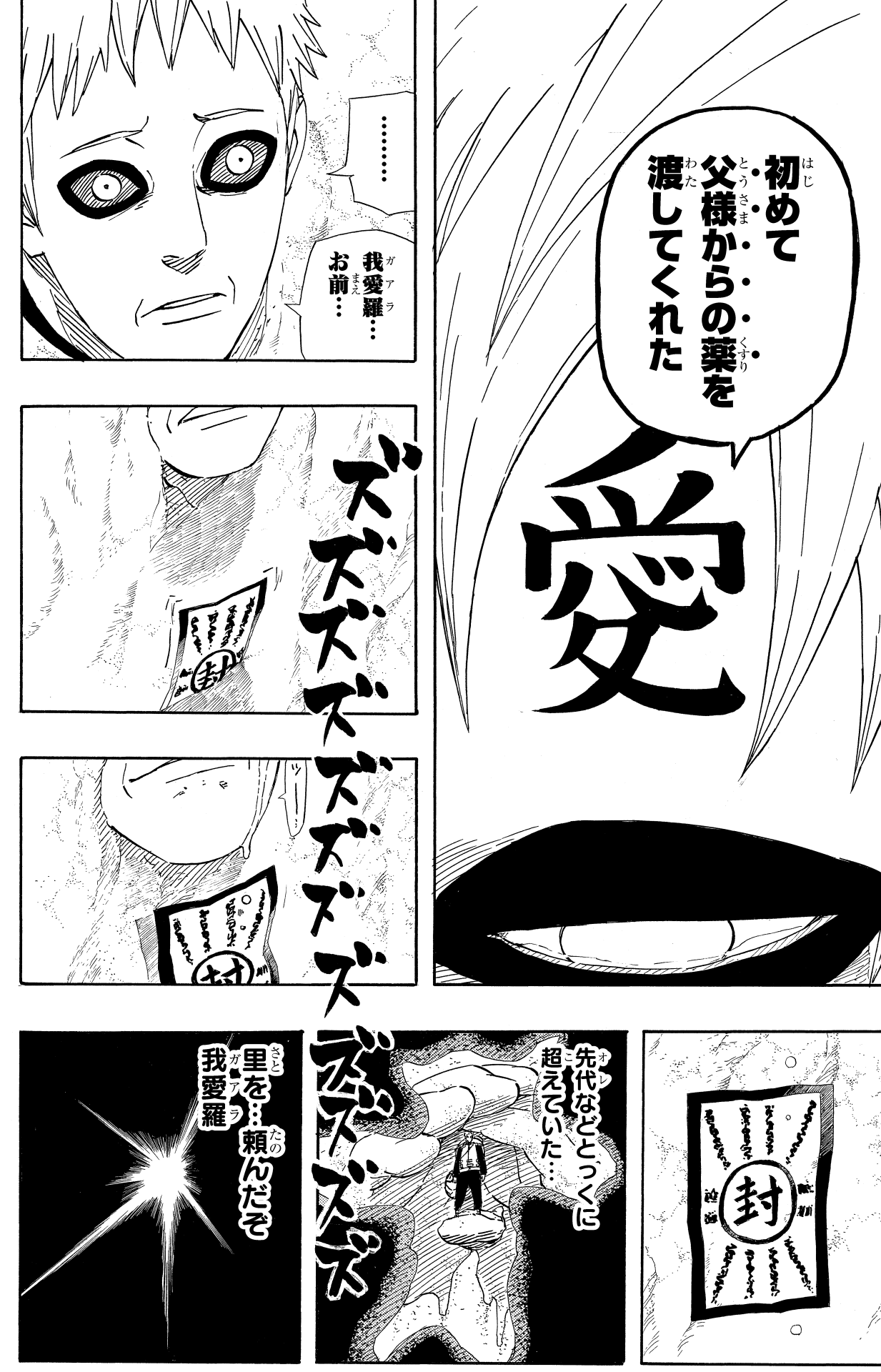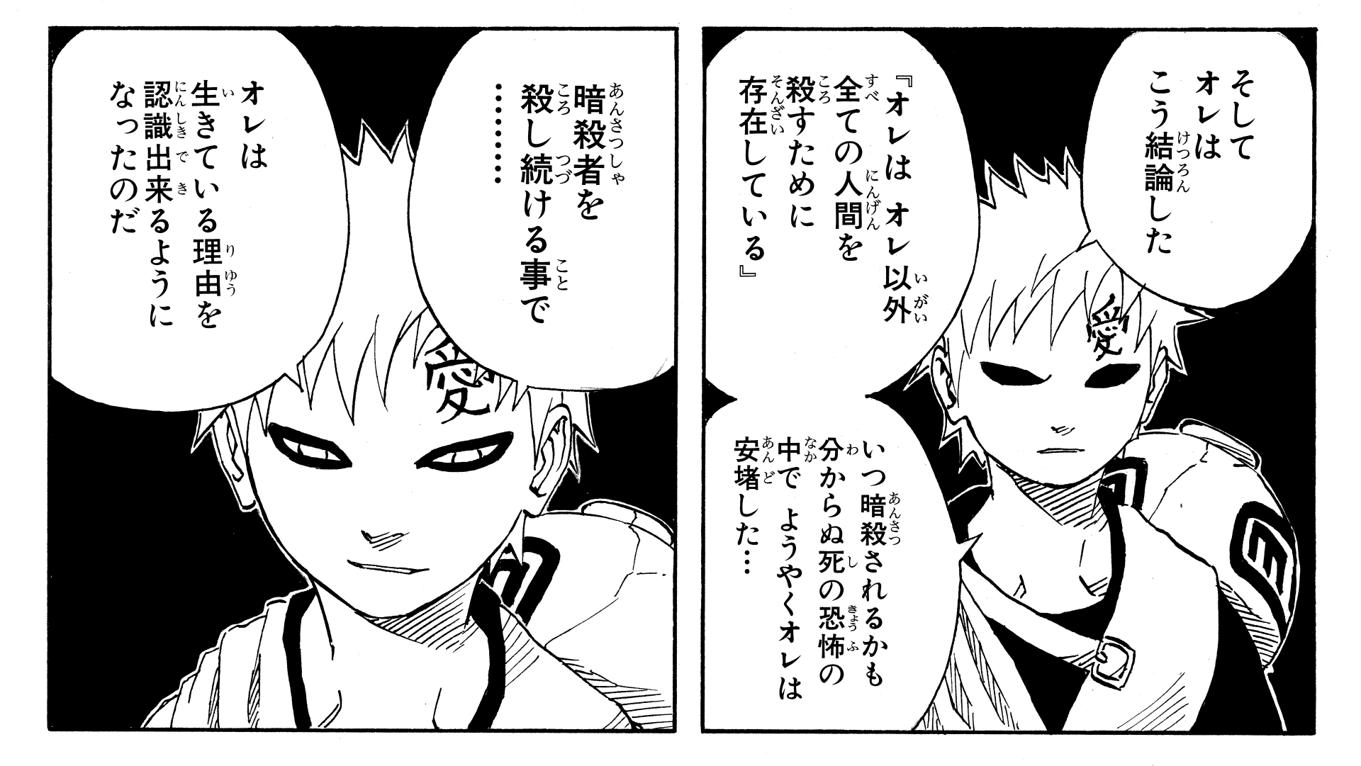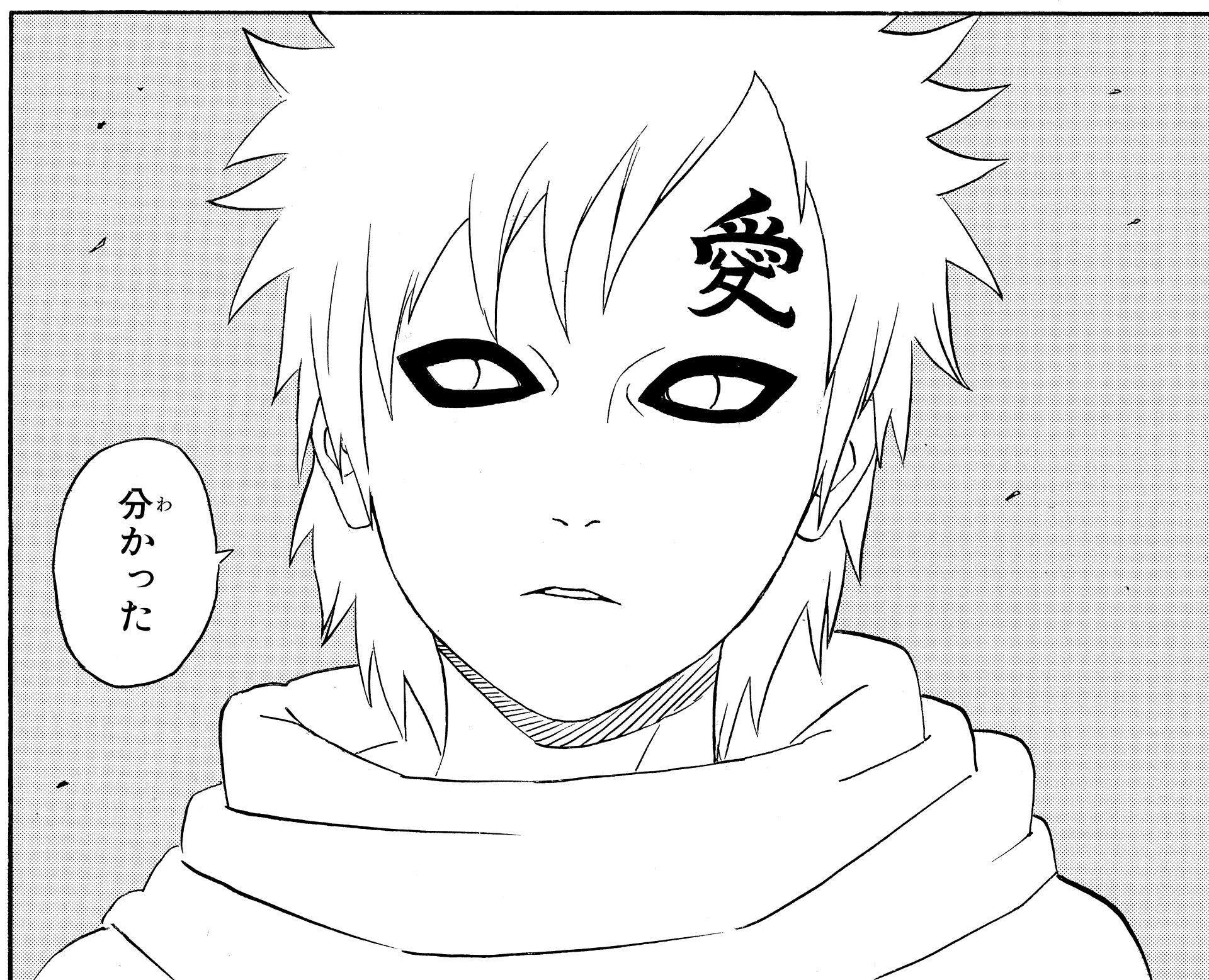 Having lost the only "love" easing the hurt in his heart, Gaara is overcome with despair, and carves "愛 (ai, love)" into his forehead as he comes to a painful realization.