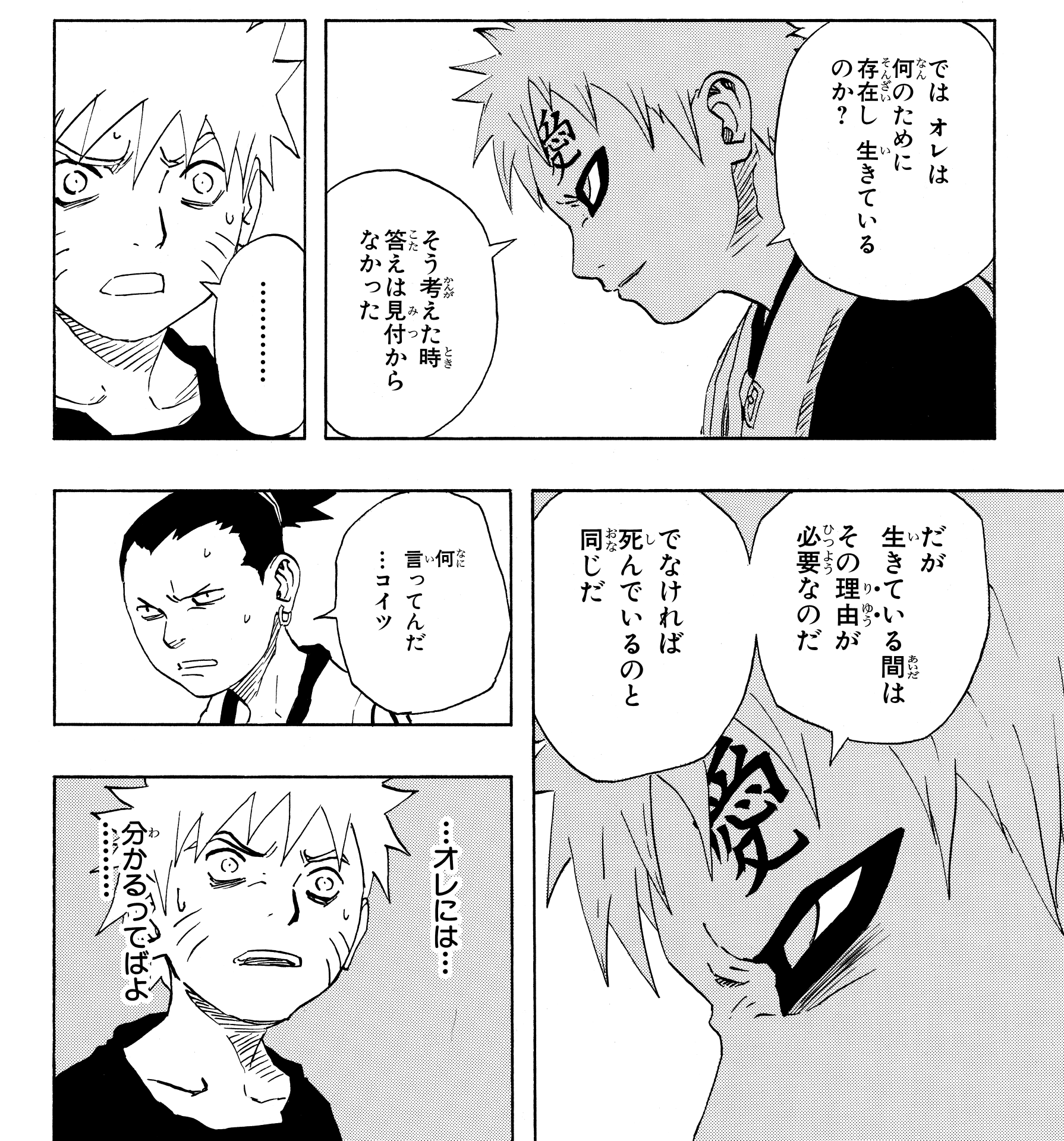 Later, when his awareness begins to return thanks to Granny Chiyo's jutsu, Gaara is adrift in doubts as he struggles to hold on to his sense of self once more, but he also hears a voice calling out his name.