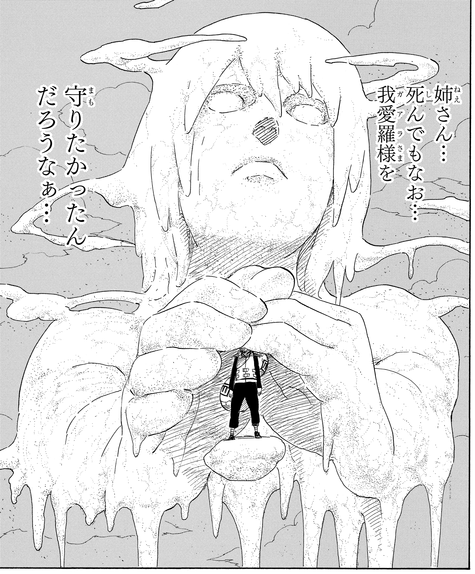 Hearing the truth that his mother's love persists even after her death, Gaara is overcome by tears, surrounded by sand that has taken the form of Karura.