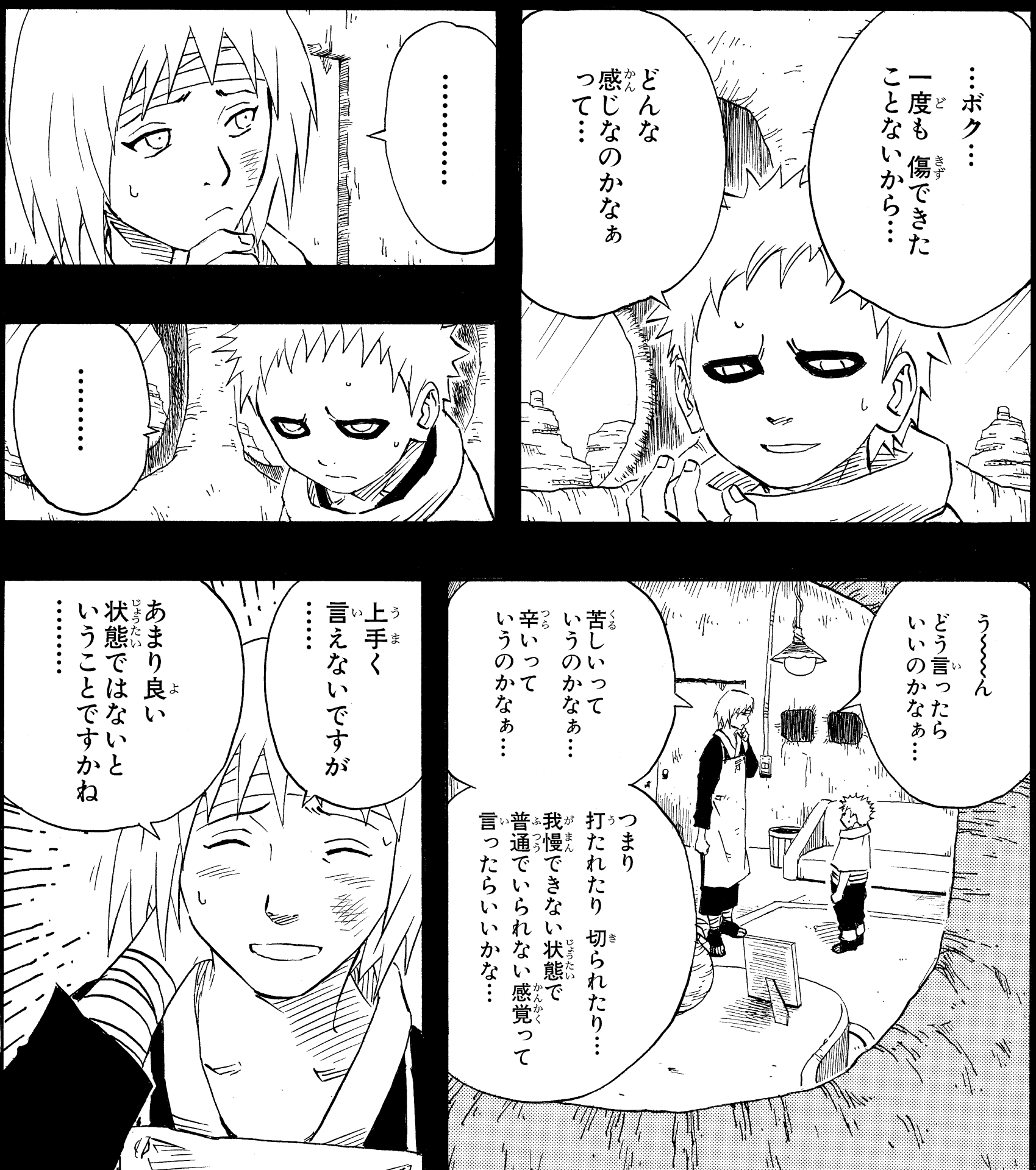 Due to Shukaku's protection, Gaara has never experienced the pain of physical wounds, and asks his uncle and caretaker, Yashamaru, to explain it to him.