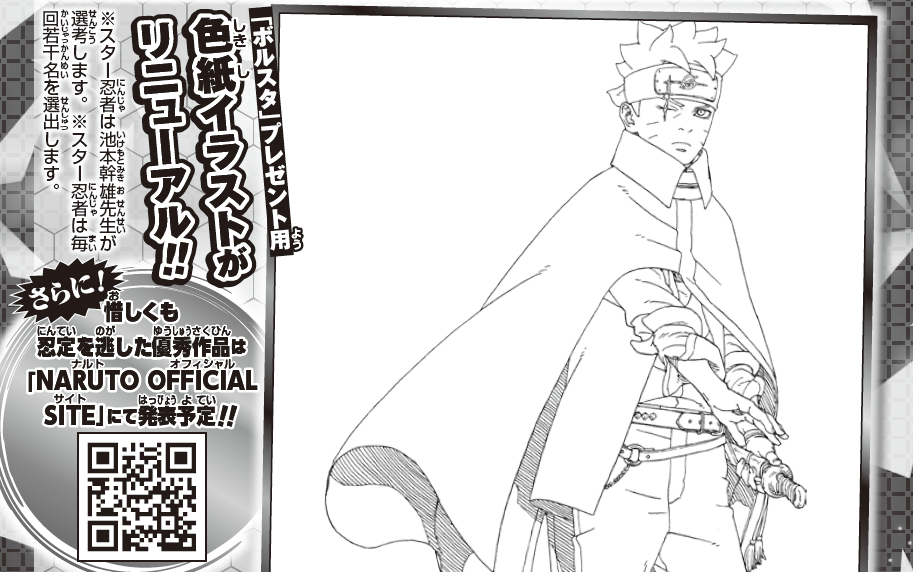 Designs submitted to the Boruto Star Certification contest must be entirely your own. If you win but it is discovered you used someone else's design, you will be disqualified. Mailed entries will not be returned, and will be disposed of after a certain period of time. If you want to keep your entry, please make a copy before mailing it. Rights to entries will be retained by the creators, but entries may be published in releases/announcements regarding this contest, Boruto manga volumes, the V Jump magazine, the official V Jump and Boruto X accounts, and official Shueisha sites such as V JUMP WEB and the NARUTO OFFICIAL SITE.
