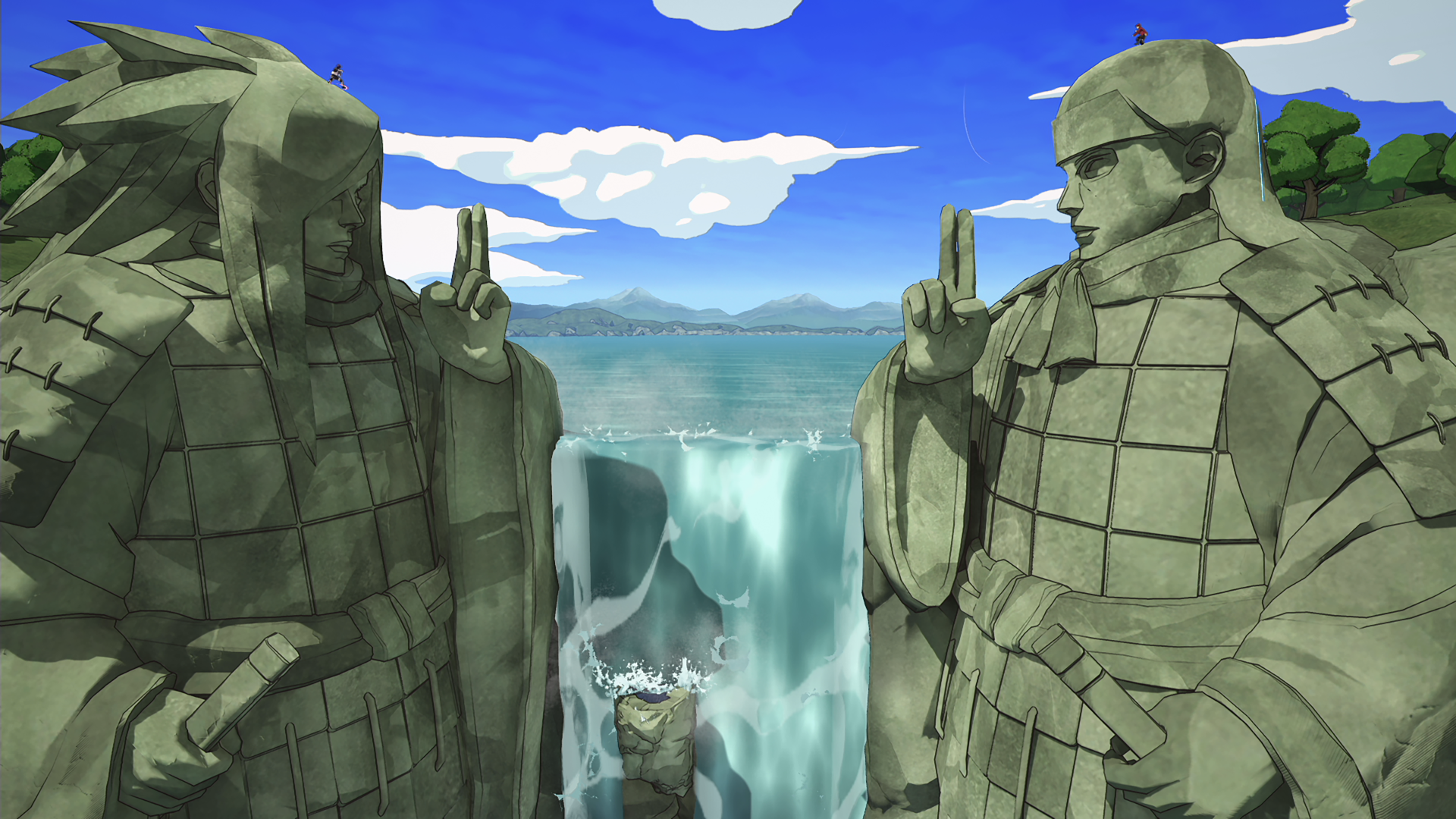 The center of the map features the statues of Hashirama and Madara facing each other across a giant waterfall. The areas around the top and bottom of the falls are relatively free of obstacles, but caves lie hidden behind the water. This is a map where the geographical features of different areas must be considered carefully when fighting.