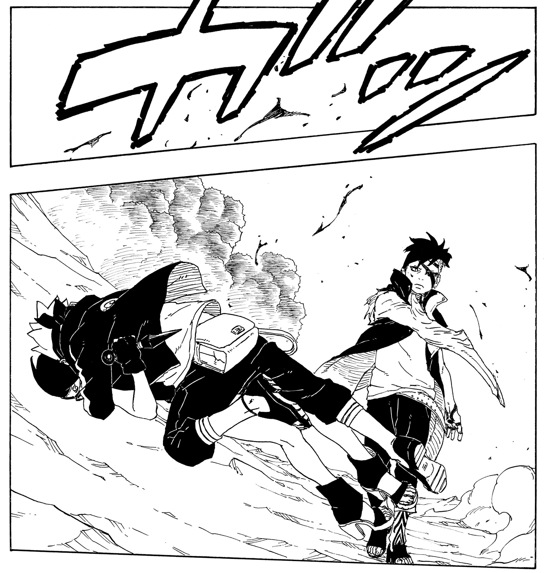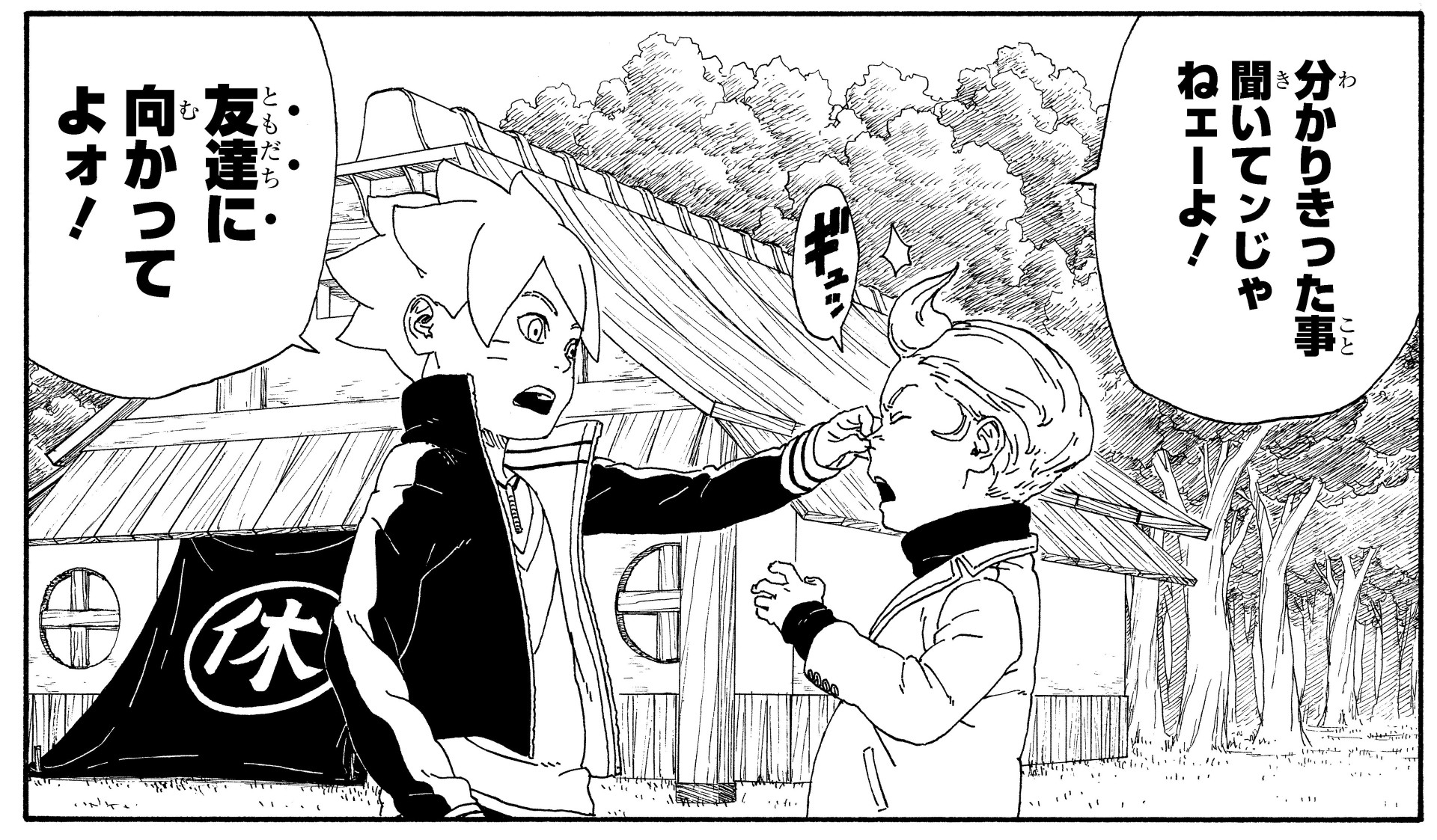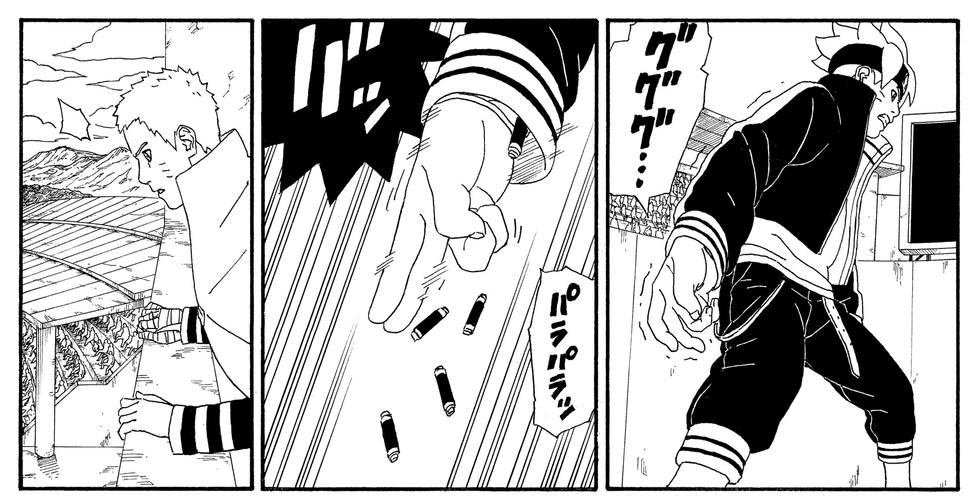 Boruto is rushing home in the wake of his parents' disappearance when he runs into Kawaki. His attempts to talk the older boy down fail, and the two come to blows.