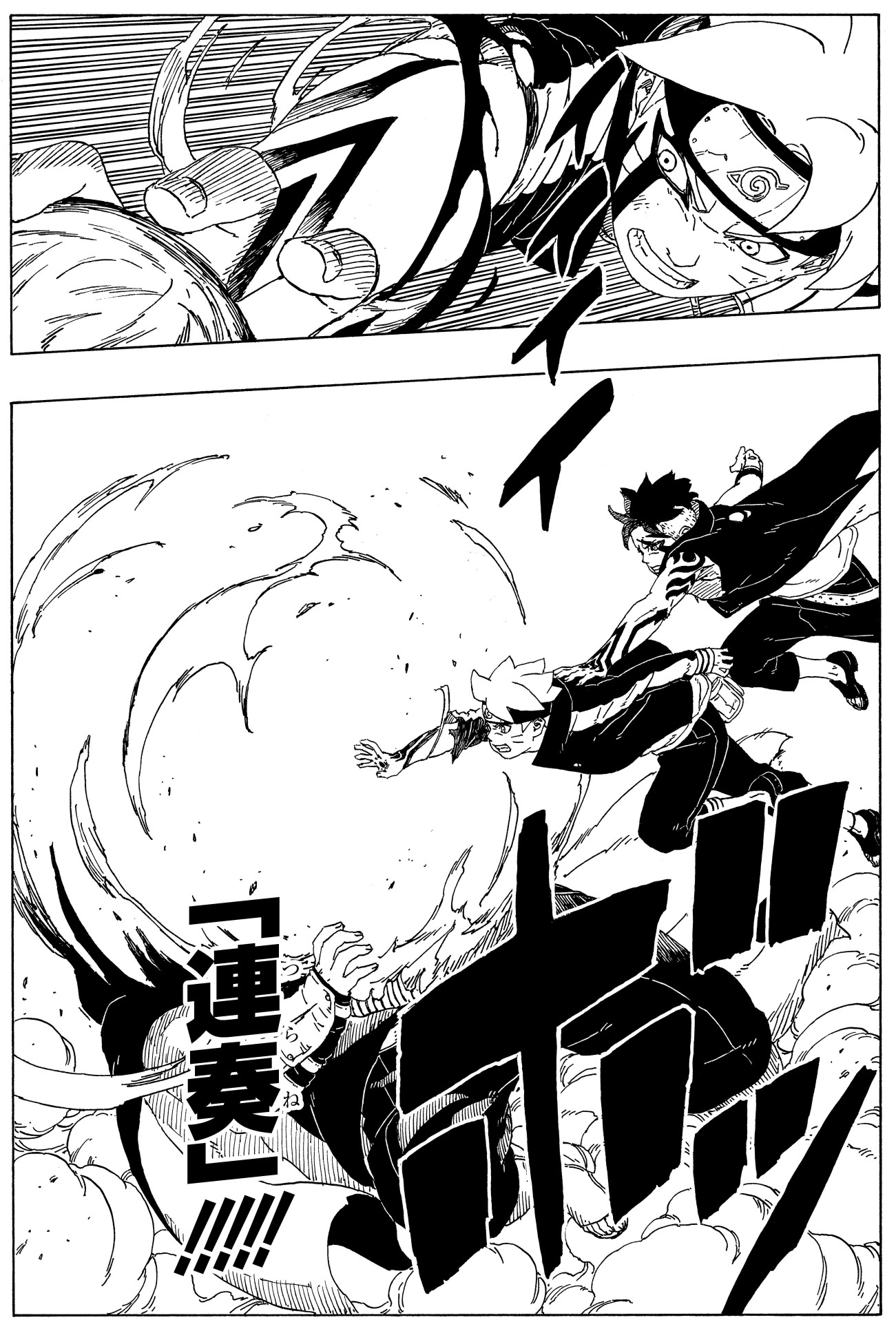 Confused, Boruto evades his friend's assault as Momoshiki fills his host in on the truth of what has happened.