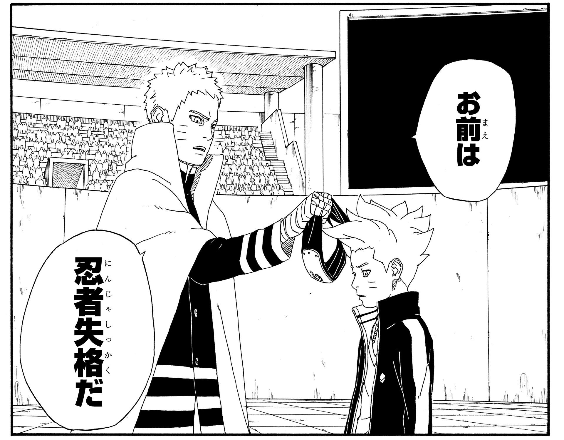 Forced to pass judgement on his son, Naruto strips Boruto of his headband, saying he's "not worthy of being a ninja."
