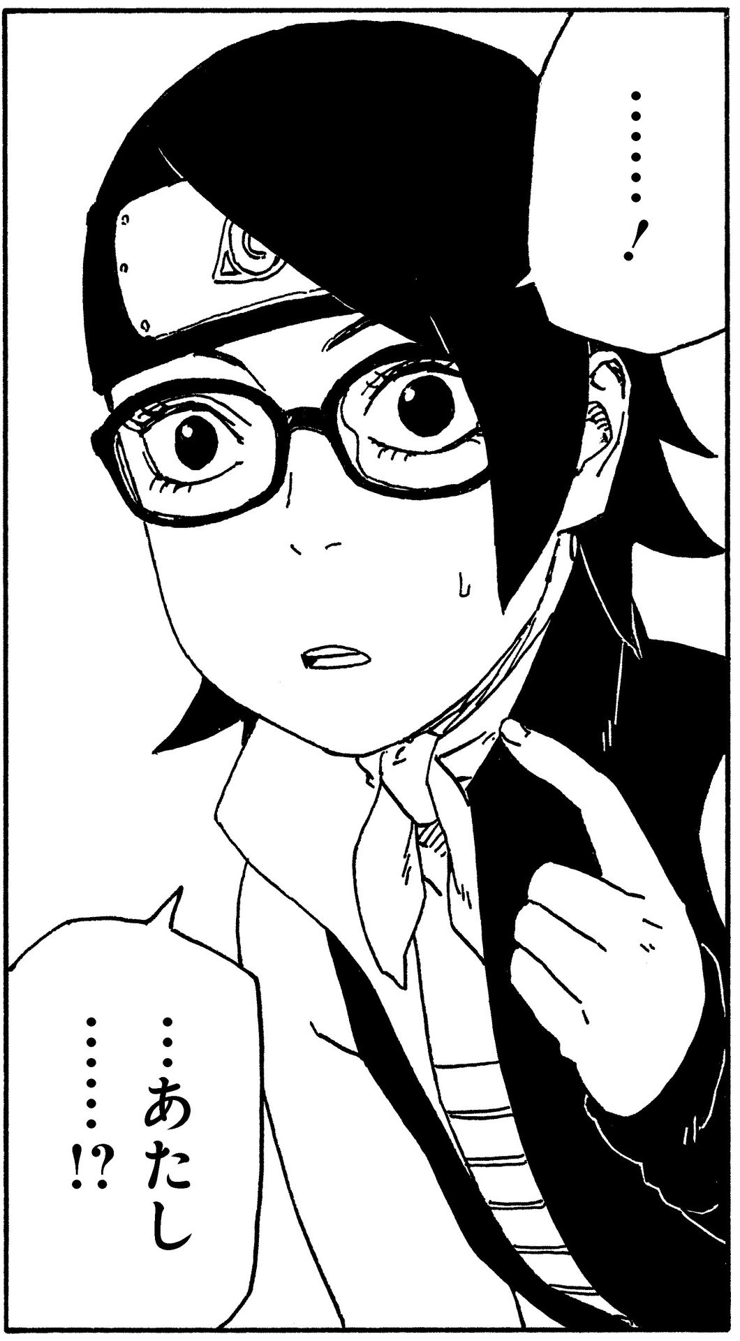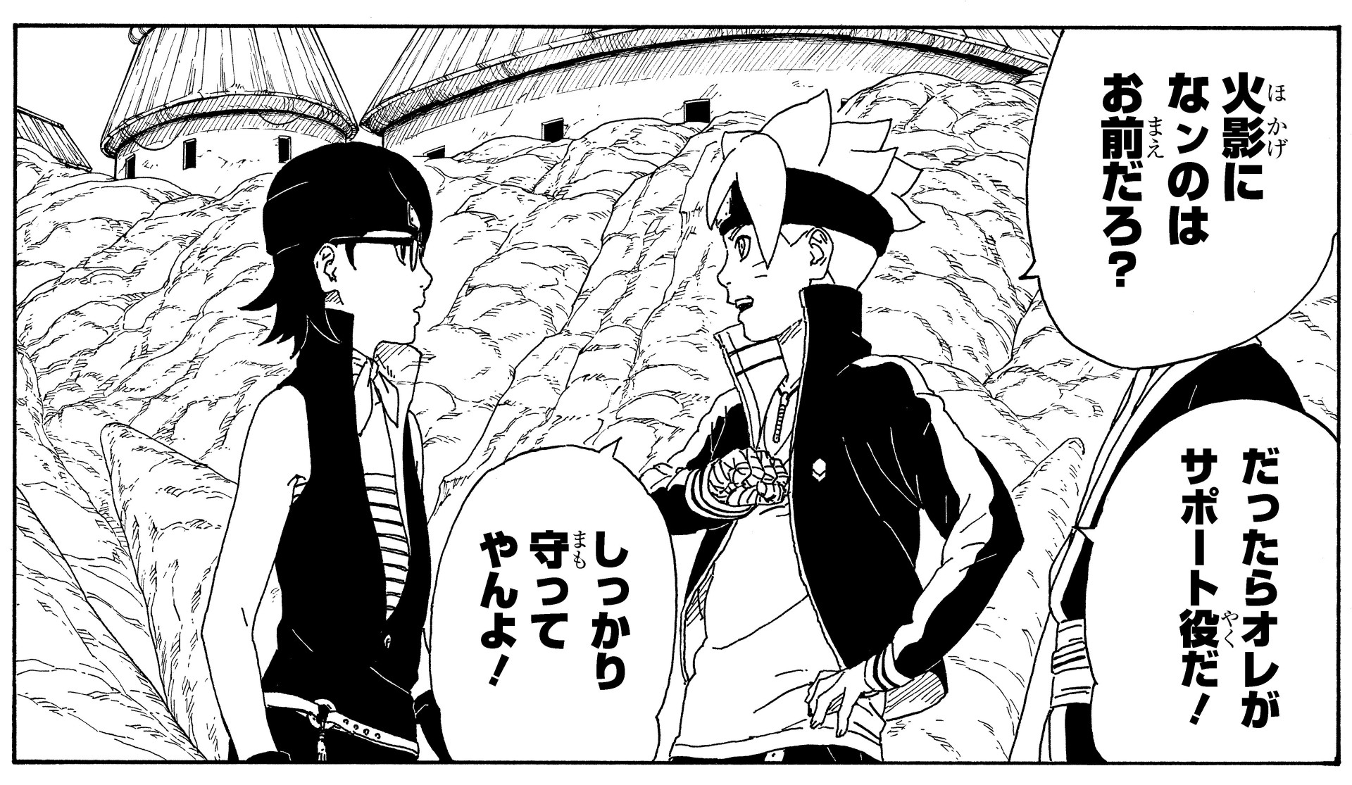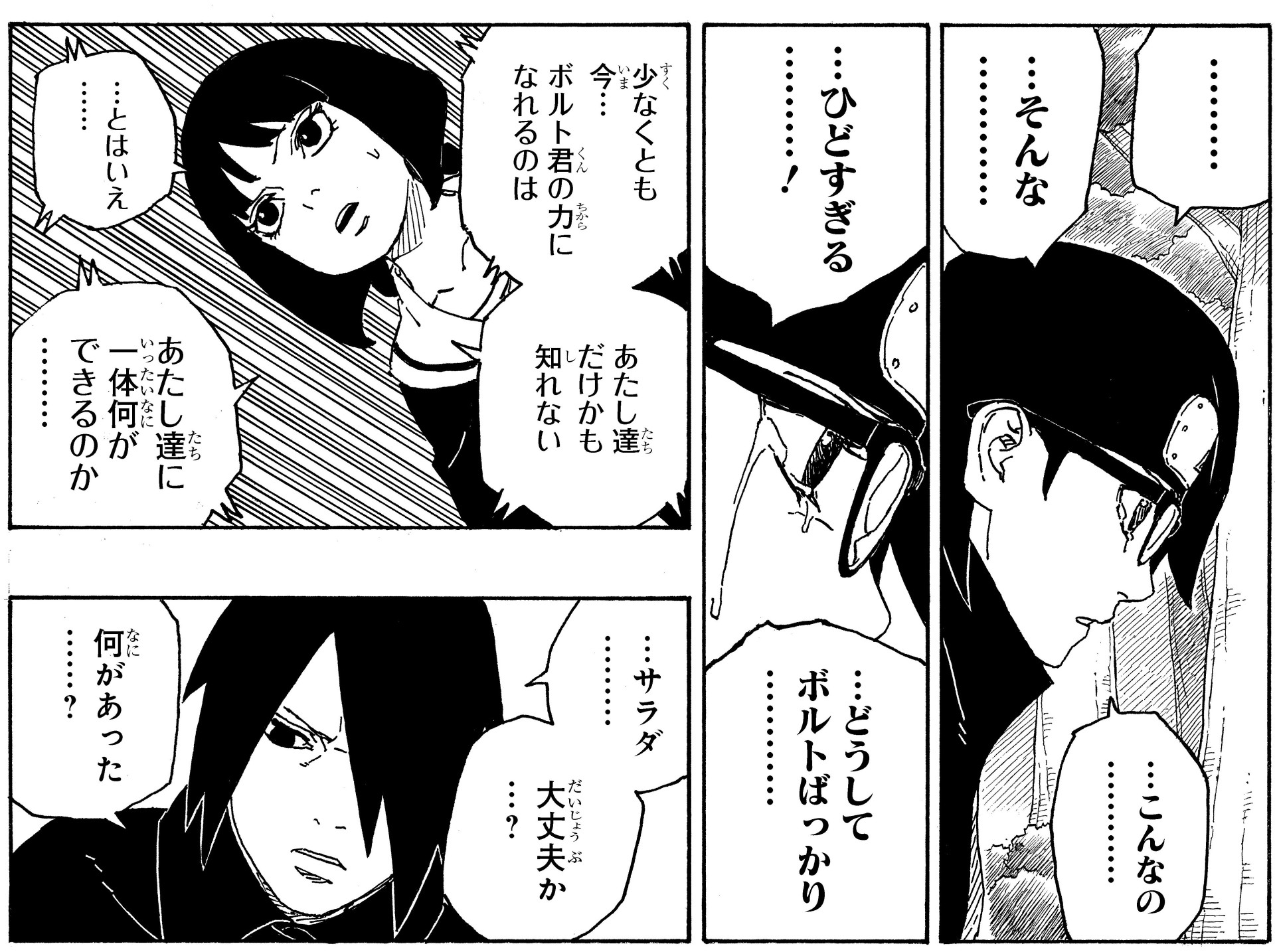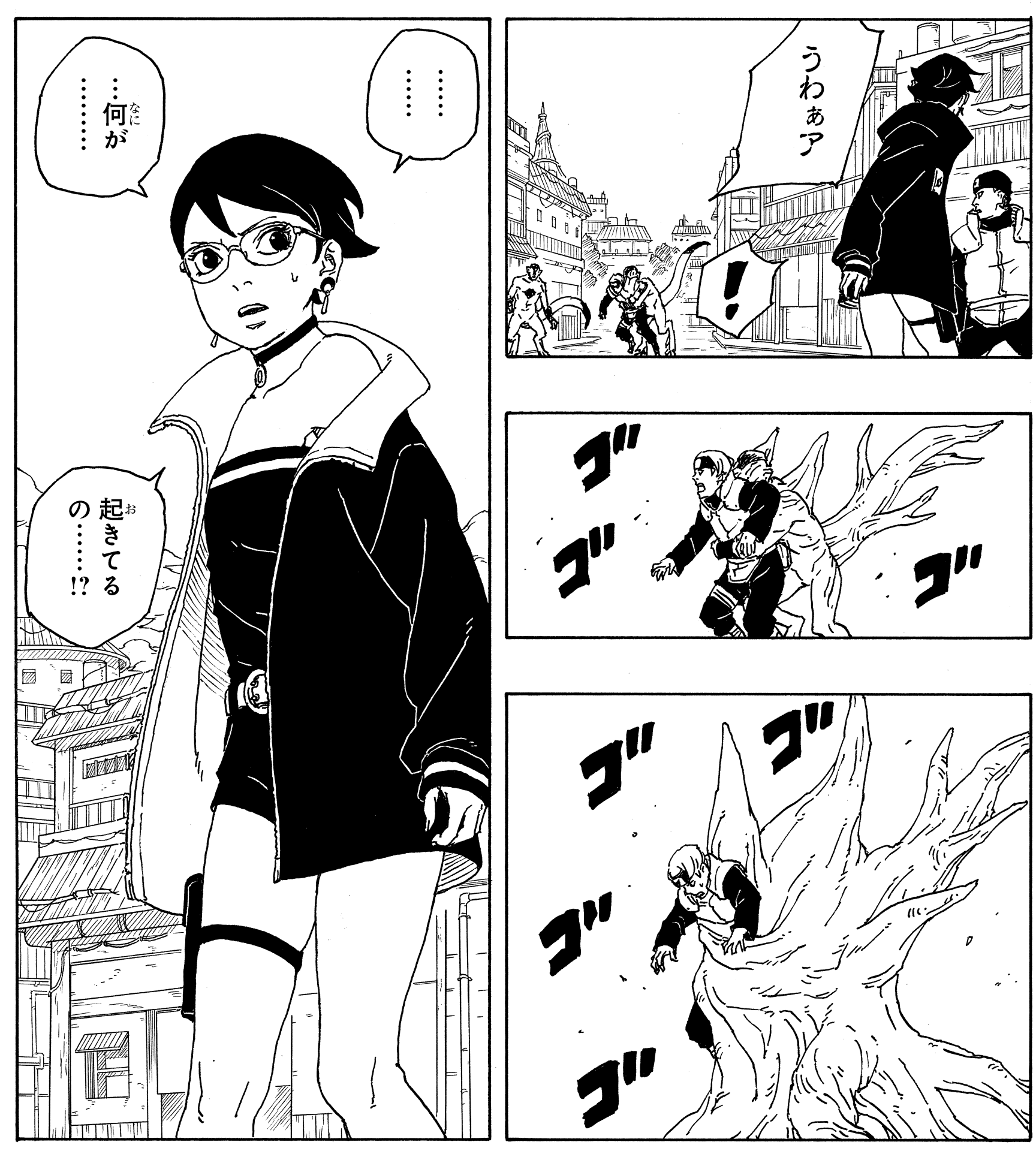 Sarada is baffled, because it seems that Kawaki—who up till then was being chased by the ninja of Konoha—and Boruto's situations have switched.