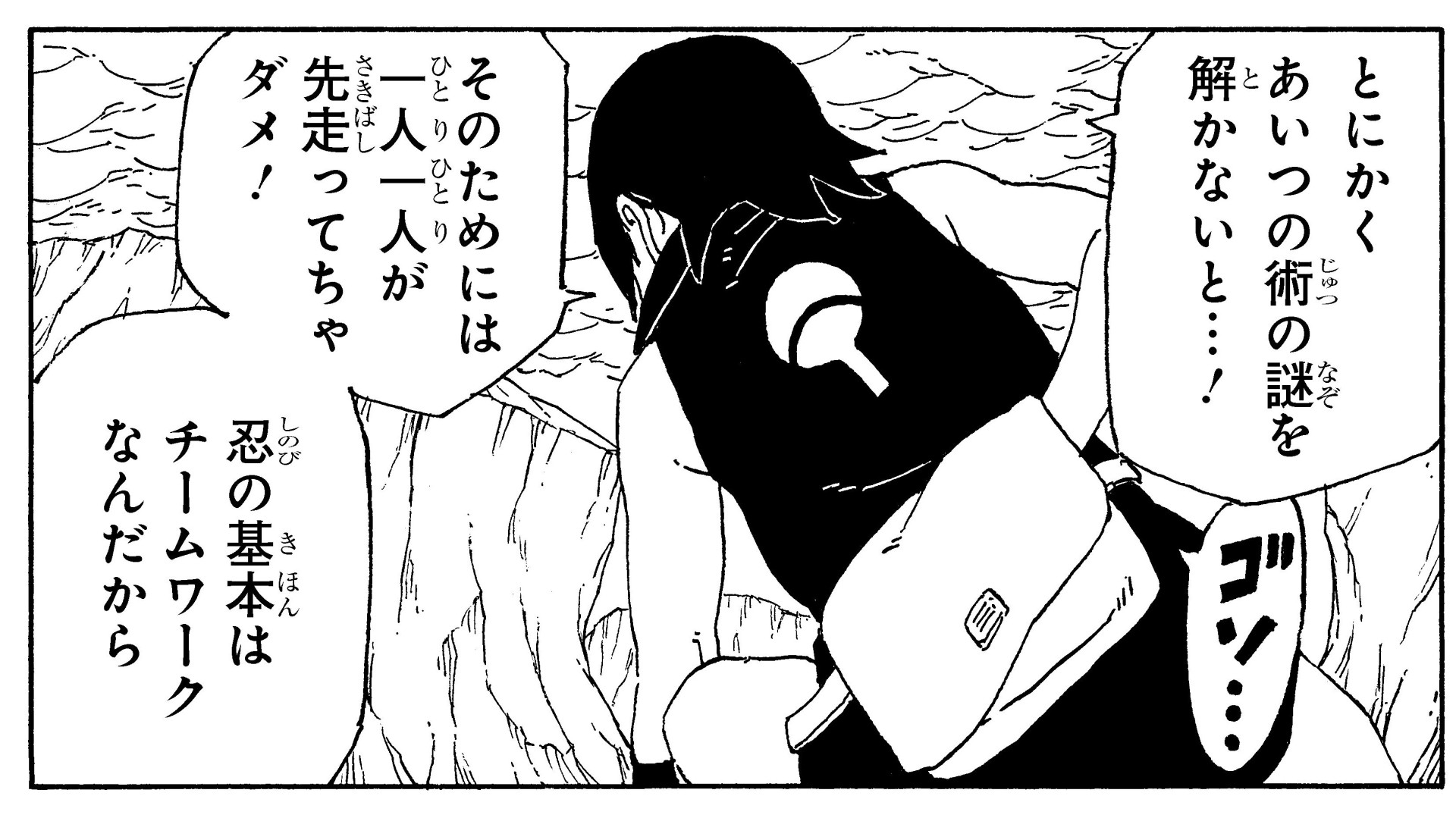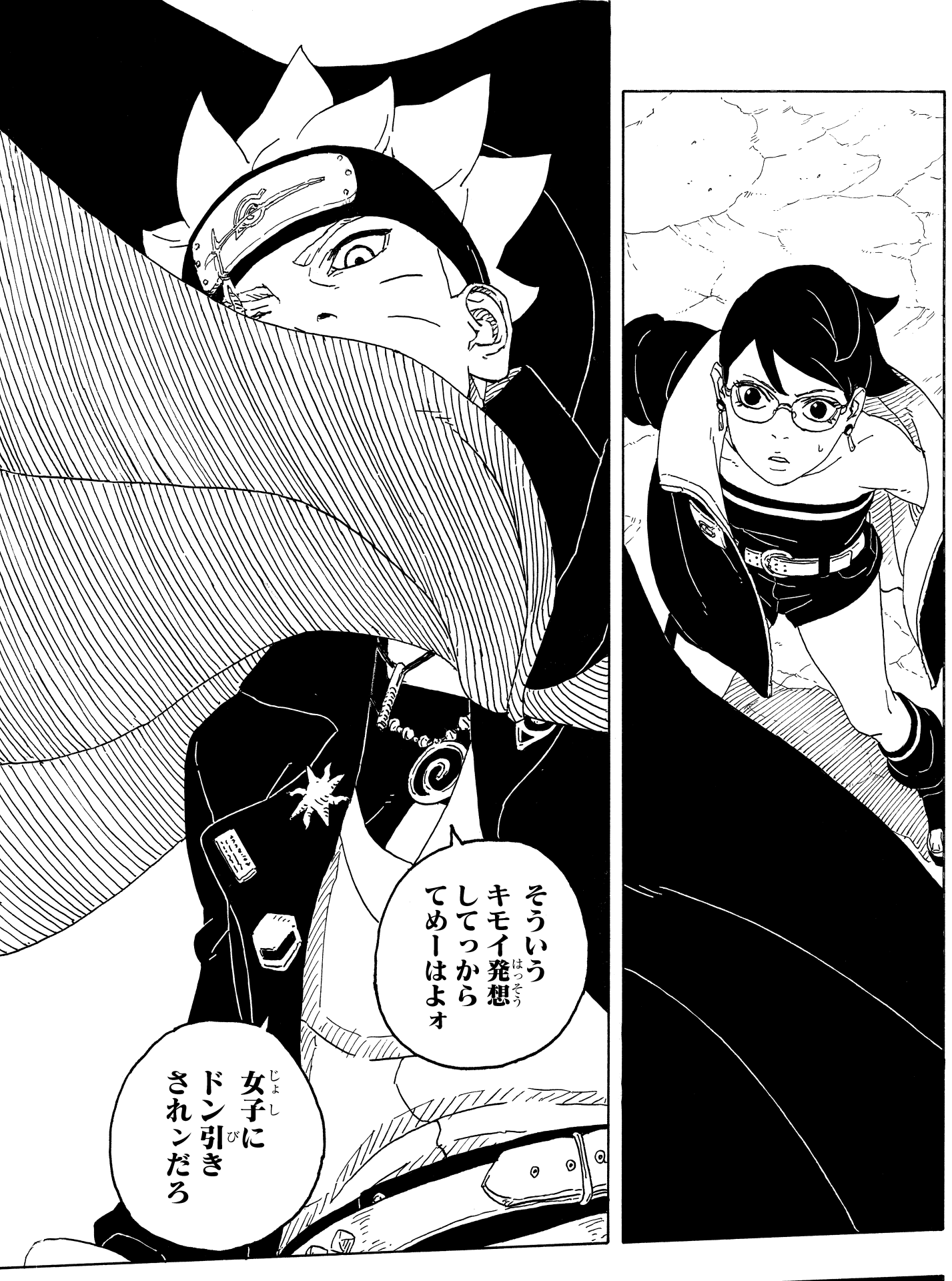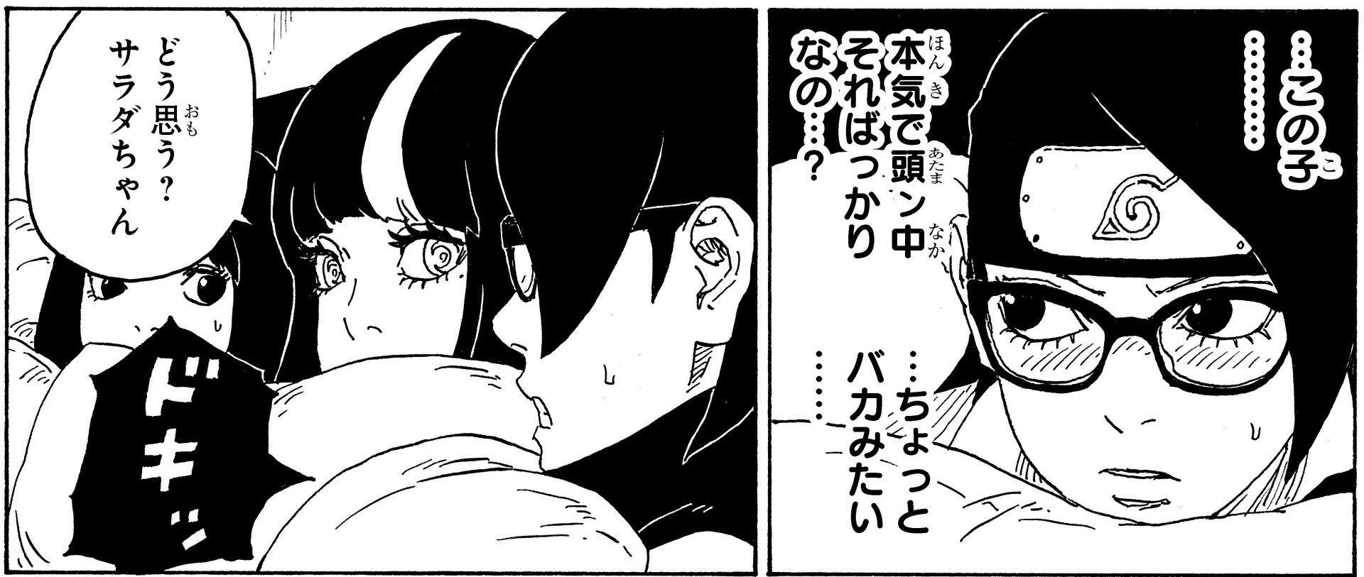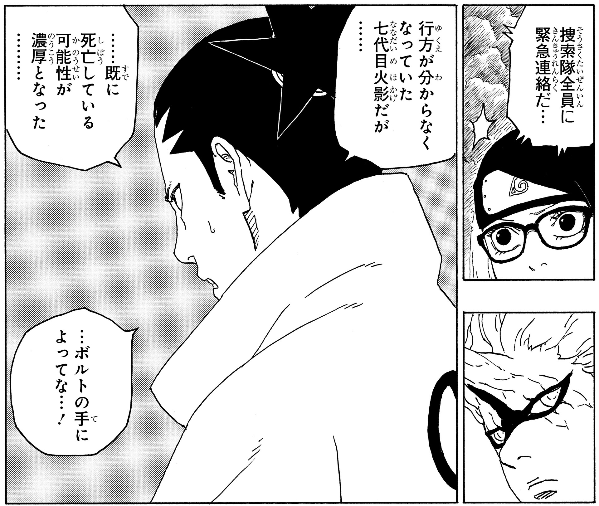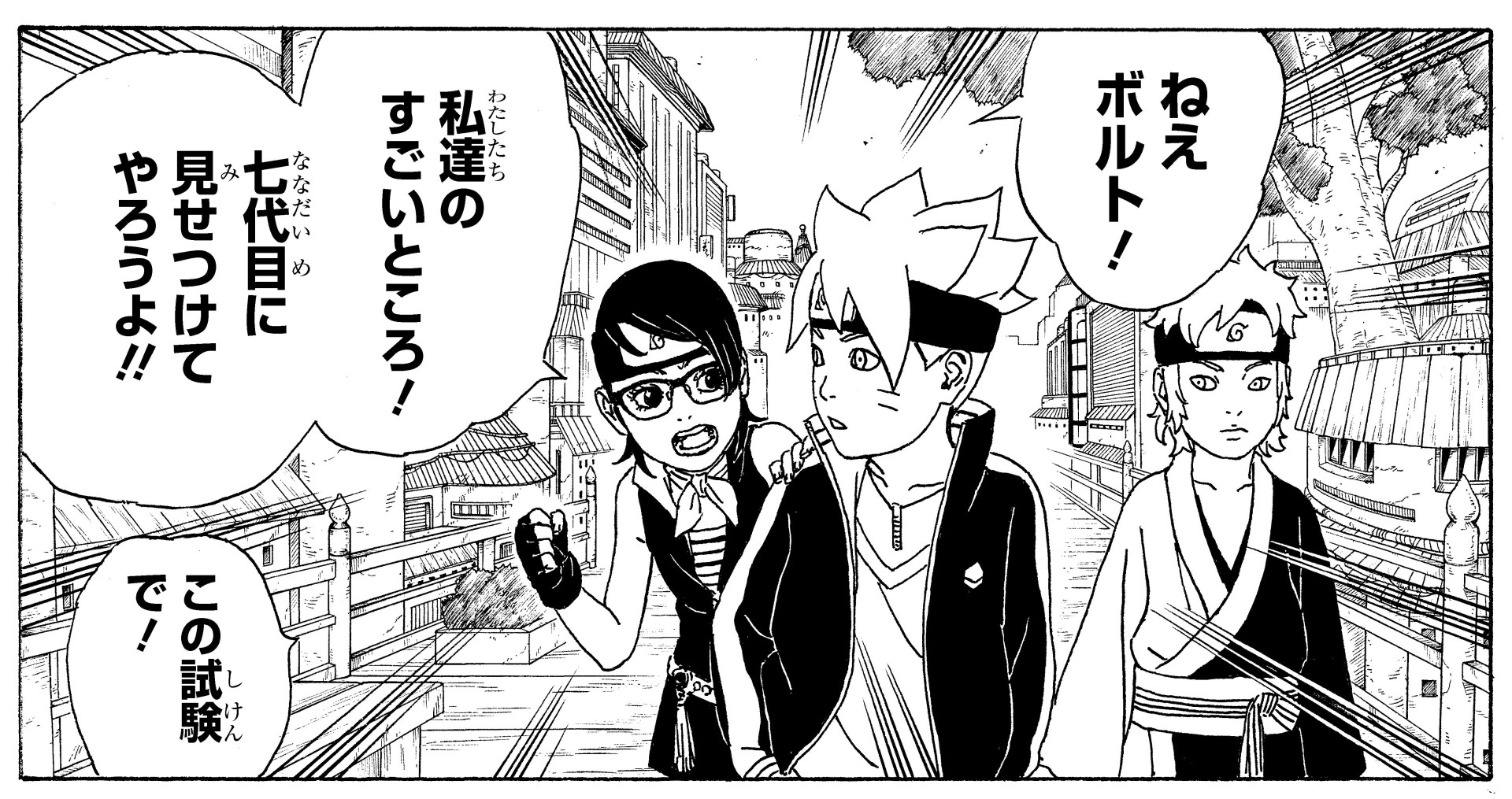 Sarada is baffled, because it seems that Kawaki—who up till then was being chased by the ninja of Konoha—and Boruto's situations have switched.