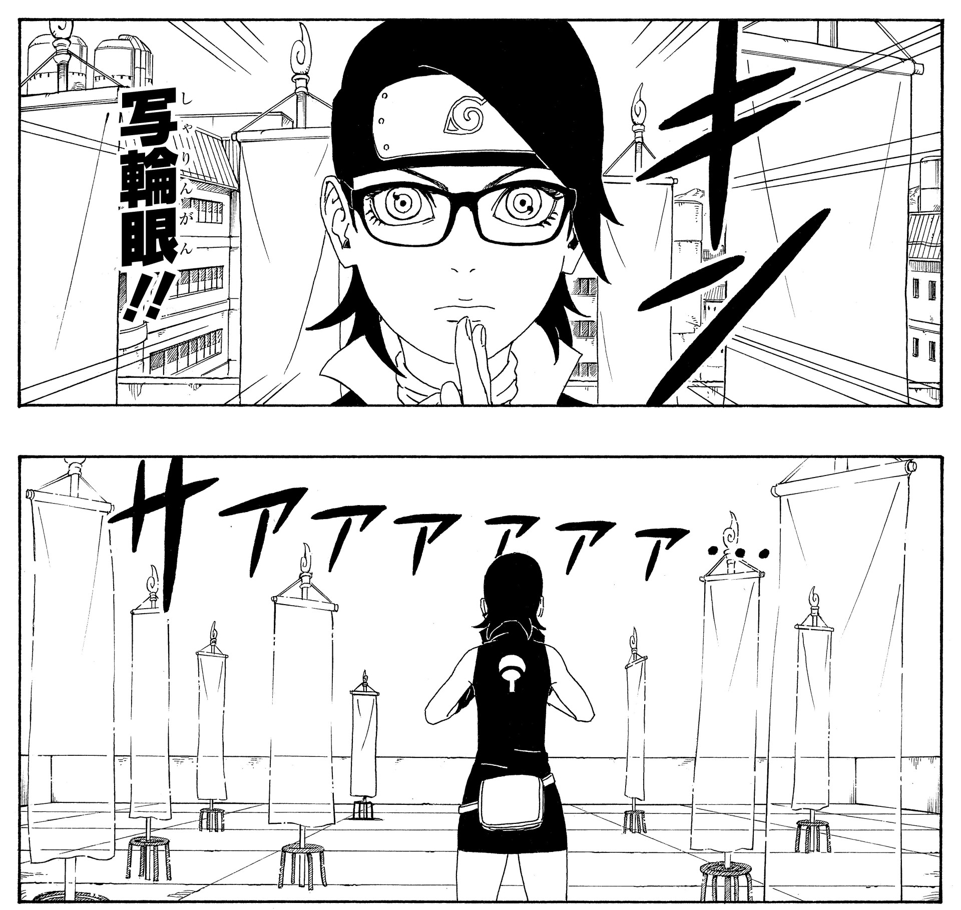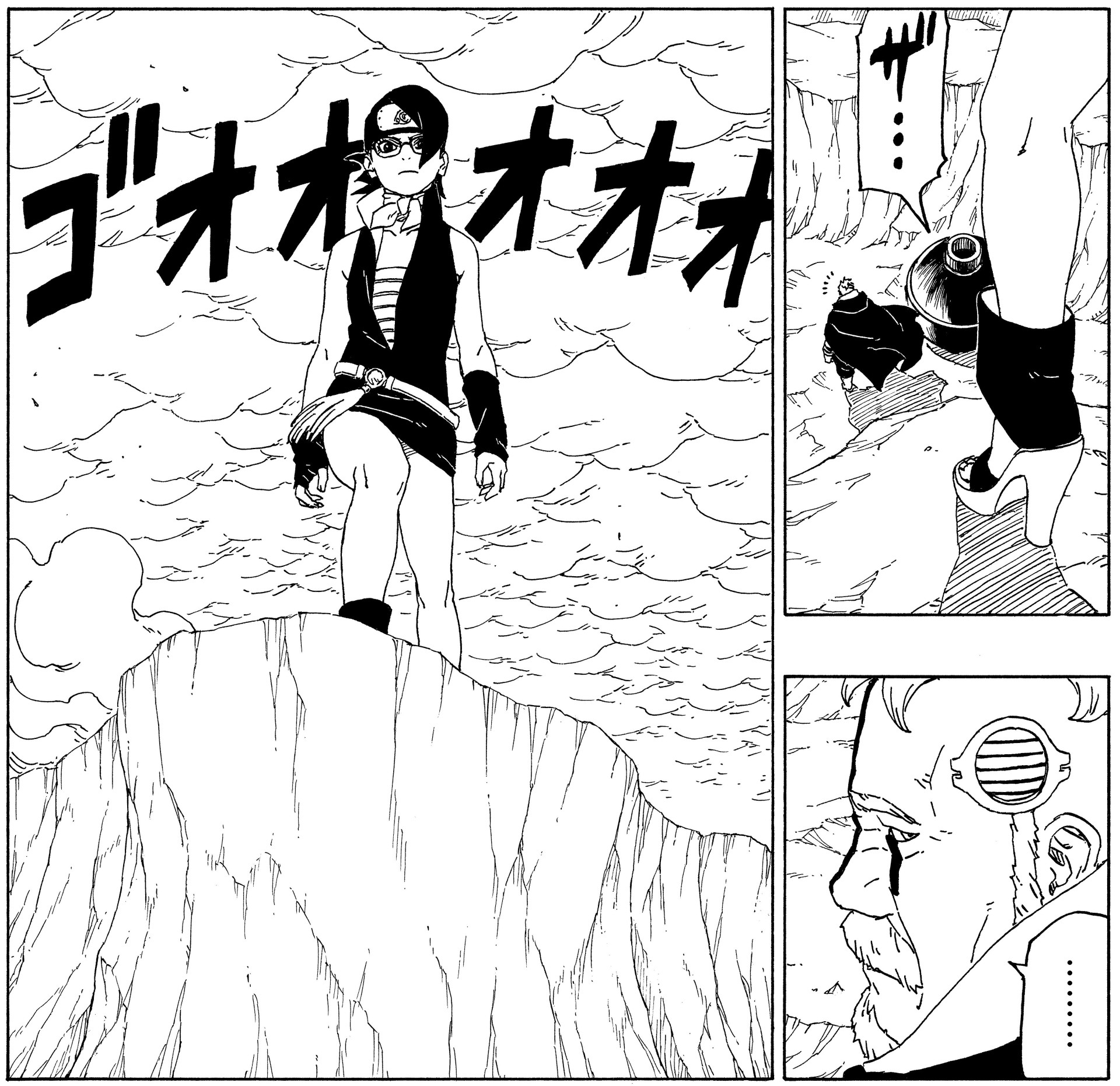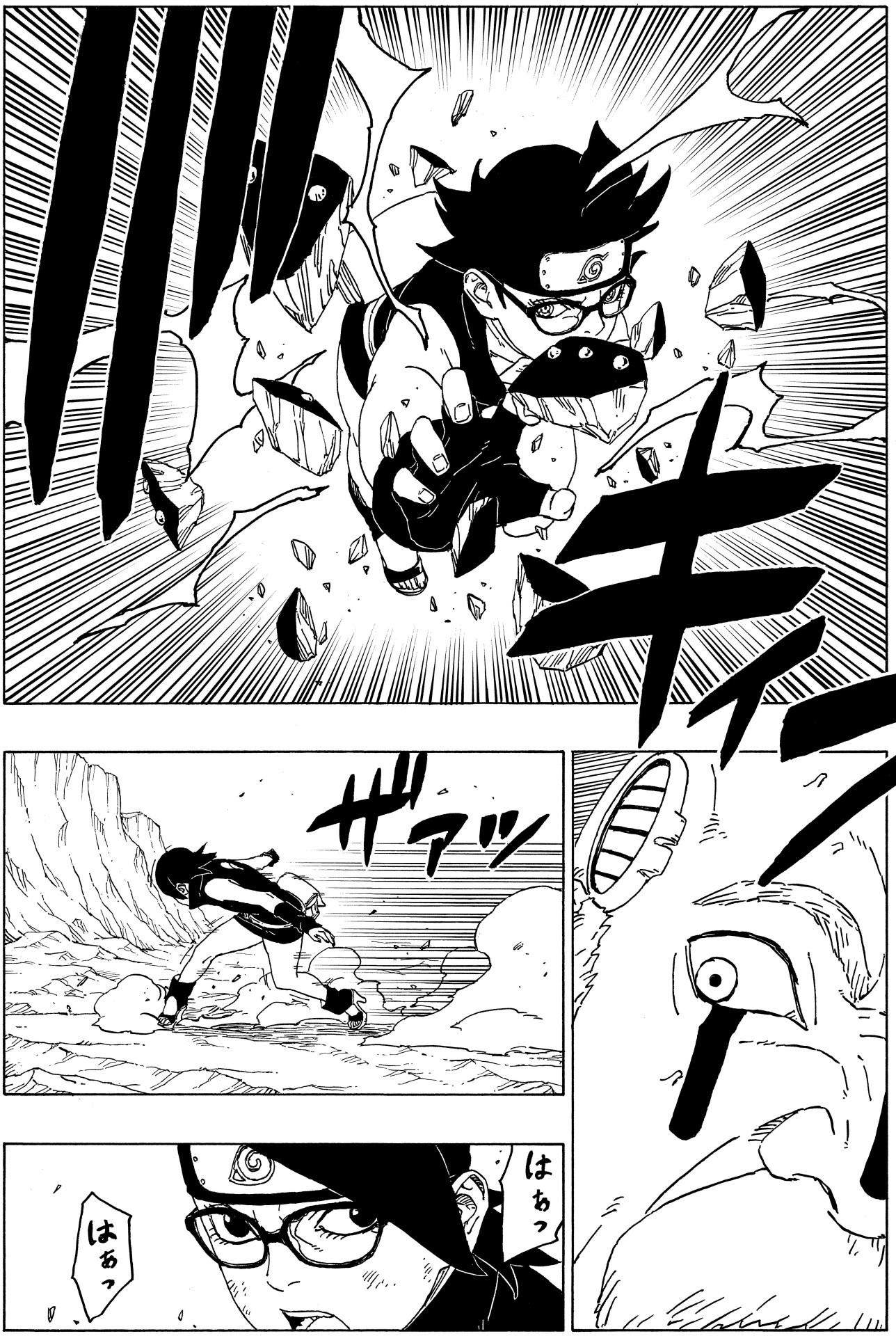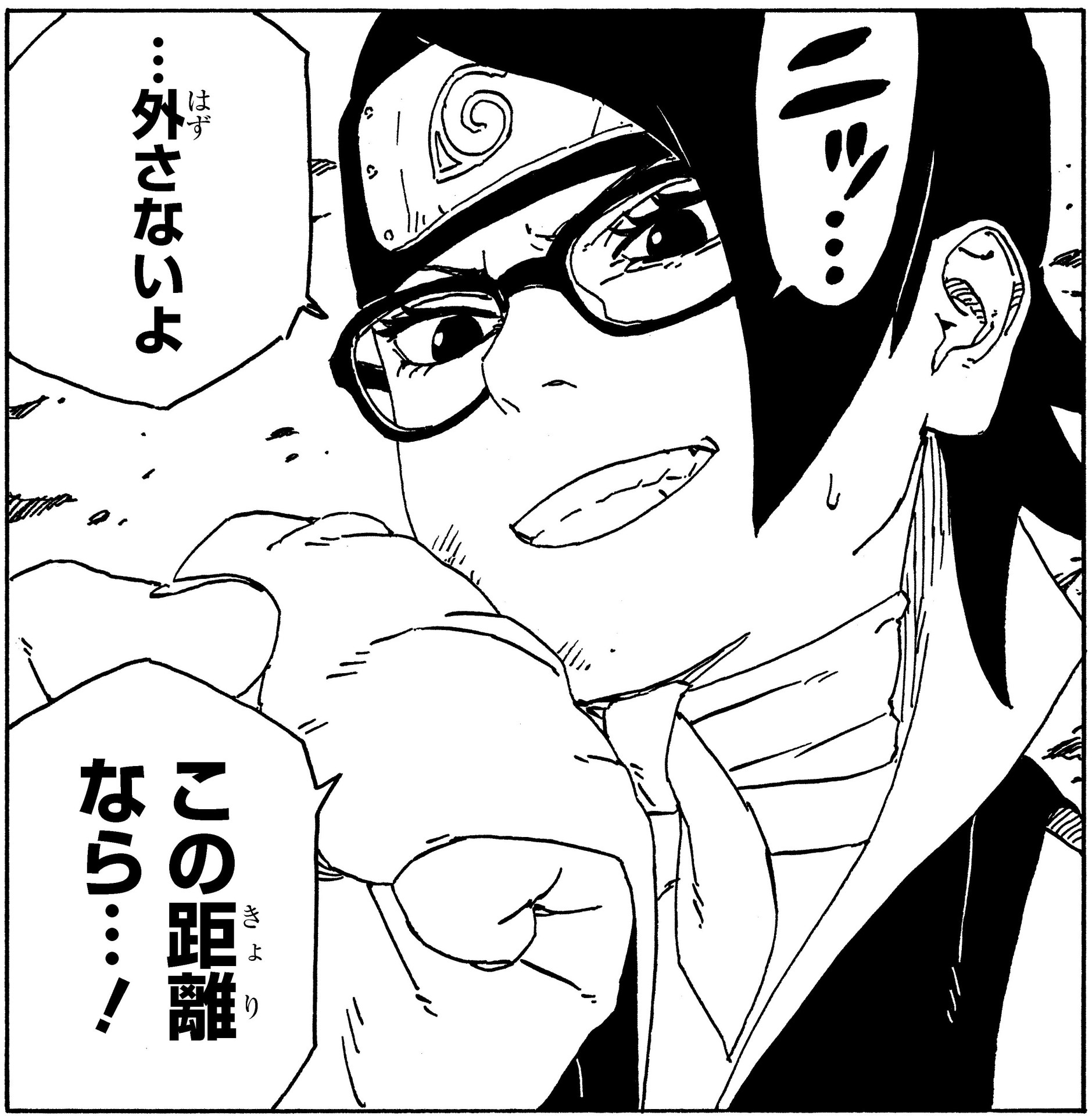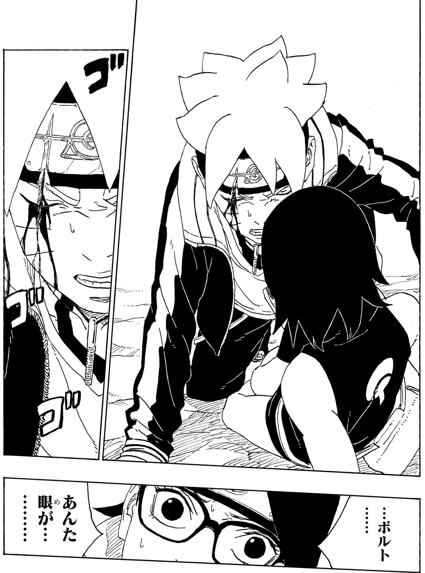 As Kawaki and the others continue to fight Boro, Sarada uses her Sharingan to find the "core" that migrates within his body.