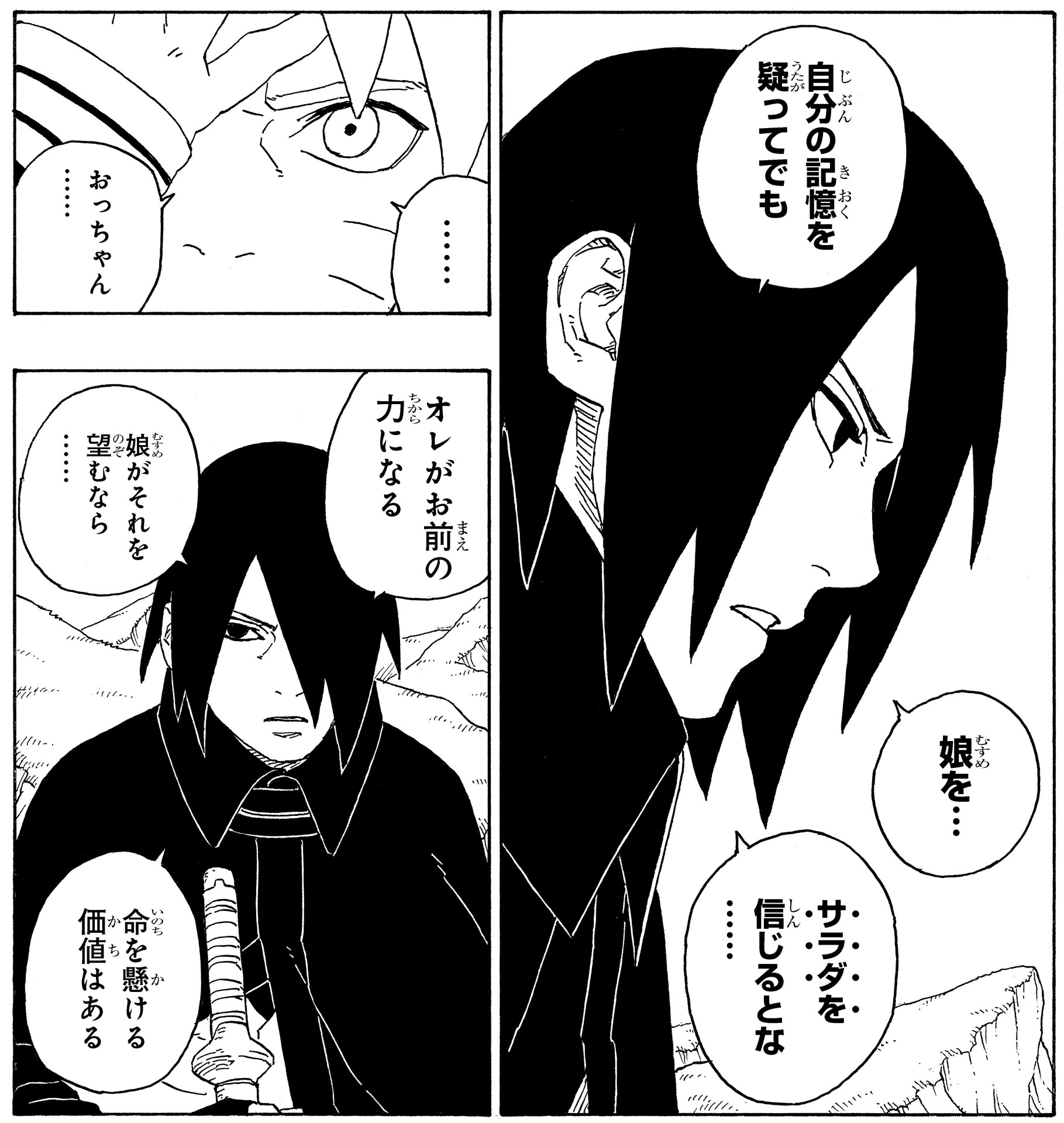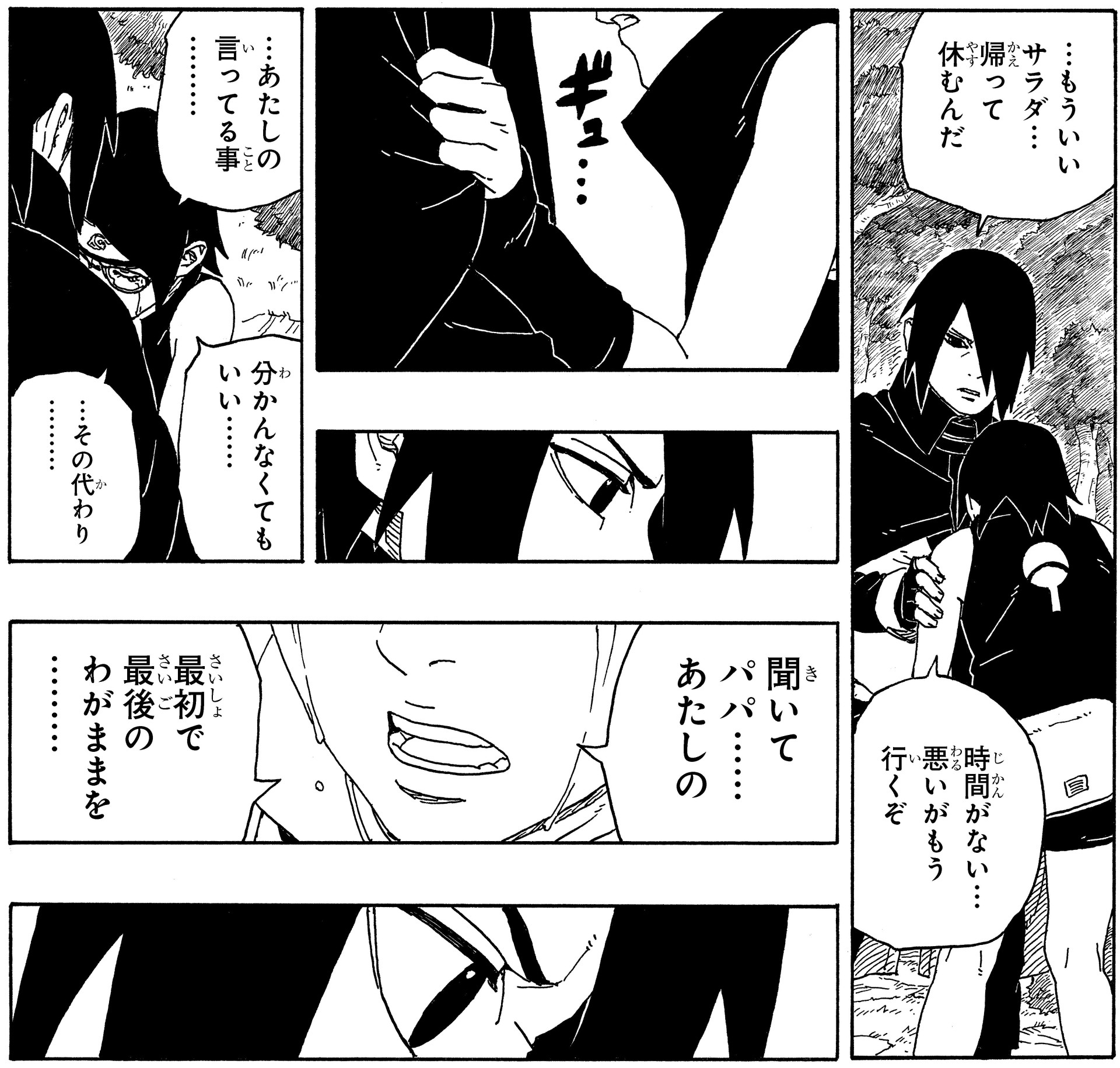 Believing in his daughter and acquiescing to her plea, Sasuke takes Boruto with him and escapes the village.