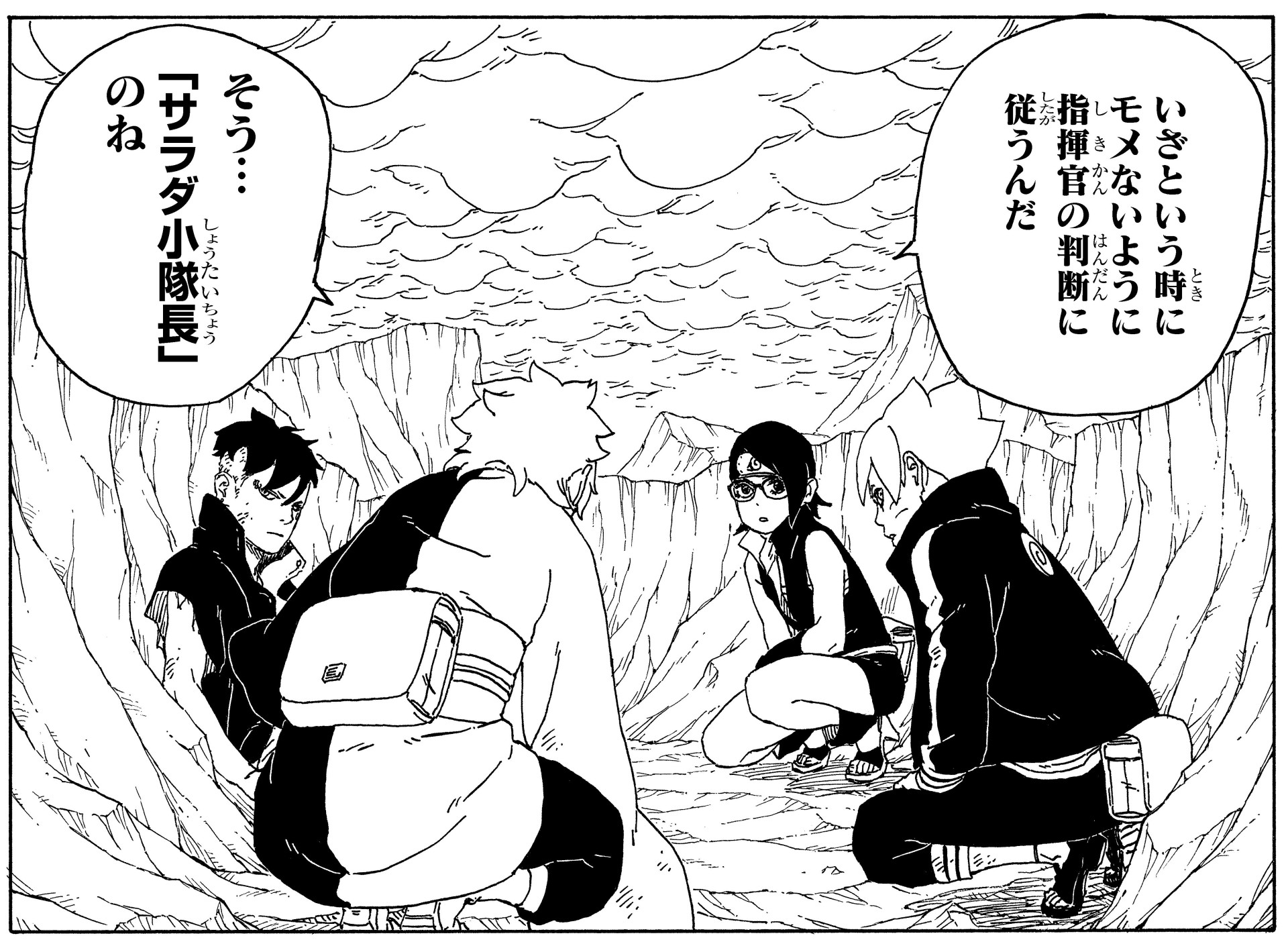 The team manages to retreat and regroup, and Sarada tries to devise a plan.