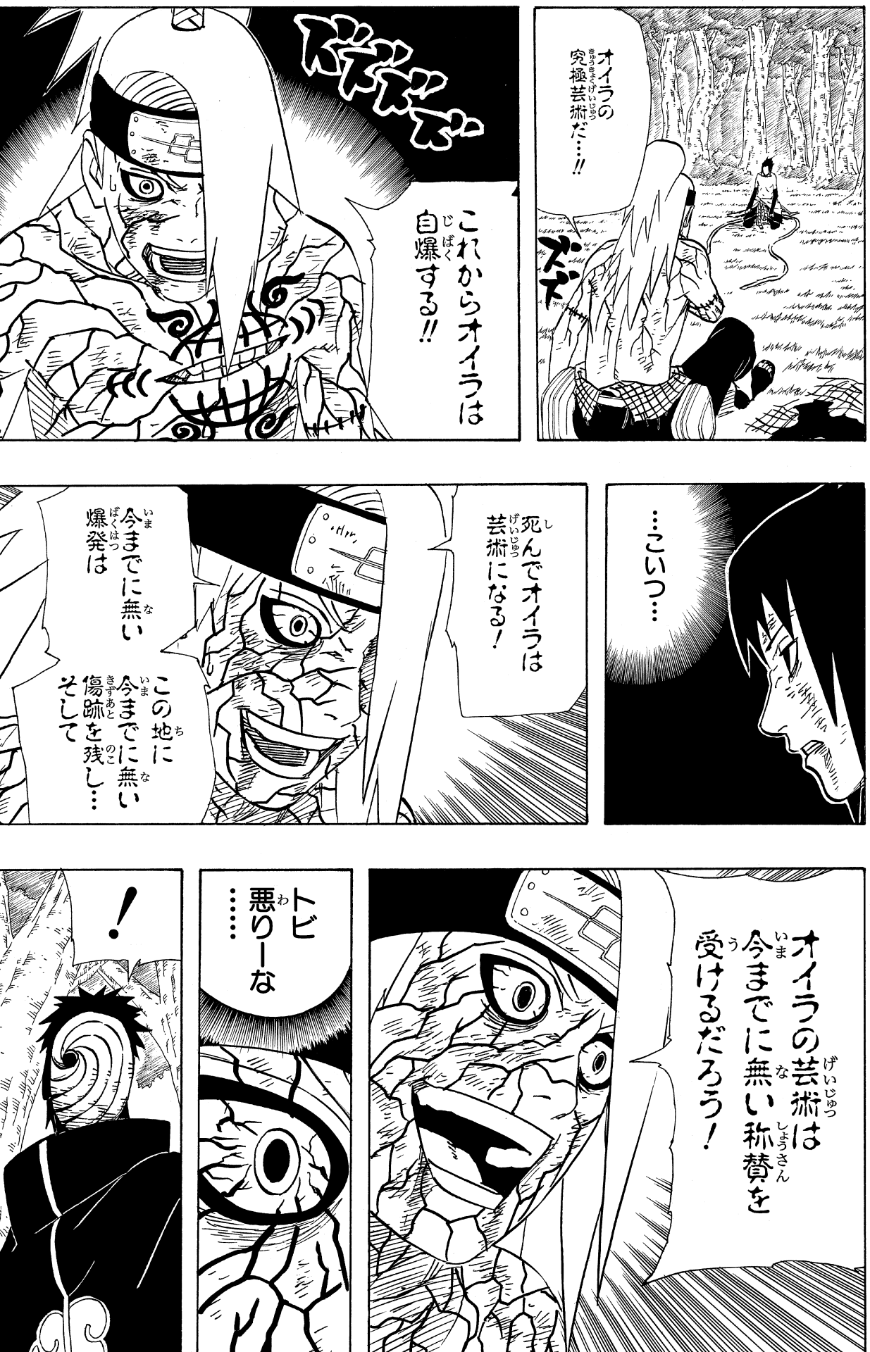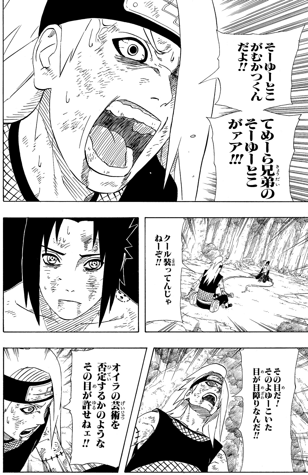 Bearing the same eyes as his older brother, Sasuke survives all of Deidara's vaunted clay attacks.