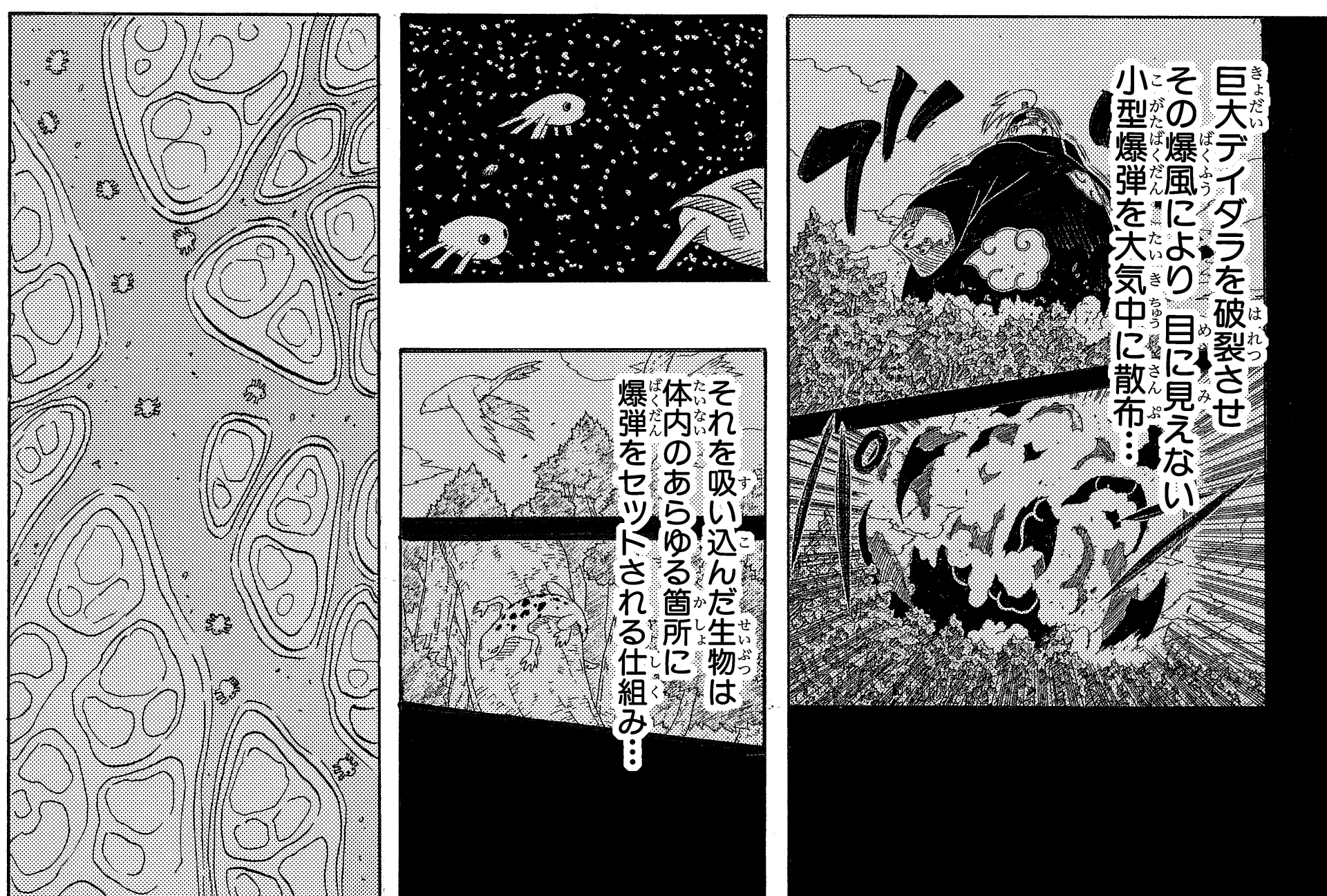 Opponents inhale the bombs, riddling their bodies with mini-explosives that destroy them from the inside. He developed this impressive technique with the goal of killing Itachi, and even Tobi recognizes it as a formidable jutsu.