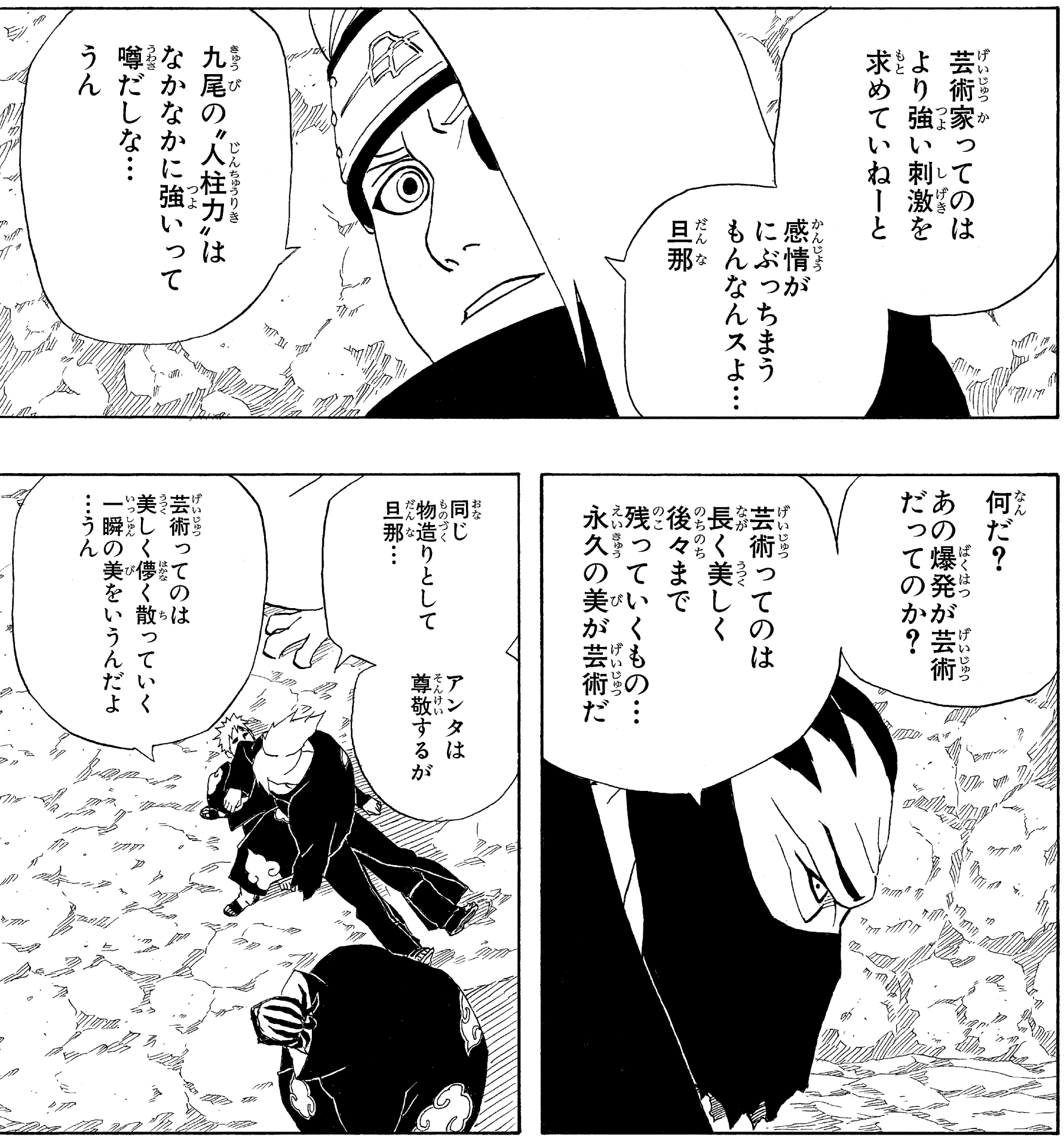 Finding himself unconsciously admiring Itachi's own artistry, Deidara seems to feel a brief sense of inferiority.