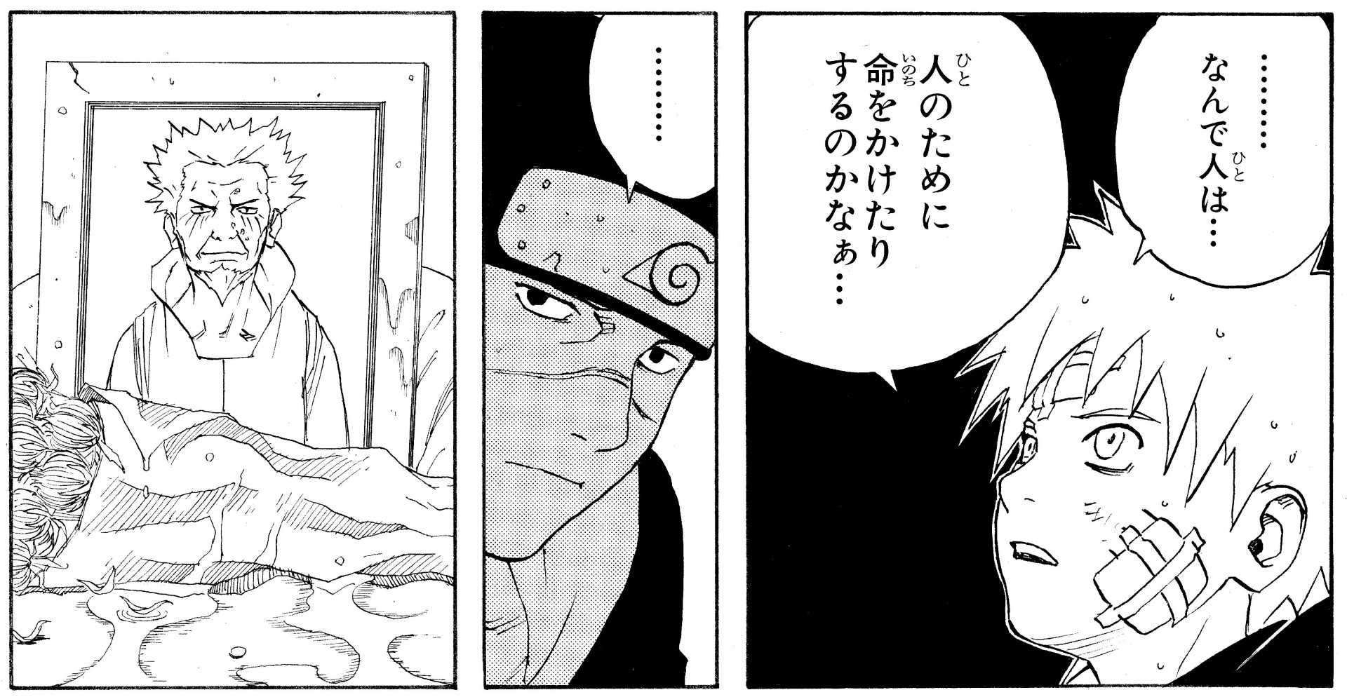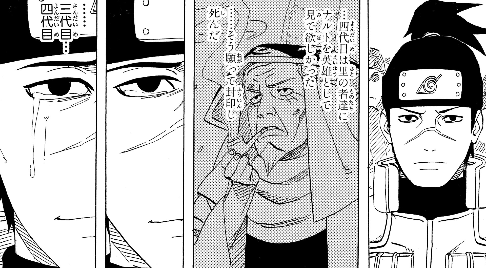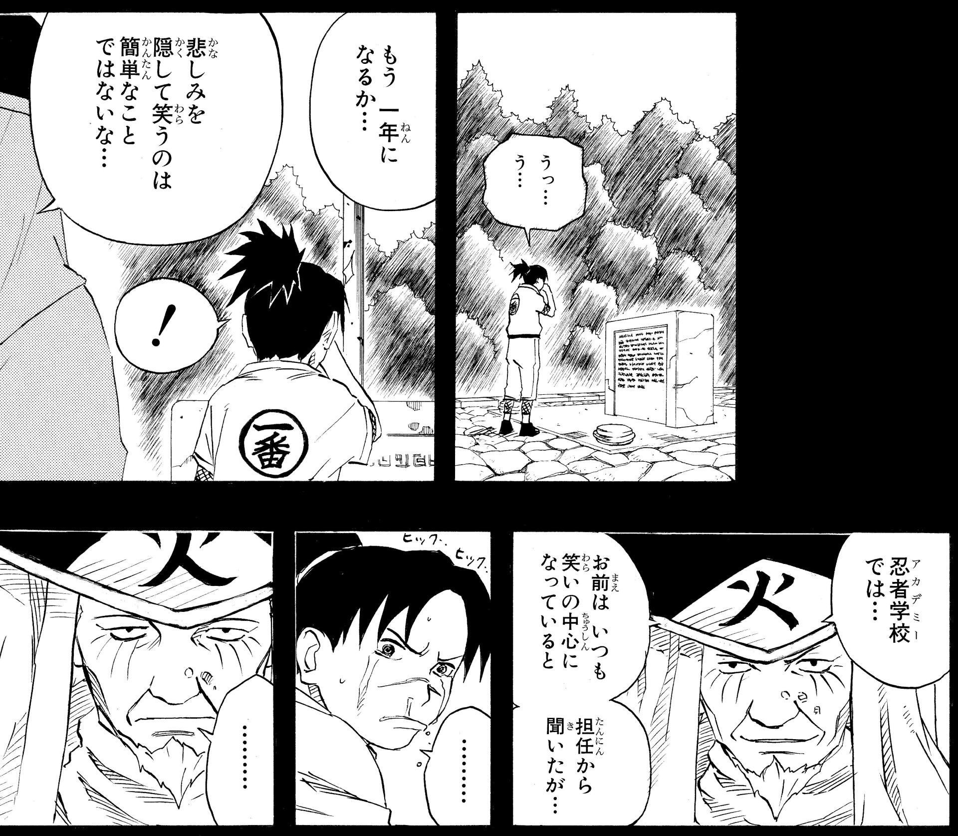 Despite the death of the man who mentored him in the past, Iruka stoically bears his sadness in order to comfort Konohamaru in the same way that he himself was once comforted by Hiruzen.