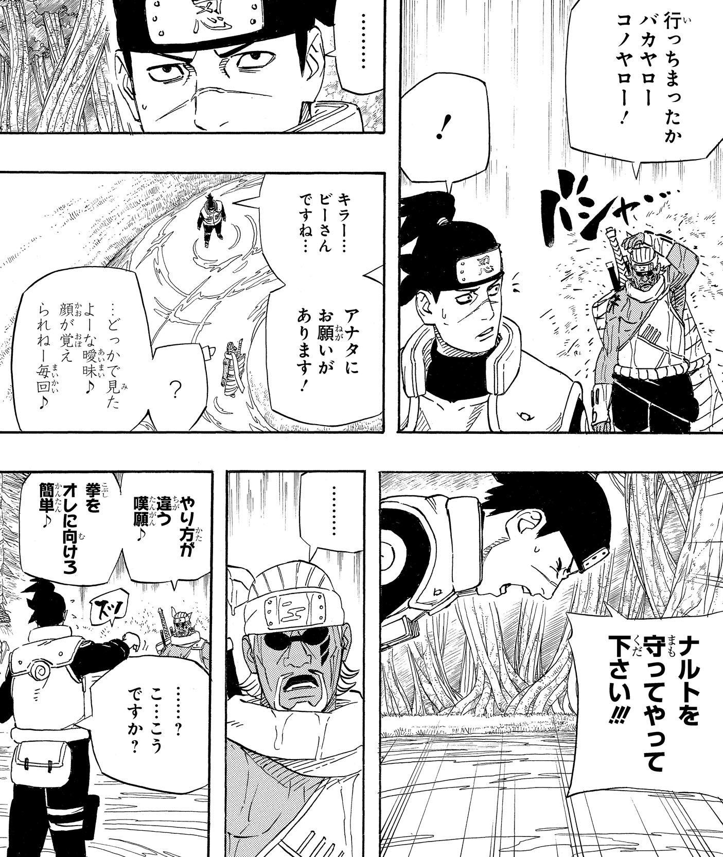 After seeing him off, Iruka entreats Killer Bee, the Eight Tails' Jinchuriki, to protect Naruto.