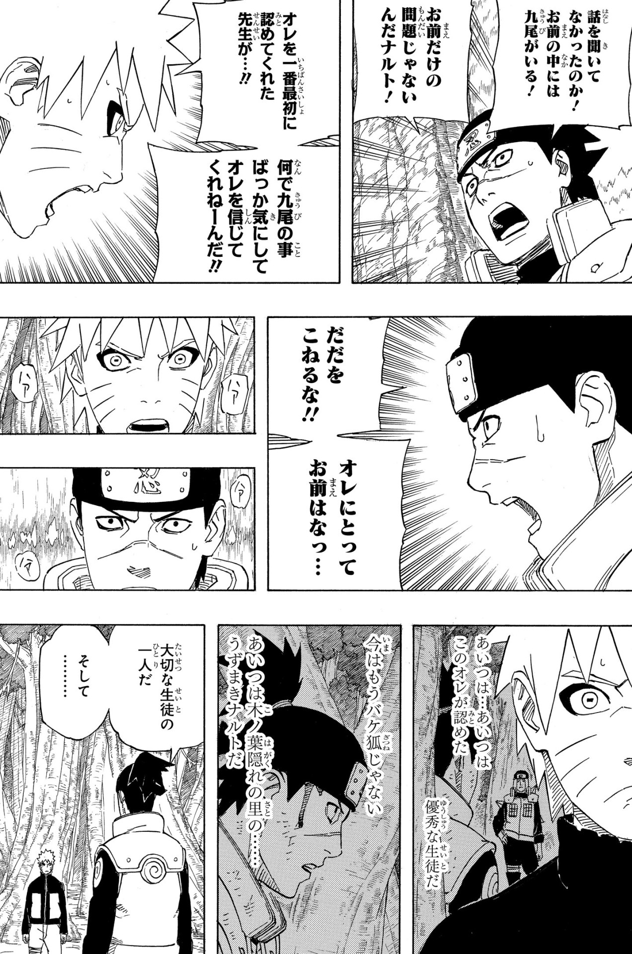 However, Naruto eventually realizes his friends are all fighting and attempts to leave to join them on the battlefield. Iruka and the ninja from Konoha move to stop him, having accompanied him to the island for this very purpose.