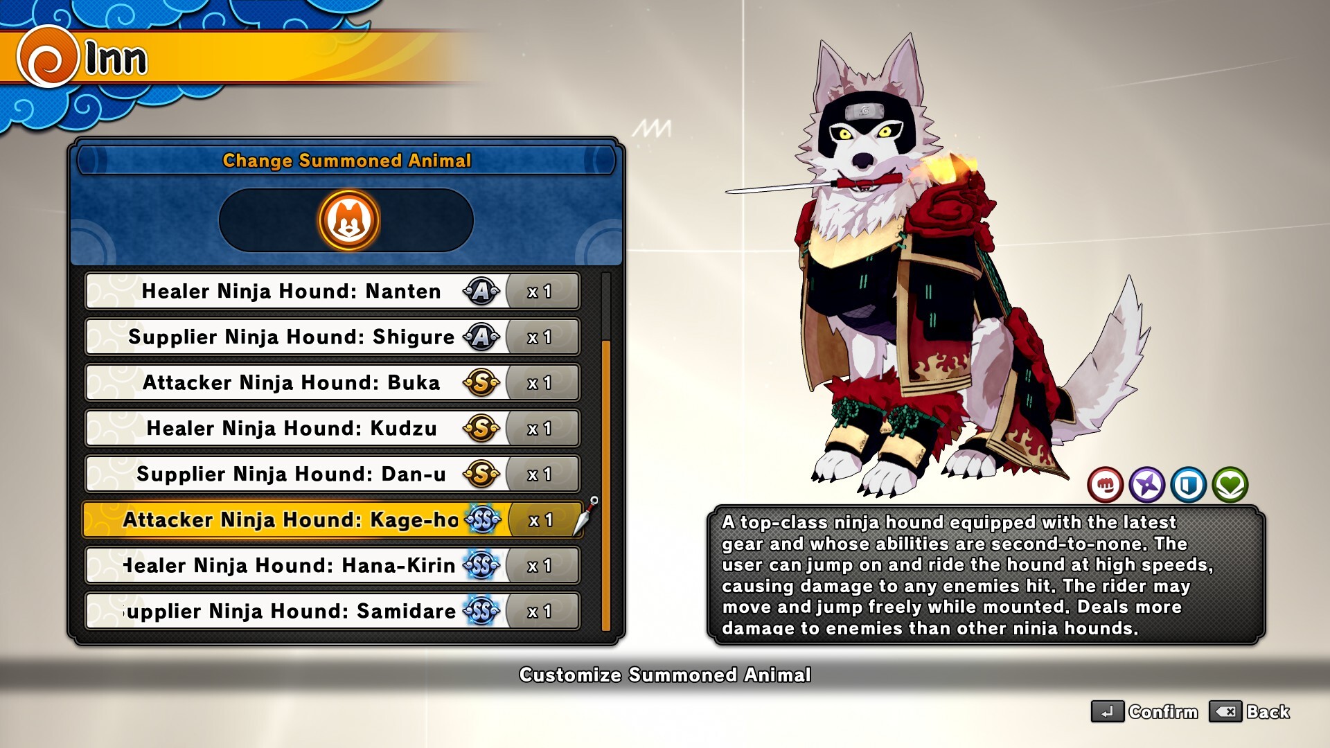 However you'll be stuck in place for a little while when calling the Ninja Hound, and the Ninja Hound will retreat if it's hit with an attack while running, making it hard to rely on them to escape a tricky situation. We recommend calling your Ninja Hound when your enemy lets their guard down, or when you aren't being focused on by your foes!