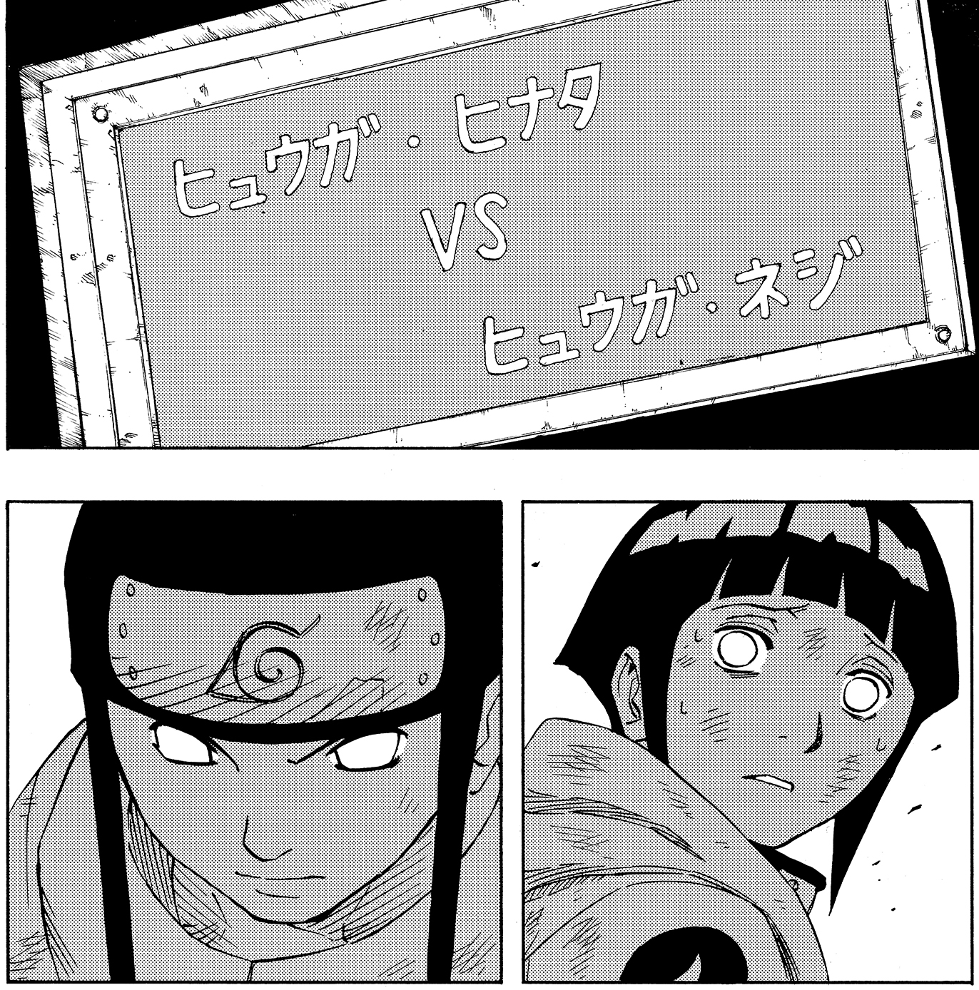 His opponent in the preliminaries for the third round of the Chunin Exam is his cousin Hinata, heiress of the main branch.